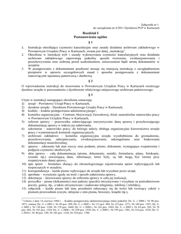 Załącznik nr 1 do zarządzenia nr 4/2011 Dyrektora PUP w Kartuzach Rozdział I Postanowienia ogólne §1 1. 2. 3. Instrukcja określająca czynności kancelaryjne oraz zasady działania archiwum zakładowego w Powiatowym Urzędzie Pracy w Kartuzach, zwana jest dalej „instrukcją”. Określone w instrukcji tryb i zasady wykonywania czynności kancelaryjnych oraz działania archiwum zakładowego zapewniają jednolity sposób tworzenia, ewidencjonowania i przechowywania oraz ochronę przed uszkodzeniem, zniszczeniem bądź utratą dokumentów w urzędzie. W postępowaniu z dokumentami poufnymi stosuje się niniejszą instrukcję z uwzględnieniem przepisów w sprawie szczegółowych zasad i sposobu postępowania z dokumentami stanowiącymi tajemnicę państwową i służbową. §2 O wprowadzeniu instrukcji do stosowania w Powiatowym Urzędzie Pracy w Kartuzach rozstrzyga dyrektor urzędu w porozumieniu z dyrektorem właściwego miejscowego archiwum państwowego. §3 Użyte w instrukcji następujące określenia oznaczają: 1) urząd – Powiatowy Urząd Pracy w Kartuzach, 2) dyrektor urzędu – Dyrektora Powiatowego Urzędu Pracy w Kartuzach, 3) kodeks – kodeks postępowania administracyjnego1, 4) komórka organizacyjna – Centrum Aktywizacji Zawodowej, dział, samodzielne stanowisko pracy w Powiatowym Urzędzie Pracy w Kartuzach, 5) referent sprawy – pracownika załatwiającego merytorycznie daną sprawę i przechowującego dokumentację sprawy w trakcie jej załatwiania, 6) sekretariat – stanowisko pracy, do którego należy obsługa organizacyjna kierownictwa urzędu pracy i wymienionych komórek organizacyjnych, 7) archiwum zakładowe – komórka organizacyjna urzędu wyodrębniona do gromadzenia, przechowywania, zabezpieczania, ewidencjonowania, udostępniania oraz brakowania dokumentacji niearchiwalnej, 8) sprawa – zdarzenie lub stan rzeczy oraz podanie, pismo, dokument, wymagające rozpatrzenia i podjęcia czynności służbowych, 9) akta sprawy – całą dokumentację (pisma, dokumenty, notatki, formularze, plany, fotokopie, rysunki itp.) zawierającą dane, informacje, które były, są lub mogą być istotne przy rozpatrywaniu danej sprawy, 10) spis spraw – formularz służący do chronologicznego rejestrowania spraw wpływających lub rozpoczętych w urzędzie, 11) korespondencja – każde pismo wpływające do urzędu lub wysyłane przez urząd, 12) aprobata – wyrażenie zgody na treść i sposób załatwienia sprawy, 13) dekretacja – skierowanie sprawy do referenta sprawy w celu jej realizacji, 14) przesyłka – pisma (dokumenty) oraz pakiety (paczki) otrzymywane i wysyłane za pośrednictwem poczty, gońca, itp., a także otrzymywane i nadawane telegramy, telefony i telefaksy, 15) załącznik – każde pismo lub inny przedmiot odnoszący się do treści lub tworzący całość z pismem przewodnim (zszyte, sklejone z nim pisma, broszury, książki itp.), 1 Ustawa z dnia 14 czerwca 1960 r. – Kodeks postępowania administracyjnego (tekst jednolity Dz. U. z 2000 r. Nr 98 poz. 1071; zmiany Dz. U. z 2001 r. Nr 49 poz. 509; Dz. U. z 2002 r. Nr 113 poz. 984, Nr 153 poz. 1271, Nr 169 poz. 1387; Dz. U. z 2003 r. Nr 130 poz. 1188, Nr 170 poz. 1660; Dz. U. z 2004 r. Nr 162 poz. 1692; Dz. U. z 2005 r. Nr 64 poz. 565, Nr 78 poz. 682, Nr 181 poz. 1524; Dz. U. z 2008 r. Nr 229 poz. 1539; Dz. U. z 2009 r. Nr 195 poz. 1501, Nr 216 poz. 1676; Dz. U. z 2010 r. Nr 40 poz. 230, Nr 182 poz. 1228, Nr 254 poz. 1700 16) dokument – akt mający znaczenie dowodu, ustanawiający uprawnienie lub stwierdzający prawdziwość określonych w nim zdarzeń bądź danych, 17) pieczęć urzędowa – pieczęć okrągłą z wizerunkiem orła pośrodku i nazwą w otoku, 18) pieczęć – pieczęcie nagłówkowe, imienne do podpisu itp., 19) znak akt – zespół symboli określających przynależność sprawy do określonej komórki organizacyjnej i do określonej grupy rzeczowego wykazu akt, 20) znak sprawy – zespół symboli określających przynależność sprawy do określonej komórki organizacyjnej i określonej grupy spraw, 21) nośnik papierowy – arkusz papieru zgodny z Polskimi Normami, na którym umieszczona jest treść dokumentu, pisma itp., 22) nośnik informatyczny – płytę CD, taśmę magnetyczną lub inny nośnik, na którym zapisano w formie elektronicznej treść dokumentu, pisma itp., 23) teczka aktowa (spraw) – teczkę wiązaną, skoroszyt, segregator itp., służące do przechowywania jednorodnych lub rzeczowo pokrewnych akt spraw ostatecznie załatwionych, objętych tą samą grupą akt ustaloną wykazem akt i stanowiącą przeważnie odrębną jednostkę archiwalną, 24) czystopis – tekst dokumentu lub pisma urzędowego w postaci ostatecznej przygotowanej do podpisu przez wystawcę, 25) wykaz akt – wykaz haseł rzeczowych oznaczonych symbolami klasyfikacyjnymi i kwalifikacją archiwalną akt, 26) regulamin organizacyjny – regulamin organizacyjny Powiatowego Urzędu Pracy w Kartuzach. §4 Symbole komórek organizacyjnych w Powiatowym Urzędzie Pracy w Kartuzach stosowane w całym obiegu dokumentów są następujące: D – Dyrektor PUP DZ – Zastępca Dyrektora PUP CAZ – Centrum Aktywizacji Zawodowej, ES – Dział Ewidencji i Świadczeń oraz Informacji FK – Dział Finansowo- Księgowy OR- Dział Organizacyjno- Administracyjny PP – Dział Pośrednictwa i Poradnictwa RP – Dział Rynku Pracy §5 Przyjęty system kancelaryjny 1. 2. 3. 4. 5. Korespondencja wpływająca do sekretariatu rejestrowana jest w systemie dziennikowym- w dzienniku korespondencyjnym. W komórkach organizacyjnych urzędu obowiązuje bezdziennikowy system kancelaryjny oparty na jednolitym rzeczowym wykazie akt. Wykaz akt stanowi jednolitą, rzeczową, niezależną od struktury organizacyjnej urzędu, klasyfikację akt powstających w toku działalności urzędu oraz zawiera ich kwalifikację archiwalną. Obejmuje on wszystkie zagadnienia z zakresu działalności urzędu oz
