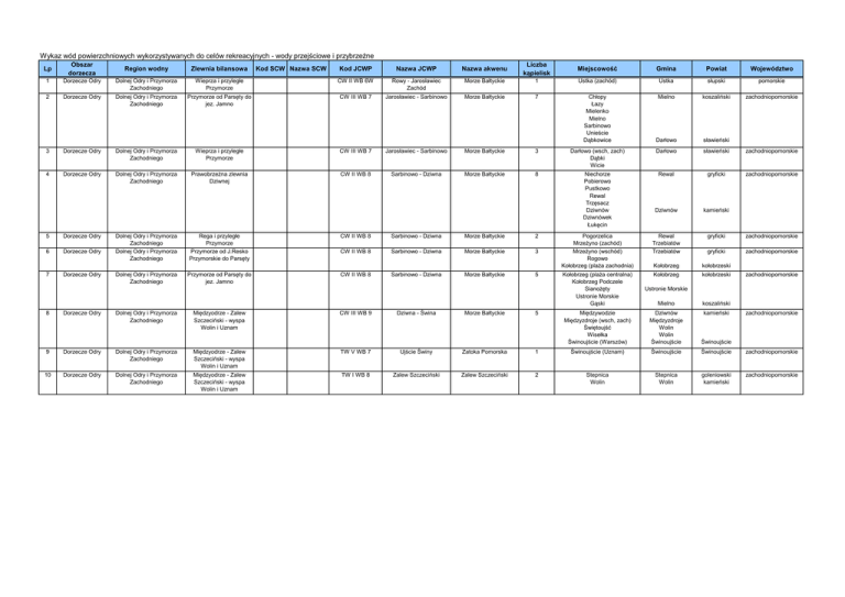 Wykaz wód powierzchniowych wykorzystywanych do celów rekreacyjnych - wody przejściowe i przybrzeżne Lp Obszar dorzecza Kod JCWP Nazwa JCWP Nazwa akwenu Liczba kąpielisk Miejscowość Gmina Powiat Województwo 1 Wieprza i przyległe Przymorze CW II WB 6W Rowy - Jarosławiec Zachód Morze Bałtyckie 1 Ustka (zachód) Ustka słupski pomorskie Dolnej Odry i Przymorza Zachodniego Przymorze od Parsęty do jez. Jamno CW III WB 7 Jarosławiec - Sarbinowo Morze Bałtyckie 7 Chłopy Łazy Mielenko Mielno Sarbinowo Unieście Dąbkowice Mielno koszaliński zachodniopomorskie Darłowo sławieński Dorzecze Odry Dolnej Odry i Przymorza Zachodniego Wieprza i przyległe Przymorze CW III WB 7 Jarosławiec - Sarbinowo Morze Bałtyckie 3 Darłowo (wsch, zach) Dąbki Wicie Darłowo sławieński zachodniopomorskie Dorzecze Odry Dolnej Odry i Przymorza Zachodniego Prawobrzeżna zlewnia Dziwnej CW II WB 8 Sarbinowo - Dziwna Morze Bałtyckie 8 Niechorze Pobierowo Pustkowo Rewal Trzęsacz Dziwnów Dziwnówek Łukęcin Rewal gryficki zachodniopomorskie Dziwnów kamieński Pogorzelica Mrzeżyno (zachód) Mrzeżyno (wschód) Rogowo Kołobrzeg (plaża zachodnia) Rewal Trzebiatów Trzebiatów gryficki zachodniopomorskie gryficki zachodniopomorskie Kołobrzeg kołobrzeski Kołobrzeg (plaża centralna) Kołobrzeg Podczele Sianożęty Ustronie Morskie Gąski Kołobrzeg kołobrzeski Ustronie Morskie Mielno koszaliński kamieński Region wodny Zlewnia bilansowa Dorzecze Odry Dolnej Odry i Przymorza Zachodniego 2 Dorzecze Odry 3 4 5 Dorzecze Odry 6 Dorzecze Odry 7 Dorzecze Odry Kod SCW Nazwa SCW Dolnej Odry i Przymorza Zachodniego Dolnej Odry i Przymorza Zachodniego Rega i przyległe Przymorze Przymorze od J.Resko Przymorskie do Parsęty CW II WB 8 Sarbinowo - Dziwna Morze Bałtyckie 2 CW II WB 8 Sarbinowo - Dziwna Morze Bałtyckie 3 Dolnej Odry i Przymorza Zachodniego Przymorze od Parsęty do jez. Jamno CW II WB 8 Sarbinowo - Dziwna Morze Bałtyckie 5 zachodniopomorskie 8 Dorzecze Odry Dolnej Odry i Przymorza Zachodniego Międzyodrze - Zalew Szczeciński - wyspa Wolin i Uznam CW III WB 9 Dziwna - Świna Morze Bałtyckie 5 Międzywodzie Międzyzdroje (wsch, zach) Świętoujść Wisełka Świnoujście (Warszów) Dziwnów Międzyzdroje Wolin Wolin Świnoujście Świnoujście 9 Dorzecze Odry Dolnej Odry i Przymorza Zachodniego Międzyodrze - Zalew Szczeciński - wyspa Wolin i Uznam TW V WB 7 Ujście Świny Zatoka Pomorska 1 Świnoujście (Uznam) Świnoujście Świnoujście zachodniopomorskie 10 Dorzecze Odry Dolnej Odry i Przymorza Zachodniego Międzyodrze - Zalew Szczeciński - wyspa Wolin i Uznam TW I WB 8 Zalew Szczeciński Zalew Szczeciński 2 Stepnica Wolin Stepnica Wolin goleniowski kamieński zachodniopomorskie zachodniopomorskie