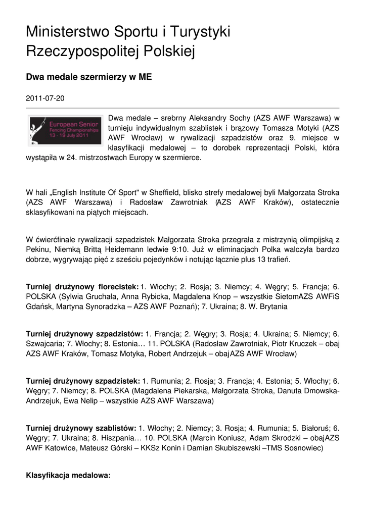 Ministerstwo Sportu i Turystyki Rzeczypospolitej Polskiej Dwa medale szermierzy w ME 2011-07-20 Dwa medale – srebrny Aleksandry Sochy (AZS AWF Warszawa) w turnieju indywidualnym szablistek i brązowy Tomasza Motyki (AZS AWF Wrocław) w rywalizacji szpadzistów oraz 9. miejsce w klasyfikacji medalowej – to dorobek reprezentacji Polski, która wystąpiła w 24. mistrzostwach Europy w szermierce. W hali „English Institute Of Sport" w Sheffield, blisko strefy medalowej byli Małgorzata Stroka (AZS AWF Warszawa) i Radosław Zawrotniak (AZS AWF Kraków), ostatecznie sklasyfikowani na piątych miejscach. W ćwierćfinale rywalizacji szpadzistek Małgorzata Stroka przegrała z mistrzynią olimpijską z Pekinu, Niemką Brittą Heidemann ledwie 9:10. Już w eliminacjach Polka walczyła bardzo dobrze, wygrywając pięć z sześciu pojedynków i notując łącznie plus 13 trafień. Turniej drużynowy florecistek: 1. Włochy; 2. Rosja; 3. Niemcy; 4. Węgry; 5. Francja; 6. POLSKA (Sylwia Gruchała, Anna Rybicka, Magdalena Knop – wszystkie SietomAZS AWFiS Gdańsk, Martyna Synoradzka – AZS AWF Poznań); 7. Ukraina; 8. W. Brytania Turniej drużynowy szpadzistów: 1. Francja; 2. Węgry; 3. Rosja; 4. Ukraina; 5. Niemcy; 6. Szwajcaria; 7. Włochy; 8. Estonia… 11. POLSKA (Radosław Zawrotniak, Piotr Kruczek – obaj AZS AWF Kraków, Tomasz Motyka, Robert Andrzejuk – obaj AZS AWF Wrocław) Turniej drużynowy szpadzistek: 1. Rumunia; 2. Rosja; 3. Francja; 4. Estonia; 5. Włochy; 6. Węgry; 7. Niemcy; 8. POLSKA (Magdalena Piekarska, Małgorzata Stroka, Danuta DmowskaAndrzejuk, Ewa Nelip – wszystkie AZS AWF Warszawa) Turniej drużynowy szablistów: 1. Włochy; 2. Niemcy; 3. Rosja; 4. Rumunia; 5. Białoruś; 6. Węgry; 7. Ukraina; 8. Hiszpania… 10. POLSKA (Marcin Koniusz, Adam Skrodzki – obaj AZS AWF Katowice, Mateusz Górski – KKSz Konin i Damian Skubiszewski –TMS Sosnowiec) Klasyfikacja medalowa: 1. Włochy 6 złotych – 2 srebrne – 2 brązowe;RAZEM: 10 2. Rosja 1 złoty – 2 srebrny – 7 brązowych;RAZEM: 10 3. Niemcy 1 złoty – 2 srebrny – 2 brązowe;RAZEM: 5 4. Francja 1 złoty – 2 srebrne – 1 brązowych;RAZEM: 4 5. Ukraina 1 złoty – 1 srebrny – 1 brązowy;RAZEM: 3 6. Rumunia 1 złoty – 0 srebrnych – 1 brązowy;RAZEM: 2 Szwajcaria 1 złoty – 0 srebrnych – 1 brązowy; RAZEM: 2 8. Węgry 0 złotych; 1 srebrny – 2 brązowe;RAZEM: 3 9. POLSKA 0 złotych; 1 srebrny – 1 brązowy; RAZEM: 2 10. Holandia 0 złotych; 1 srebrny – 0 brązowych;RAZEM: 1 W odbywających się jednocześnie mistrzostwach Europy w szermierce na wózkach, reprezentanci Polski wywalczyli osiem medali – dwa srebrne i sześć brązowych. Srebrne medale – szpada kobiet – Marta Makowska; szabliści drużynowo – Stefan Makowski, Radosław Stańczuk, Grzegorz Pluta, Zbigniew Wyganowski Brązowe medale – szpada kobiet – Marta Fidrych; szabla kobiet – Marta Fidrych i Renata Burdon; szpada mężczyzn – Dariusz Pender; szabla mężczyzn – Grzegorz Pluta; szpadziści drużynowo – Dariusz Pender, Radosław Stańczuk, Grzegorz Pluta, Norbert Całka Klasyfikacja medalowa: 1. Węgry 7 złotych – 1 srebrny – 1 brązowy:RAZEM: 9 2. Francja 4 złote – 6 srebrnych – 2 brązowe:RAZEM: 12 3. Rosja 4 złote – 4 srebrne – 11 brązowych: RAZEM: 19 4. Ukraina 2 złote – 2 srebrne – 3 brązowe:RAZEM: 7 5. Białoruś 1 złoty – 0 srebrnych – 1 brązowy: RAZEM: 2 6. Włochy 0 złotych – 4 srebrne – 2 brązowe:RAZEM: 6 7. POLSKA 0 złotych – 2 srebrne – 6 brązowych: RAZEM: 8 8. Niemcy 0 złotych – 0 srebrnych – 2 brązowe:RAZEM: 2