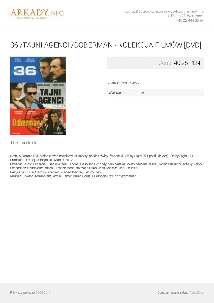 Dobra28 sp zoo. księgarnia wysyłkowa arkady.info ul. Dobra 28, Warszawa +48 22 444 86 97 36 /TAJNI AGENCI /DOBERMAN - KOLEKCJA FILMÓW [DVD] Cena: 40,95 PLN Opis słownikowy Wydawca Inne Opis produktu Nośnik/Format: DVD Video (liczba nośników: 3) Napisy: polski Dźwięk: francuski - Dolby Digital 5.1 polski (lektor) - Dolby Digital 5.1 Produkcja: Francja, Hiszpania, Włochy, 2012 Obsada: Gerard Depardieu, Daniel Auteuil, André Dussollier, Roschdy Zem, Valeria Golino, Vincent Cassel, Monica Bellucci, Tcheky Karyo Scenariusz: Dominique Loiseau, Franck Mancuso, Yann Brion, Jean Cosmos, Joel Houssin Reżyseria: Olivier Marchal, Frederic Schoendoerffer, Jan Kounen Muzyka: Erwann Kermorvant , Axelle Renoir, Bruno Coulais, François Roy , Schyzomaniac Plik wygenerowano: 02-03-2017 Powered by TCPDF (www.tcpdf.org) Oprogramowanie sklepu: AptusShop