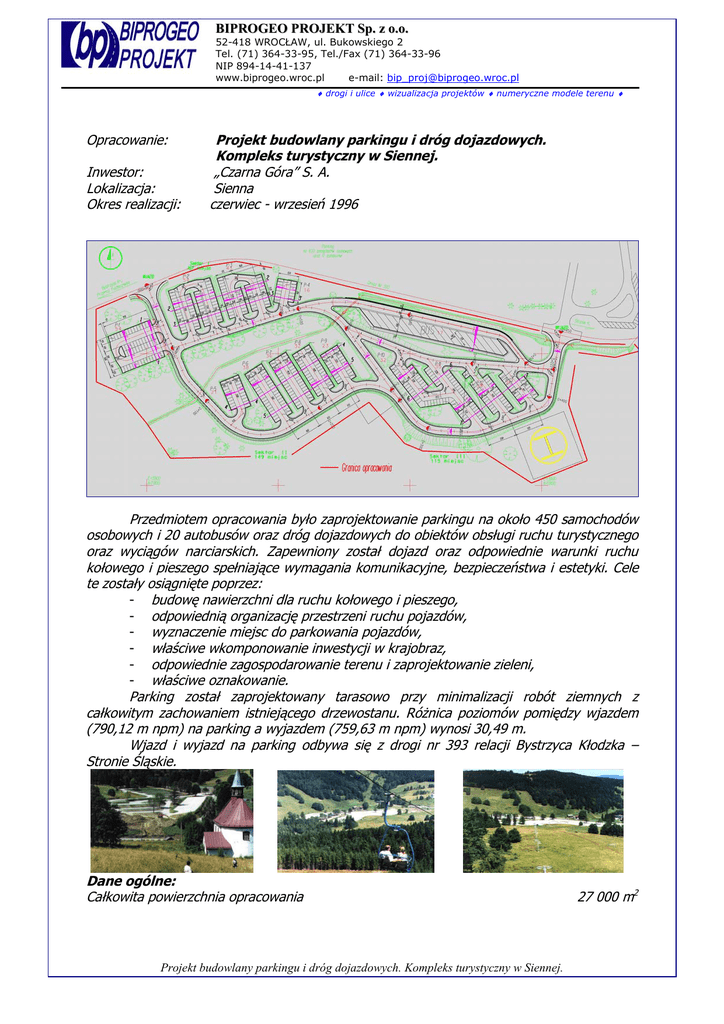 BIPROGEO PROJEKT Sp. z o.o. 52-418 WROCŁAW, ul. Bukowskiego 2 Tel. (71) 364-33-95, Tel./Fax (71) 364-33-96 NIP 894-14-41-137 www.biprogeo.wroc.pl e-mail: [email protected] ¨ drogi i ulice ¨ wizualizacja projektów ¨ numeryczne modele terenu ¨ Opracowanie: Inwestor: Lokalizacja: Okres realizacji: Projekt budowlany parkingu i dróg dojazdowych. Kompleks turystyczny w Siennej. „Czarna Góra” S. A. Sienna czerwiec - wrzesień 1996 Przedmiotem opracowania było zaprojektowanie parkingu na około 450 samochodów osobowych i 20 autobusów oraz dróg dojazdowych do obiektów obsługi ruchu turystycznego oraz wyciągów narciarskich. Zapewniony został dojazd oraz odpowiednie warunki ruchu kołowego i pieszego spełniające wymagania komunikacyjne, bezpieczeństwa i estetyki. Cele te zostały osiągnięte poprzez: - budowę nawierzchni dla ruchu kołowego i pieszego, - odpowiednią organizację przestrzeni ruchu pojazdów, - wyznaczenie miejsc do parkowania pojazdów, - właściwe wkomponowanie inwestycji w krajobraz, - odpowiednie zagospodarowanie terenu i zaprojektowanie zieleni, - właściwe oznakowanie. Parking został zaprojektowany tarasowo przy minimalizacji robót ziemnych z całkowitym zachowaniem istniejącego drzewostanu. Różnica poziomów pomiędzy wjazdem (790,12 m npm) na parking a wyjazdem (759,63 m npm) wynosi 30,49 m. Wjazd i wyjazd na parking odbywa się z drogi nr 393 relacji Bystrzyca Kłodzka – Stronie Śląskie. Dane ogólne: Całkowita powierzchnia opracowania Projekt budowlany parkingu i dróg dojazdowych. Kompleks turystyczny w Siennej. 27 000 m2