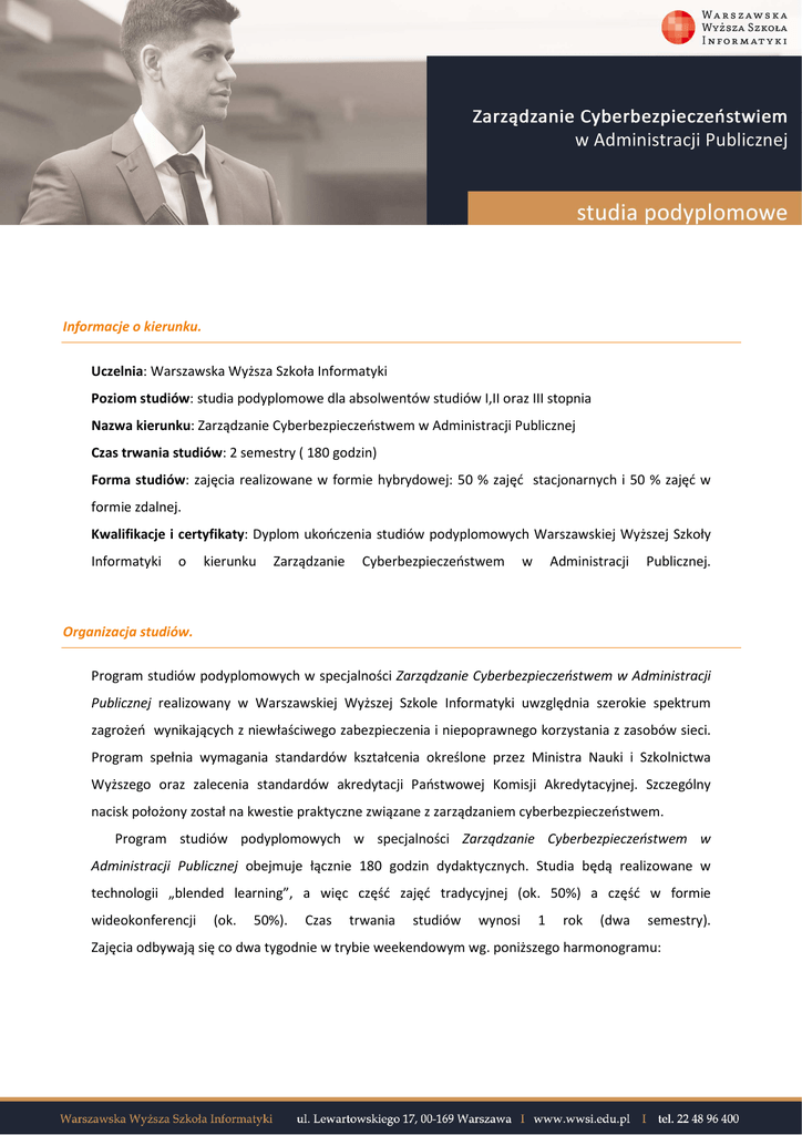 Informacje o kierunku. Uczelnia: Warszawska Wyższa Szkoła Informatyki Poziom studiów: studia podyplomowe dla absolwentów studiów I,II oraz III stopnia Nazwa kierunku: Zarządzanie Cyberbezpieczeństwem w Administracji Publicznej Czas trwania studiów: 2 semestry ( 180 godzin) Forma studiów: zajęcia realizowane w formie hybrydowej: 50 % zajęć stacjonarnych i 50 % zajęć w formie zdalnej. Kwalifikacje i certyfikaty: Dyplom ukończenia studiów podyplomowych Warszawskiej Wyższej Szkoły Informatyki o kierunku Zarządzanie Cyberbezpieczeństwem w Administracji Publicznej. Organizacja studiów. Program studiów podyplomowych w specjalności Zarządzanie Cyberbezpieczeństwem w Administracji Publicznej realizowany w Warszawskiej Wyższej Szkole Informatyki uwzględnia szerokie spektrum zagrożeń wynikających z niewłaściwego zabezpieczenia i niepoprawnego korzystania z zasobów sieci. Program spełnia wymagania standardów kształcenia określone przez Ministra Nauki i Szkolnictwa Wyższego oraz zalecenia standardów akredytacji Państwowej Komisji Akredytacyjnej. Szczególny nacisk położony został na kwestie praktyczne związane z zarządzaniem cyberbezpieczeństwem. Program studiów podyplomowych w specjalności Zarządzanie Cyberbezpieczeństwem w Administracji Publicznej obejmuje łącznie 180 godzin dydaktycznych. Studia będą realizowane w technologii „blended learning”, a więc część zajęć tradycyjnej (ok. 50%) a część w formie wideokonferencji (ok. 50%). Czas trwania studiów wynosi 1 rok (dwa semestry). Zajęcia odbywają się co dwa tygodnie w trybie weekendowym wg. poniższego harmonogramu: zjazd numer: 1 2 3 4 5 6 7 8 9 10 11 12 tryb zajęć: stacjonarny widekonferencyjny stacjonarny widekonferencyjny stacjonarny widekonferencyjny widekonferencyjny stacjonarny widekonferencyjny stacjonarny widekonferencyjny stacjonarny Metodyka kształcenia: Zajęcia na studiach podyplomowych w specjalności Zarządzanie Cyberbezpieczeństwem w Administracji Publicznej prowadzone są w większości w postaci warsztatów, podczas których słuchacze rozwiązują studia przypadków opracowane przez wykładowcę na podstawie rzeczywistych incydentów. Dominuje dyskusja oraz wymiana doświadczeń, zajęcia prowadzą m.in praktycy branży bezpieczeństwa teleinformatycznego . Ramowy program studiów. Poniższy program powstał we współpracy Warszawskiej Wyższej Szkoły Informatyki, Akademii Obrony Narodowej oraz Naukowej i Akademickiej Sieci Komputerowej. Lp. Nazwa przedmiotu 1. Aspekty bezpieczeństwa sieci i informacji wynikające z uregulowań prawnych i dokumentów programowych UE oraz krajowych. Zagadnienia 1. Wprowadzenie do zagadnienia – podejście UE do tematyki cyberbezpieczeństwa 2. Relewantne typy dokumentów na poziomie UE: komunikaty, strategie, dyrektywy, rozporządzenia 3. Omówienie najważniejszych dokumentów definiujących zagadnienia bezpieczeństwa sieci i informacji w UE (min. strategia cyberbezpieczeństwa, dyrektywa NIS, rozporządzenie e-IDAS) 4. Regulacje europejskie w obszarze cyberbezpieczeństwa a stan uregulowań na poziomie krajowym 5. Omówienie aspektów krajowego bezpieczeństwa w kontekście istniejących i powstających dokumentów programowych (min. doktryna cyberbezpieczeństwa, strategia bezpieczeństwa Liczba godzin 6 cyberprzestrzeni i inne) 2. Elementy strategii bezpieczeństwa cyberprzestrzeni na poziomie krajowym 1. Krajowa strategia bezpieczeństwa cyberprzestrzeni jako kluczowy element systemu ochrony w państwie 6 2. Odniesienie do strategii UE 3. Przykłady strategii istniejących w innych krajach (głównie UE) 4. Omówienie pożądanych elementów, które powinny się znajdować w strategii 5. Analiza ( z udziałem słuchaczy) sposobu uwzględnienia kluczowych elementów strategii w istniejących, strategicznych dokumentach krajowych 3. Podstawy analizy systemowej i inżynierii bezpieczeństwa systemów informacyjnych państwa 1. Podstawy badań systemowych. Geneza i rozwój modeli i metod systemowych na potrzeby bezpieczeństwa państwa 10 2. Systemowe ujęcie struktur administracyjnych. 3. Badania systemowe na potrzeby bezpieczeństwa narodowego i obronności. Technologie podwójnego zastosowania. 4. Geneza i rozwój analizy systemowej na potrzeby zarządzania bezpieczeństwem państw. Doświadczenia RAND. 5. Analiza systemowa na potrzeby inżynierii bezpieczeństwa systemów informacyjnych. 6.Cyberprzestrzeń w ujęciu systemowym. 7. Modelowanie systemowe. Modele systemów informacyjnych. Wartościowanie informacji w zarządzaniu cyberbezpieczeństwem. 4. Zarządzanie bezpieczeństwem informacji w administracji państwowej i samorządowej 1. Podstawowe pojęcia bezpieczeństwa informacji (pojęcie informacji, rola i znaczenie informacji w organizacji, piramida informacji, kryteria klasyfikacji informacji, podstawowe atrybuty bezpieczeństwa informacji, polityka bezpieczeństwa informacji, model PDCA). 2. Standardy i normy w bezpieczeństwie informacji. (pojęcie standardu, standardy mające charakter ustaw, standardy o charakterze norm krajowych i międzynarodowych, standardy o charakterze najlepszych praktyk stowarzyszeniowych. 3. Identyfikowanie i wartościowanie aktywów organi-zacji (aktywa podstawowe, aktywa wspierające, wartościowanie aktywów, szacowanie skutków). 4. Zapewnienie ochrony danych osobowych i informacji niejawnych (definicje i podstawowe pojęcia, zakres stosowania ustaw, przypadki szczególne, zadania obowiązki służb ds. 10 bezpieczeństwa informacji, stosowanie ustawy w organizacji, zabezpieczenia, polityka ubezpieczeństwa danych osobowych i instrukcja przetwarzania, typowe problemy organizacji). 5. Zarządzanie ryzykiem zagrożeń bezpieczeństwa organizacji i instytucji 1. Koncepcja ryzyka i struktura zarządzania ryzykiem. Taksonomia ryzyka. 18 2. Analiza pojęć podstawowych – zagrożenie, ryzyko, niepewność, bezpieczeństwo, zarządzanie ryzykiem. 3. Niepewność i ryzyko. Rodza