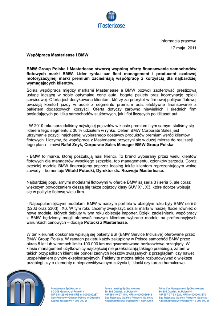 Informacja prasowa 17 maja 2011 Współpraca Masterlease i BMW BMW Group Polska i Masterlease stworzą wspólną ofertę finansowania samochodów flotowych marki BMW. Lider rynku car fleet management i producent czołowej motoryzacyjnej marki premium zacieśniają współpracę z korzyścią dla najbardziej wymagających klientów. Ścisła współpraca między markami Masterlease a BMW pozwoli zaoferować prestiŜową usługę łączącą w sobie optymalną cenę auta, bogate pakiety oraz koordynację opieki serwisowej. Oferta jest dedykowana klientom, którzy za priorytet w firmowej polityce flotowej uwaŜają komfort jazdy w aucie z segmentu premium oraz efektywne finansowanie z pakietem dodatkowych korzyści. Oferta dotyczy zarówno niewielkich i średnich firm posiadających po kilka samochodów słuŜbowych, jak i flot liczących po kilkaset aut. - W 2010 roku sprzedaliśmy najwięcej pojazdów w klasie premium i tym samym staliśmy się liderem tego segmentu z 30 % udziałem w rynku. Celem BMW Corporate Sales jest utrzymanie pozycji najchętniej wybieranego dostawcy produktów premium wśród klientów flotowych. Liczymy, Ŝe współpraca z Masterlease przyczyni się w duŜej mierze do realizacji tego planu – mówi Rafał Znyk, Corporate Sales Manager BMW Group Polska. - BMW to marka, której poszukują nasi klienci. To brand wybierany przez wielu klientów flotowych dla managerów wysokiego szczebla, top managementu, członków zarządu. Coraz częściej modele BMW finansujemy poprzez leasing takŜe klientom reprezentującym wolne zawody – komentuje Witold Potocki, Dyrektor ds. Rozwoju Masterlease. Najbardziej popularnymi modelami flotowymi w ofercie BMW są seria 3 i seria 5, ale coraz większym powodzeniem cieszą się takŜe pojazdy klasy SUV X1, X3, które dobrze wpisują się w politykę flotową wielu firm. - Najpopularniejszymi modelami BMW w naszym portfelu w ubiegłym roku były BMW serii 5 (520d oraz 530d) i X6. W tym roku chcemy zwiększyć udział marki w naszej flocie równieŜ o nowe modele, których debiuty w tym roku obiecuje importer. Dzięki zacieśnieniu współpracy z BMW będziemy mogli oferować naszym klientom wybrane modele na preferencyjnych warunkach cenowych – dodaje Potocki z Masterlease. W ten kierunek doskonale wpisują się pakiety BSI (BMW Service Inclusive) oferowane przez BMW Group Polska. W ramach pakietu kaŜdy zakupiony w Polsce samochód BMW przez okres 5 lat lub w ramach limitu 100 000 km ma gwarantowane bezkosztowe przeglądy. W klasie management uŜytkownicy najczęściej nie przekraczają takiego przebiegu, zatem w takich przypadkach klient nie ponosi Ŝadnych kosztów związanych z przeglądami czy nawet uzupełnianiem płynów eksploatacyjnych. Pakiety te moŜna takŜe rozbudowywać o większe przebiegi czy o elementy o nieprzewidywalnym zuŜyciu tj. klocki czy tarcze hamulcowe. Masterlease Spółka z o. o. 80-308 Gdańsk, ul. Polanki 4 NIP 584-26-99-948 KRS nr 0000362287 Sąd Rejonowy Gdańsk-Północ w Gdańsku Kapitał zakładowy 7 905 000 zł Futura Leasing Spółka Akcyjna 80-308 Gdańsk, ul. Polanki 4 NIP 584-10-27-454, KRS nr 0000069348 Sąd Rejonowy Gdańsk-Północ w Gdańsku Kapitał zakładowy i wpłacony 1 689 320 zł Prime Car Management Spółka Akcyjna 80-308 Gdańsk, ul. Polanki 4 NIP 957-07-53-221, KRS nr 0000013870 Sąd Rejonowy Gdańsk-Północ w Gdańsku Kapitał zakładowy i wpłacony 15 999 500 zł O FIRMIE: Masterlease działa w Polsce od czerwca 2001 roku. Większościowym akcjonariuszem Masterlease Polska jest Abris Capital Partners, wiodąca firma zarządzająca funduszami private equity w Europie Centralnej i Wschodniej. Obecnie łączne kapitały własne Masterlease w Polsce to blisko 405 mln złotych, co oznacza, Ŝe Masterlease jest najwyŜej skapitalizowaną spółką FSL w naszym regionie Europy. Firma posiada flotę prawie 24 000 pojazdów. Jest liderem branŜy CFM z 15-procentowym udziałem w rynku. Masterlease oferuje usługi skierowane zarówno do przedsiębiorców, jak i klientów indywidualnych, nie prowadzących działalności gospodarczej. Masterlease w swojej centrali oraz 17 regionalnych biurach handlowych zatrudnia ponad 150 wykwalifikowanych pracowników. Kontakty dla mediów Agnieszka Łukomska Manager Ds. Projektów Marketingowych i PR Masterlease Tel (58) 340 44 88; tel. 510 032 149 e-mail: [email protected] Masterlease Spółka z o. o. 80-308 Gdańsk, ul. Polanki 4 NIP 584-26-99-948 KRS nr 0000362287 Sąd Rejonowy Gdańsk-Północ w Gdańsku Kapitał zakładowy 7 905 000 zł Futura Leasing Spółka Akcyjna 80-308 Gdańsk, ul. Polanki 4 NIP 584-10-27-454, KRS nr 0000069348 Sąd Rejonowy Gdańsk-Północ w Gdańsku Kapitał zakładowy i wpłacony 1 689 320 zł Prime Car Management Spółka Akcyjna 80-308 Gdańsk, ul. Polanki 4 NIP 957-07-53-221, KRS nr 0000013870 Sąd Rejonowy Gdańsk-Północ w Gdańsku Kapitał zakładowy i wpłacony 15 999 500 zł