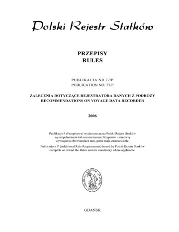 PRZEPISY RULES PUBLIKACJA NR 77/P PUBLICATION NO. 77/P ZALECENIA DOTYCZĄCE REJESTRATORA DANYCH Z PODRÓŻY RECOMMENDATIONS ON VOYAGE DATA RECORDER 2006 Publikacje P (Przepisowe) wydawane przez Polski Rejestr Statków są uzupełnieniem lub rozszerzeniem Przepisów i stanowią wymagania obowiązujące tam, gdzie mają zastosowanie. Publications P (Additional Rule Requirements) issued by Polski Rejestr Statków complete or extend the Rules and are mandatory where applicable. GDAŃSK PRZEPISY RULES PUBLIKACJA NR 77/P PUBLICATION NO. 77/P ZALECENIA DOTYCZĄCE REJESTRATORA DANYCH Z PODRÓŻY RECOMMENDATIONS ON VOYAGE DATA RECORDER 2006 GDAŃSK Publikacja Nr 77/P – Zalecenia dotyczące rejestratora danych z podróży, której podstawą jest Zalecenie IACS, (Rec.85, Jan 2005), stanowi rozszerzenie wymagań Części V – Urządzenia Nawigacyjne, Przepisów nadzoru konwencyjnego statków morskich. Publikacja ta została zatwierdzona przez Zarząd PRS S.A. w dniu 20 września 2006 r. i wchodzi w życie z dniem 20 października 2006 r. PRS Publication No. 77/P – Recommendations on Voyage Data Recorder, based on the IACS Recommendation 85 (Rec 85, Jan 2005), is an extension of the requirements contained in Part V – Navigation Equipment, of the Rules for the Statutory Survey the Seagoing Ships. This Publication was approved by the PRS S.A. Executive Board on 20 September 2006 and enters into force on 20 October 2006. © Copyright by Polski Rejestr Statków S.A., 2006 PRS/HW, 09/2006 ISBN 89-89895-51-X SPIS TREŚCI str. 1 Postanowienia ogólne .............................................................................................. 5 2 Uznanie typu ............................................................................................................. 5 3 Zatwierdzenie dokumentacji instalacyjnej ............................................................ 5 4 Nadzór nad instalacją VDR..................................................................................... 4.1 Próby VDR po zainstalowaniu na statku ........................................................ 4.2 Przegląd roczny VDR ..................................................................................... 5 5 6 5 Rozmieszczenie elementów VDR ............................................................................ 5.1 Obudowa ochronna ......................................................................................... 5.2 Mikrofony ....................................................................................................... 5.3 Urządzenie alarmowe...................................................................................... 5.4 Inne elementy VDR ........................................................................................ 7 7 7 7 7 6 Zasilanie .................................................................................................................... 7 7 Interfejsy dla czujników .......................................................................................... 8 8 Zakres rejestrowanych danych ............................................................................... 8.1 Data i czas....................................................................................................... 8.2 Pozycja statku ................................................................................................. 8.3 Prędkość statku ............................................................................................... 8.4 Kierunek.......................................................................................................... 8.5 Sygnały akustyczne na mostku ....................................................................... 8.6 Łączność głosowa ........................................................................................... 8.7 Dane radarowe ................................................................................................ 8.8 Echosonda....................................................................................................... 8.9 Alarmy ............................................................................................................ 8.10 Komendy dla steru i odczyt położenia steru ................................................... 8.11 Ustawienie i odczyt położenia telegrafu maszynowego ................................. 8.12 Status otworów w kadłubie............................................................................. 8.13 Status drzwi wodoszczelnych i pożarowych................................................... 8.14 Przyspieszenia i naprężenia kadłuba............................................................... 8.15 Prędkość i kierunek wiatru.............................................................................. 8.16 Informacje dodatkowe .................................................................................... 8 8 8 8 8 9 9 9 9 9 17 17 17 17 19 19 19 3 CONTENS Page 1 General provisions ................................................................................................... 23 2 Type approval........................................................................................................... 23 3 Approval of documents............................................................................................ 23 4 Survey........................................................................................................................ 23 4.1 Testing of a new installation ........................................................................... 23 4.2 Annual testing of VDR ................................................................................... 24 5 Location of the VDR components ........................................................................... 5.1 Protective capsule ........................................................................................... 5.2 Microphones ..................................