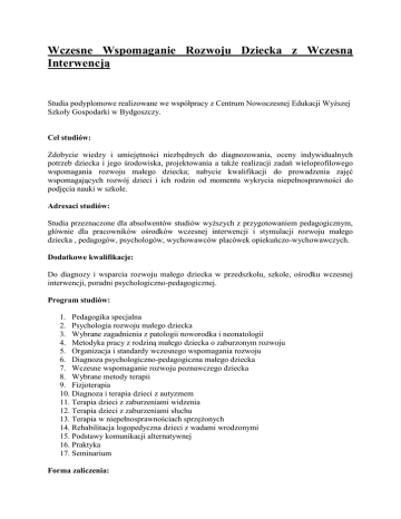Wczesne Wspomaganie Rozwoju Dziecka z Wczesną Interwencją Studia podyplomowe realizowane we współpracy z Centrum Nowoczesnej Edukacji Wyższej Szkoły Gospodarki w Bydgoszczy. Cel studiów: Zdobycie wiedzy i umiejętności niezbędnych do diagnozowania, oceny indywidualnych potrzeb dziecka i jego środowiska, projektowania a także realizacji zadań wieloprofilowego wspomagania rozwoju małego dziecka; nabycie kwalifikacji do prowadzenia zajęć wspomagających rozwój dzieci i ich rodzin od momentu wykrycia niepełnosprawności do podjęcia nauki w szkole. Adresaci studiów: Studia przeznaczone dla absolwentów studiów wyższych z przygotowaniem pedagogicznym, głównie dla pracowników ośrodków wczesnej interwencji i stymulacji rozwoju małego dziecka , pedagogów, psychologów, wychowawców placówek opiekuńczo-wychowawczych. Dodatkowe kwalifikacje: Do diagnozy i wsparcia rozwoju małego dziecka w przedszkolu, szkole, ośrodku wczesnej interwencji, poradni psychologiczno-pedagogicznej. Program studiów: 1. Pedagogika specjalna 2. Psychologia rozwoju małego dziecka 3. Wybrane zagadnienia z patologii noworodka i neonatologii 4. Metodyka pracy z rodziną małego dziecka o zaburzonym rozwoju 5. Organizacja i standardy wczesnego wspomagania rozwoju 6. Diagnoza psychologiczno-pedagogiczna małego dziecka 7. Wczesne wspomaganie rozwoju poznawczego dziecka 8. Wybrane metody terapii 9. Fizjoterapia 10. Diagnoza i terapia dzieci z autyzmem 11. Terapia dzieci z zaburzeniami widzenia 12. Terapia dzieci z zaburzeniami słuchu 13. Terapia w niepełnosprawnościach sprzężonych 14. Rehabilitacja logopedyczna dzieci z wadami wrodzonymi 15. Podstawy komunikacji alternatywnej 16. Praktyka 17. Seminarium Forma zaliczenia: Obecność na zajęciach, prace zaliczeniowe dotyczące objawów, diagnozy psychologicznopedagogicznej oraz działań terapeutycznych a także złożenie pracy dyplomowej. Czas trwania: 3 semestry Liczba godzin: 350 Cena: Kierunek studiów podyplomowych Wczesne Wspomaganie Rozwoju Dziecka z Wczesną Interwencją Cena promocyjna 2015: Opłata jednorazowa Opłata semestralna Opłata miesięczna ( 1 rata ) ( 2 raty ) ( 12 rat ) 3 400 zł 1 800 zł 320 zł 3 000 zł 1 600 zł 280 zł *20% zniżki dla studentów i absolwentów WSB i WSG