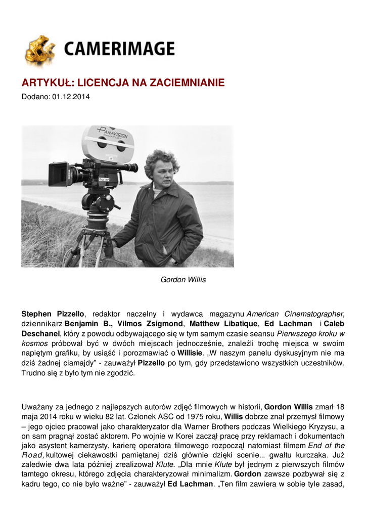 ARTYKUŁ: LICENCJA NA ZACIEMNIANIE Dodano: 01.12.2014 Gordon Willis Stephen Pizzello, redaktor naczelny i wydawca magazynu American Cinematographer, dziennikarz Benjamin B., Vilmos Zsigmond, Matthew Libatique, Ed Lachman i Caleb Deschanel, który z powodu odbywającego się w tym samym czasie seansu Pierwszego kroku w kosmos próbował być w dwóch miejscach jednocześnie, znaleźli trochę miejsca w swoim napiętym grafiku, by usiąść i porozmawiać o Willisie. „W naszym panelu dyskusyjnym nie ma dziś żadnej ciamajdy” - zauważył Pizzello po tym, gdy przedstawiono wszystkich uczestników. Trudno się z było tym nie zgodzić. Uważany za jednego z najlepszych autorów zdjęć filmowych w historii, Gordon Willis zmarł 18 maja 2014 roku w wieku 82 lat. Członek ASC od 1975 roku, Willis dobrze znał przemysł filmowy – jego ojciec pracował jako charakteryzator dla Warner Brothers podczas Wielkiego Kryzysu, a on sam pragnął zostać aktorem. Po wojnie w Korei zaczął pracę przy reklamach i dokumentach jako asystent kamerzysty, karierę operatora filmowego rozpoczął natomiast filmem End of the R oad, kultowej ciekawostki pamiętanej dziś głównie dzięki scenie... gwałtu kurczaka. Już zaledwie dwa lata później zrealizował Klute. „Dla mnie Klute był jednym z pierwszych filmów tamtego okresu, którego zdjęcia charakteryzował minimalizm. Gordon zawsze pozbywał się z kadru tego, co nie było ważne” - zauważył Ed Lachman. „Ten film zawiera w sobie tyle zasad, którymi się kierował, jak selektywne oświetlenie i coś, co określał mianem względności” - dodał Stephen Pizzello, który prawie ukończył pisanie poświęconej mu książki zatytułowanej po prostu Gordon Willis on Cinematography. „Rozumiał przez to wielkość różnych elementów wizualnych znajdujących się w kadrze, która okazywała się względna. Na początku filmu odnosi się wrażenie, że Klute zawsze „wisi” nad Jane Fondą blokując część kadru. Wydaje się potężny, a ona bezbronna – Gordon bawił się ich fizycznością, by podkreślić rolę, jaką odgrywają.” Gordon Willis i Francis Ford Coppola Kadr z filmu "Ojciec chrzestny" Klute był tylko pierwszym z długiej listy jego arcydzieł i mimo że Gordon Willis zdecydował się przejść na emeryturę dopiero w 1996, zawsze będzie kojarzony głównie z jedną dekadą, latami 70-tymi, kiedy to rozpoczął owocną współpracę z takimi reżyserami jak Alan Pakula, Francis Ford Coppola i Woody Allen, z którym zrealizował ostatecznie aż 8 filmów. Wśród jego najbardziej znanych tytułów znajdują się takie dzieła jak Ojciec chrzestny I i II, Syndykat zbrodni, Wszyscy ludzie prezydenta, Annie Hall oraz Manhattan. W okresie, gdy autorów zdjęć filmowych uważano raczej za techników, nie godził się na to, by pozostawać w cieniu i głośno wyrażał swoje opinie. Może właśnie dlatego tylko dwa razy nominowano go do Oscara i to nawet nie za filmy stanowiące jego największe osiągnięcia; Amerykańska Akademia Sztuki i Wiedzy Filmowej zauważyła tylko jego zdjęcia do komedii Zelig i... Ojca chrzestnego III. „Gordon lubił sobie wtedy wypić i był bardzo głośny, używał dość obraźliwego języka, zwłaszcza opisując kierowników studia i reżyserów nie mających pojęcia, co robią. Myślę, że ani razu nie zdarzyło się, żeby w barze nie podszedł do nas ktoś mówiąc: Przepraszam, tu są damy” - wspominał Caleb Deschanel, który jako student odbył u Willisa staż i wciąż uważa go za mentora. W 2009 Akademia naprawiła to szokujące niedopatrzenie i Gordon Willis otrzymał wreszcie honorowego Oscara. Najwyższy czas. Mimo burkliwego zachowania, z którego słynął, Willis na każdym kroku podkreślał, że nad filmami pracuje razem z reżyserami. „Gordy zawsze potrafił znaleźć wizualną metaforę służącą temu, by lepiej opowiedzieć historię i jest to coś, czego wszyscy powinniśmy się uczyć - obrazy nie służą tylko i wyłącznie reprezentacji. Kiedy analizował scenariusz z reżyserem, zawsze miał zdanie na temat tego, gdzie postawić kamerę i co powinna, a czego nie powinna widzieć.” Nie oznacza to jednak, że każda współpraca przebiegała bez zgrzytów. Jeśli jego relacja z Woodym Allenem przypominała, jak to sam ujął, pracę z rekami w kieszeniach, z Coppolą nie poszło już tak łatwo. „Powiedział, że praca nad Ojcem chrzestnym przypominała próbę serwowania obiadu przy stole na pokładzie Titanica” - powiedział Pizzello. „Pewnego dnia Coppola chciał, by aktorzy zaczęli improwizować i swobodnie poruszać się po planie, a Gordon naciskał na to, by stali w konkretnych miejscach. Coppola zaczął krzyczeć, Gordy opuścił plan i reżyser zaczął rozglądać się za kimś, kto mógłby przejąc za niego pałeczkę. Michael Chapman [operator kamery] nie chciał podważać autorytetu Gordy'ego więc schował się w łazience. Siedział tam do momentu, kiedy kryzys został zażegnany.” „Pracując z Gordonem musiałeś przestrzegać wytyczonych punktów” - dodał Deschanel. „Jeśli jakiś aktor tego nie robił, Gordon prosił asystenta, by ten położył banknot 100$ na tym punkcie i powiedział aktorowi, że jeżeli ten wreszcie w niego trafi, banknot będzie jego. Myślę, że wcale nie żartował.” Przy realizacji Okien, jedynego filmu, który wyreżyserował bardzo tego potem żałując, tak bardzo sfrustrowała go praca z Talią Shire, że w pewnym momencie zaczął po prostu przesuwać jej nogi, by znalazła się w miejscu, które uważał za właściwe. Gordon Willis i Woody Allen Kadr z filmu "Manhattan" Pracując nad Ojcem chrzestnym rozwinął swój styl polegający na górnym oświetleniu przy jednoczesnym pozostawianiu ciemnych fragmentów – na pomysł ten wpadł podczas zdjęć próbnych z Marlonem Brando. Pomogło to zachować tajemniczość jego postaci, ale studio nie było zachwycone ostatecznym efektem