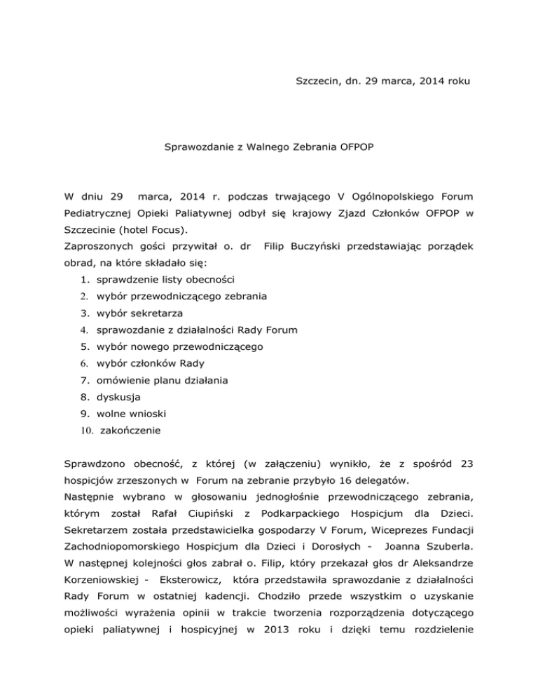 Szczecin, dn. 29 marca, 2014 roku Sprawozdanie z Walnego Zebrania OFPOP W dniu 29 marca, 2014 r. podczas trwającego V Ogólnopolskiego Forum Pediatrycznej Opieki Paliatywnej odbył się krajowy Zjazd Członków OFPOP w Szczecinie (hotel Focus). Zaproszonych gości przywitał o. dr Filip Buczyński przedstawiając porządek obrad, na które składało się: 1. sprawdzenie listy obecności 2. wybór przewodniczącego zebrania 3. wybór sekretarza 4. sprawozdanie z działalności Rady Forum 5. wybór nowego przewodniczącego 6. wybór członków Rady 7. omówienie planu działania 8. dyskusja 9. wolne wnioski 10. zakończenie Sprawdzono obecność, z której (w załączeniu) wynikło, że z spośród 23 hospicjów zrzeszonych w Forum na zebranie przybyło 16 delegatów. Następnie wybrano w głosowaniu jednogłośnie przewodniczącego zebrania, którym został Rafał Ciupiński z Podkarpackiego Hospicjum dla Dzieci. Sekretarzem została przedstawicielka gospodarzy V Forum, Wiceprezes Fundacji Zachodniopomorskiego Hospicjum dla Dzieci i Dorosłych - Joanna Szuberla. W następnej kolejności głos zabrał o. Filip, który przekazał głos dr Aleksandrze Korzeniowskiej - Eksterowicz, która przedstawiła sprawozdanie z działalności Rady Forum w ostatniej kadencji. Chodziło przede wszystkim o uzyskanie możliwości wyrażenia opinii w trakcie tworzenia rozporządzenia dotyczącego opieki paliatywnej i hospicyjnej w 2013 roku i dzięki temu rozdzielenie rehabilitacji ambulatoryjnej od domowej z możliwością jej rozliczania. Ponadto dr Korzeniewska-Ekterowicz poinformowała o licznej wymianie korespondencji z Ministrem Zdrowia i Narodowym Funduszem Zdrowia. Po przedstawieniu sytuacji bieżącej rozpoczęto wybór nowego Przewodniczącego Rady Forum na 2 letnią kadencję Kandytami zostali: 1. o. dr Filip Buczyński 2. dr Aleksandra Korzeniowska – Eksterowicz 3. dr hab. Katarzyna Muszyńska - Rosłan W komisji Skrutacyjnej znaleźli się Edyta Wąsiewska, Janina Adamczyk, Witalij Andrzejewski. Odbyło się głosowanie tajne, w którym: 11 (słownie: jedenaście) głosów uzyskał o. dr Filip Buczyński, 4 (słownie: cztery) głosy uzyskała dr Aleksandra Katarzyna – Eksterowicz 1 (słownie: jeden) głos dr hab. Katarzyna Muszyńska – Rosłan Wynik: Przewodniczącym Rady Forum na dwuletnią kadencję został wybrany o. dr Filip Buczyński. Zgodnie z porządkiem obrad wybrano kandydatów do Rady Forum w osobach: 1. Aleksandra Korzeniewska- Eksterowicz 2. Katarzyna Muszyńska - Rosłan 3. Rafał Ciupiński 4. Ireneusz Kalisiak 5. Witalij Andrzejewski Odbyło się głosowanie nad przyjęciem formy głosowania poprzez aklamację. Powyższy sposób wybrano jednogłośnie. Tym samym przyjęto zgodnie z głosowaniem jednogłośnie wszystkich zgłoszonych kandydatów. Po głosowaniu nad nową Radą Forum na kolejną kadencję nastąpiło przejście do następnego punktu obrad, a mianowicie planów na kolejną kadencję. W planach: 1. próba reformy w sprawie hospicjów stacjonarnych dla dzieci 2. szersze wprowadzenie hospicjów perinatalnych 3. współpraca z Zarządem nowopowstałej Sekcji Pediatrycznej Medycyny Paliatywnej, działającej przy Polskiego Towarzystwa Pediatrycznego Na zebranie zaproszono prof. Joannę Szymkiewicz - Dangel, która podjęła rozmowy o współpracy Forum i Sekcji Pediatrycznej Medycyny Paliatywnej przy PTP w zakresie kształcenia lekarzy pediatrów w zakresie medycyny paliatywnej, która według sekcji jest niezbędna i na dzień dzisiejszy będzie możliwa w dwóch ośrodkach (Warszawie i Łodzi). Ponadto ustalono, że w najbliższym czasie zorganizowane zostanie spotkanie hospicjów w Warszawie (siedzibie Warszawskiego Hospicjum dla Dzieci) w sprawie utworzenia większej liczby ośrodków hospicjów perinatalnych. Omówiono również możliwości wzięcia udziału Forum w tworzeniu projektu rozporządzenia dotyczącego wprowadzenia zmian w związku z próbą jednoznacznego oddzielenia pediatrycznej opieki paliatywnej od opieki paliatywnej dla dorosłych. Profesor Joanna Szymkiewicz - Dangel poinformowała, ze powinno powstać lobby pracowników hospicjów, które pomoże sekcji w prawidłowym wyselekcjonowaniu problemów hospicjów nad którymi jest potrzeba współpracy. Została podjęta dyskusja w związku z brakiem prawnego rozdzielenia wymogów dotyczących stacjonarnego hospicjum dla dorosłych od dziecięcego (na dzień dzisiejszy brak rozdzielenia uniemożliwia tak naprawdę kontraktowanie hospicjum stacjonarnego dla dzieci). Na koniec poinformowano, że prof. Alicja Chybicka, będzie wspierać działanie nowo powstałej Sekcji PTP. Na tym posiedzenie zakończono. Sekretarz Walnego Zebrania OFPOP