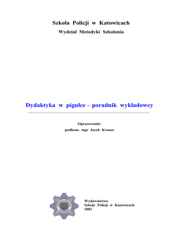 Szkoła Policji w Katowicach Wydział Metodyki Szkolenia Dydaktyka w pigułce – poradnik wykładowcy Opracowanie: ŁA PO O C JI LI SZK podkom. mgr Jacek Krauze Wydawnictwo Szkoły Policji w Katowicach 2002 2 3 Spis treści Wstęp 5 1. Przedmiot i zadania dydaktyki 7 2. Cele kształcenia 10 2.1. Definicja i funkcja celu w działaniach 2.2. Taksonomia celów kształcenia 3. Proces kształcenia 3.1. Ogniwa procesu kształcenia 4. Zasady kształcenia 4.1. 4.2. 4.3. 4.4. 4.5. Zasada aktywności Zasada praktyczności Zasada poglądowości Zasada przystępności Zasada indywidualizacji i zespołowości 5. Metody nauczania 5.1. 5.2. 5.3. 5.4. 5.5. 5.6. 5.7. 5.8. 5.9. 5.10. 5.11. Opis Pogadanka Wykład Nauczanie problemowe Wykład interaktywny Burza mózgów Metoda sytuacyjna Metoda inscenizacji Metoda symulacyjna Dyskusja dydaktyczna Ćwiczenia 6. Środki działania dydaktycznego 6.1. Funkcje środków dydaktycznych 6.2. Podział środków dydaktycznych Bibliografia 10 12 14 14 19 19 20 21 21 22 23 24 25 26 27 27 28 29 30 31 32 33 35 35 35 37 4 5 Wstęp Demokratyzacja życia społecznego, której od kilkunastu lat doświadcza polskie społeczeństwo, stawia wysokie wymagania zarówno przed oświatą cywilną jak i przed szkolnictwem policyjnym. Podwyższające się standardy i wymogi wymuszają permanentne podnoszenie jakości szkolenia na wszelkich poziomach edukacji – również policyjnej. Od policjanta - absolwenta szkoły policyjnej wymaga się bardzo dobrej znajomości przepisów prawnych oraz umiejętności praktycznych. Taki stan rzeczy wymaga od nauczycieli policyjnych ciągłego doskonalenia swojego warsztatu pedagogicznego. Doskonalenie to może opierać się na wielu płaszczyznach, takich jak na przykład podjęcie studiów podyplomowych pedagogicznych, specjalistycznych czy też doktoranckich. Nie należy jednak zapominać, że na poziomie prowadzonej działalności dydaktycznej niezbędne jest samodoskonalenie swojej wiedzy i umiejętności z dziedziny dydaktyki. Celem napisania proponowanej publikacji było przedstawienie wszystkim chętnym, którym nie jest obojętny poziom wykształcenia policjantów, podstaw niezbędnych do prawidłowego wdrażania procesu dydaktycznego. Zawarte w poradniku treści oparte są na myśli wielu znakomitych przedstawicieli pedagogiki i są podstawową wiedzą z zakresu dydaktyki. Wiedzę tę należy wzbogacić poprzez studiowanie literatury zamieszczonej w bibliografii załączonej do niniejszego opracowania. W pierwszej części skryptu przedstawiono dydaktykę jako dyscyplinę naukową jak również omówiono jej przedmiot i zadania. Następnie zaprezentowano cele, proces kształcenia, zasady i metody kształcenia oraz środki dydaktyczne. Informacje zawarte w opracowaniu zawierają niezbędną, podstawową wiedzę, jaką powinien posiadać dydaktyk policyjny chcący świadomie i odpowiedzialnie realizować proces dydaktyczny oraz czerpać wymierne korzyści z tej działalności w postaci dobrze wykształconych policjantów – absolwentów szkoły Policji. 6 7 1. Przedmiot i zadania dydaktyki Mówiąc o dydaktyce należy rozpocząć od zdefiniowania samego terminu „dydaktyka” a następnie przeanalizować, jaki jest jej przedmiot i zadania. Na przestrzeni dziejów myśli pedagogicznej przedmiotem dydaktyki było zawsze kształcenie i organizacja procesu prowadzącego do opanowania wiedzy. Przedmiot i zadania dydaktyki policyjnej są w pełni zbieżne z dydaktyką cywilną – różni się jedynie podmiot oddziaływań, którym jest w tym przypadku policjant na poszczególnych szczeblach swojej kariery zawodowej. Termin dydaktyka pochodzi od greckich słów: didasco – uczę, nauczam i didascolos – nauczyciel. W rozumieniu ogólnym jest nazwą właściwą nauki o nauczaniu i uczeniu się szkolnym1. Dyscyplina ta zajmuje się działaniami zarówno nauczyciela jak i ucznia. Działania nauczyciela są zamierzone i świadomie podejmowane a ich celem jest ukształtowanie osobowości wychowanka zgodnie z wzorem zaakceptowanym przez społeczeństwo, w którym proces ten się odbywa. Dydaktyka zajmuje się wykrywaniem i ustalaniem prawidłowości procesu nauczania – uczenia się. Te dwa rodzaje czynności, gdy są wzajemnie powiązane, tworzą zintegrowaną całość stanowiącą proces kształcenia. Dydaktyka tworzy pewien system, na który składają się zasady organizacyjne tego procesu a także treści, metody, środki nauczania – uczenia się, tworzące spójną wewnętrznie strukturę, podporządkowaną realizacji założonych celów kształcenia2. Proces nauczania – uczenia się (kształcenie) jest procesem planowym, systematycznym i zamierzonym. Zmierza on przede wszystkim do przyswojenia przez uczniów pewnej wiedzy czy też umiejętności. Nie wyklucza to jednak (a nawet wymaga) możliwości istotnego wpływu na wszechstronny rozwój uczestników określonego szkolenia. Postawienie sobie przez nauczyciela takiego celu, wymaga od 1 2 W. P. Zaczyński: Dydaktyka (W:) Encyklopedia pedagogiczna pod red. W. Pomykało, Warszawa 1993, s. 134. Cz. Kupisiewicz: Podstawy dydaktyki ogólnej, Warszawa 1995, s. 10. 8 niego czynności zmierzających nie tylko do przekazania wiadomości z poszczególnych zakresów wiedzy bądź też kształtowania określonych umiejętności, ale także rozwijania zainteresowań i zdolności poznawczych, kształtowania podstaw naukowego światopoglądu, wdrożenia do systematycznego i samodzielnego zdobywania wiedzy, do indywidualnej oraz zespołowej działalności poznawczej, wpojenia wartościowych zasad postępowania. Przedmiotem badań dydaktycznych jest przede wszystkim wszelka świadoma działalność dydaktyczna, wyrażająca się w procesach nauczania – uczenia się, samokształcenia i samouctwa, w ich treści, przebiegu, metodach, środkach i organizacji, podporządkowana przyjętym celom3. Dydaktyka zajmuje się rzeczywistością, w której z jednej strony działa nauczyciel kierujący procesem uc