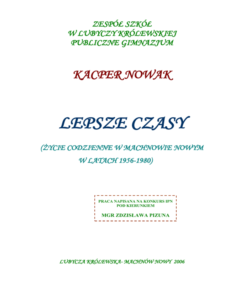 ZESPÓŁ SZKÓŁ W LUBYCZY KRÓLEWSKIEJ PUBLICZNE GIMNAZJUM KACPER NOWAK LEPSZE CZASY (ŻYCIE CODZIENNE W MACHNOWIE NOWYM W LATACH 1956-1980) PRACA NAPISANA NA KONKURS IPN POD KIERUNKIEM MGR ZDZISŁAWA PIZUNA LUBYCZA KRÓLEWSKA- MACHNÓW NOWY 2006 WSTĘP Naz ywam się Kacper Nowak. Mieszkam w Machnowie Nowym. Jestem uczniem klasy III „e” Publicznego Napisałem pracę na rozczarowania...>> Doświadczenia ogólnopolski Społeczeństwo świadka historii”, Gimnazjum konkurs polskie w w Lubycz y Królewskiej. historyczny: czasach zorganizowanego „<<Nadzieje Gomułki przez B iuro i i Gierka. Edukacji Publicznej Inst ytutu Pamięci Narodowej. W swojej pracy przedstawiłem wiele zjawisk ż ycia codziennego mieszkańców Machnowa Nowego w latach 1956 -1980 z punktu widzenia trzech różnych osób, mieszkańców Machnowa Nowego. Skupiłem się również na relacjach międz y władzą komunist yczną a społeczeństwem. Oto krótka prezentacja osób, z którymi przeprowadziłem rozmowy na interesujący mnie temat: Pan Stanisław Nowosad, pochodzi z Zubowic, a od 1950 roku mieszka w Machnowie Nowym. Obecnie ma 69 lat. W Ko mbinacie pracował jako traktorz ysta, elektryk i kierowca. Zawód kierowcy sprawił, że uczestnicz ył w ż yciu publicznym i był świadkiem wielu ważnych wydarzeń mających miejsce w Machnowie Nowym. Pani Michalina Nowak, prywatnie moja babcia, ma 73 lata. Pochodz i z Uchnowa (obecnie Ukraina), a w Machnowie Nowym mieszka od 1953 roku. Zajmowała się głównie prowadzeniem domu i wychowywaniem czworga dzieci, gdyż jej mąż Michał, mój dziadek, pracował jako kowal i nie mógł poświęcać dzieciom zbyt wiele czasu. Przez kil ka lat pracowała w aptece. Pan Czesław Nowak jest moim ojcem, synem pani Michaliny. Ma 49 lat. W Machnowie Nowym mieszka od urodzenia. W latach 1964 -1976 był uczniem Szkoł y Podstawowej w Machnowie Nowym i I Liceum Ogólnokształcącego w Tomaszowie Lubelskim. O czasach Gomułki i Gierka opowiada z perspekt ywy dziecka i nastolatka. Celem mojej pracy było ukazanie ż ycia codziennego oraz relacji międz y mieszkańcami Machnowa Nowego a komunist yczną władzą. Czasy Gomułki i Gierka przez wiele osób oceniane są negat ywn ie, jednak moi rozmówcy uważają, że w ich prz ypadku te lata był y czasem dobrego i ciekawego ż ycia. Pracę zat ytułowałem „Lepsze czasy”, ponieważ z ich relacji można odcz ytać, że 2 życie w latach 1956 -1980 było rzeczywiście lepsze od tego, jakie wiodą obecnie. W tym okresie w Machnowie Nowym kwitło życie kulturalne i towarz yskie, a mieszkańcy, mimo że rządy komunistów niosł y za sobą wiele ograniczeń, mieli pozyt ywniejsze podejście do ż ycia i byli dla siebie życzliwsi niż obecnie. © Wszystkie prawa zastrzeżone. Posiadaczami praw autorskich są: autor pracy Kacper Nowak, opiekun pracy Zdzisław Pizun oraz Instytut Pamięci Narodowej. Ewentualne wykorzystanie (elektroniczne lub w druku) tekstów każdorazowo musi uzyskać zgodę ww. osób lub instytucji. Wykorzystany materiał musi posiadać adnotację, że pochodzi z pracy napisanej na konkurs IPN pn. „Nadzieje i rozczarowania... Społeczeństwo polskie w czasach Gomułki i Gierka. Doświadczenia świadka historii”. 3 LEPSZE CZASY W latach Gospodarstwem 1956-1980 Rolnym i Machnów Nowy siedzibą prężnie zarządzającego czternastoma PGR -ami i b ył duż ym działającego Państwowym Kombinatu, zakładami pracy znajdującymi się w okolicy. Kierowcą w t ym właśnie Kombinacie był pan Stanisław Nowosad : „Zacząłem pracować jako po mocnik traktorzysty, później pracowałem jako elektryk, a następnie jako kierowca w Kombinacie”. Władza Polski Ludowej dbała o dobre relacje z mieszkańcami Machnowa Nowego i często urzędnicy państwowi składali tutaj wiz yt y. Machnów Nowy odwiedził sam I Sekretarz KC PZPR Edward Gierek. Tak te wydarzenia wspomina pan Stanisław: „W latach pięćdziesiątych i sześćdziesiątych przyjeżdżali do Machnowa wyżsi urzędnicy państwowi tak jak Jagielski. Gdy Gierek nastał na stanowisko po Gomułce, odwiedzał te tereny wschod niej Polski i był w Machnowie. Woziłem go na pole, oglądać zboże. Bardzo był zadowolony”. Miejscowa władza, cz yli kierownictwo PGR -u i Kombinatu, również utrz ym ywała dobre stosunki z mieszkańcami. Dyrektorz y szanowali pracowników i starali się, aby wsz ystk ie zgłaszane przez nich sprawy był y szybko załatwiane. Tak pamięta to pan Stanisław: „ Między dyrektorami a ludźmi z PGR-u raczej był koleżeński stosunek. Kierownictwo gospodarstw było różne. Zdarzali się też chamscy, ale dyrektorzy byli raczej przychylnie nastawieni do ludzi. Był Komitet Zakładowy PZPR -u i wszelkie skargi i sprawy były załatwiane bardzo dobrze. Była też Rada Zakładowa”. Wszyscy mieszkańcy byli dobrze traktowani przez władzę, jednak istniała grupa, z którą dyrektorz y obchodzili się w specjal ny sposób. Byli to członkowie PZPR-u: „Przywileje to niektórzy mieli. Nie miał dzieci, ale był żonaty, to mieszkanie dostał, bo był partyjny. Jak jakaś lepsza praca była, np. na nowym ciągniku, to też partyjni dostawali”. Mieszkańcy Machnowa Nowego mogli, po ciężkiej nieraz pracy, miło spędzić czas. W miejscowej świetlicy występowało wielu znanych polskich art ystów. Było też kino, w którym wyświetlano film y mieszkańcom PGR -ów. Tak wspomina to pan Stanisław: „Do świetlicy przyjeżdżały występy znanych 4 artystów. W Machnowie występowali m.in. Hanka Bielicka, Karin Stanek, Irena Santor, Kazimierz Rudzki, Jerzy Połomski. Było wesoło. Było kino, były potańcówki, co roku urządzano dożynki”. Sytuacja ekonomiczna mieszkańców Machnowa Nowego w latach 19561970, gdy I Sekretarzem KC PZPR był Władysław Gomułka, nie była najlepsza. Pieniądze, jakie zarabiali pracownicy PGR -u i Kombinatu, wystarczał y na utrz ymanie rodziny i zaspokojenie podstawowych potrzeb, ale to głównie dlate