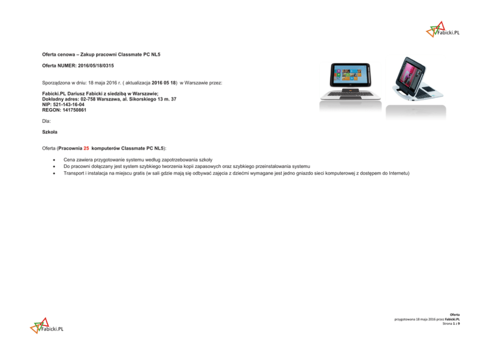 Oferta cenowa – Zakup pracowni Classmate PC NL5 Oferta NUMER: 2016/05/18/0315 Sporządzona w dniu: 18 maja 2016 r. ( aktualizacja 2016 05 18) w Warszawie przez: Fabicki.PL Dariusz Fabicki z siedzibą w Warszawie; Dokładny adres: 02-758 Warszawa, al. Sikorskiego 13 m. 37 NIP: 521-143-16-04 REGON: 141750861 Dla: Szkoła Oferta (Pracownia 25 komputerów Classmate PC NL5): Cena zawiera przygotowanie systemu według zapotrzebowania szkoły Do pracowni dołączany jest system szybkiego tworzenia kopii zapasowych oraz szybkiego przeinstalowania systemu Transport i instalacja na miejscu gratis (w sali gdzie mają się odbywać zajęcia z dziećmi wymagane jest jedno gniazdo sieci komputerowej z dostępem do Internetu) Oferta przygotowana 18 maja 2016 przez Fabicki.PL Strona 1 z 9 Cyfrowa Szkoła (cennik 18 maja 2016) Pracownia 25 komputerów (wersja z Windows Home) Nazwa 25 komputerów Classmate NL5 Oznaczenie Cena Netto A Wersja minimum Cena brutto 46 980,50 zł 57 785,40 zł 3 657,73 zł 4 499,00 zł 4 650,40 zł 5 719,99 zł (A) 1 komputer nauczycielski z routerem B 1 szafka mobilna Wersja standard (A+B) Szkolenie 5 nauczycieli 68 004,39 zł C Wersja standard + szkolenie 3 821,14 zł (A+B+C) 4 700,00 zł 72 704,39 zł Cyfrowa Szkoła (cennik 18 maja 2016) Pracownia 25 komputerów (wersja z Windows Pro) Nazwa 25 komputerów Classmate NL5 Wersja minimum 1 komputer nauczycielski z routerem 1 szafka mobilna Wersja standard Szkolenie 5 nauczycieli Wersja standard + szkolenie Oznaczenie A Cena Netto Cena brutto 56 700,00 zł 69 741,00 zł 3 657,73 zł 4 499,00 zł 4 650,40 zł 5 719,99 zł (A) B (A+B) C (A+B+C) 79 959,99 zł 3 821,14 zł 4 700,00 zł 84 659,99 zł Oferta przygotowana 18 maja 2016 przez Fabicki.PL Strona 2 z 9 Komputer uczniowski Classmate NL5 (Cyfrowa szkoła) Rozmiar ekranu: Rozdzielczość ekranu: Technologia dotykowa: Dodatkowe funkcje ekranu: Procesor: Prędkość procesora: Pamięć: Typ pamięci: Dysk twardy: Karta dźwiękowa: Głośniki: Wyjście słuchawkowe: Wejście mikrofonowe: Mikrofon: USB 3.0: USB 2.0: Wyjście HDMI: Touchpad: Karta sieciowa Wi-Fi: Bluetooth: Kamera: Czytnik kart pamięci: Bateria: 10,1” LED LCD IPS (In-plane switching) 2 1366 x 768 HD ; jasność 350 nits (cd/m ) Pojemnościowa (5 aktywnych punktów dotykowych) (tzw. multi touch). Obsługa za pomocą dłoni (palców) lub dołączonego pisaka Ekran odłączany od klawiatury, praca w trybie zakrywającym klawiaturę (tablet), wbudowane dwie kamery (przednia i tylna). Dołączona w komplecie stacja dokująca z klawiaturą. Intel Z3740D/ Z3735F 2M Cache, 1.33/1.83 GHz (Quad Core) (CPU Mark: 1083) Model NL5 posiada CPU Mark: 1083 Model NL4 posiadał CPU Mark: 982 Model NL3 posiadał CPU Mark: 538 Model NL2 posiadał CPU Mark: 287 2 GB DDR3 1333 MHz DDR3 64GB eMMC TAK TAK TAK (połączone z wejściem mikrofonowym – combo) TAK (połączone z wyjściem słuchawkowym – combo) TAK (cyfrowy) TAK (1 port) TAK (1 port + 1 port microUSB) w stacji dokującej TAK (Micro-HDMI) TAK: z obsługą gestów Wi-Fi 802.11 A/B/G/N/ , wspiera WiDi (Intel Wireless Display) TAK: v.4 30 FPS, 1280x720, High Definition, 1.2 Mega Pixel Webcam (Przednia) , 5.0 Mega Pixel Webcam (Tylna), z możliwością pracy w trybie mikroskopu i niezależnym oświetlaniem ekspozycji (dołączona w komplecie przystawka mikroskopowa/soczewka) Tak (Micro-SD) Litowo-Polimerowa (8400 mAh): praca 8 godzin poza stacją dokującą (tryb pracy bez klawiatury), Oferta przygotowana 18 maja 2016 przez Fabicki.PL Strona 3 z 9 Wymiary: Waga: Odporny na zalanie: Odporność na upadek: Specjalne klawisze dostępu: Specjalne sensory: Specjalna konstrukcja: Aplikacje edukacyjne: Przeznaczenie: Modem 3G, LTE, GPS: System operacyjny: Gwarancja: Rozmiar: 10.6" (Wide) x 7" (H) x 0.45" (D) Rozmiar: 270 mm (długość) x 178 mm (szerokość) x 12 mm (grubość) od 670 gram (tablet) do 1200 gram (razem z klawiaturą zawartą w stacji dokującej) Tak (klawiatura) (IP 51) Tak (z wysokości 50/70 cm) (wbudowane sensory grawitacyjne) (G-sensor) Tak Tak (czujnik światła, magnetometr, akcelerometr, żyroskop, kompas, sonda temperatury, przystawka do mikroskopu 30x powiększenie) Tak (wygodna rączka, obudowa i ekran odporny na zarysowania) IP 51 ochrona przed wnikaniem pyłu w ilościach zakłócających pracę urządzenia IP 41 ochrona przed ciałami o wielkości ponad 1 mm (cienkie narzędzie, cienki przewód) Tak, zawiera oprogramowanie edukacyjne i użytkowe dla uczniów (szkoła podstawowa klasy 0-3, szkoła podstawowa klasy 4-6, gimnazjum klasy 1-3, szkoła ponadgimnazjalna klasy 1-3) Uczniowie szkoły podstawowej: TAK Uczniowie szkoły gimnazjalnej: TAK Uczniowie szkoły ponadgimnazjalnej: TAK (wewnętrzny) - opcja Windows 8.1 lub 8.1 Pro/10 Pro 3 lata Oferta przygotowana 18 maja 2016 przez Fabicki.PL Strona 4 z 9 Komputer nauczycielski (Cyfrowa szkoła) Nazwa Laptop nauczycielski: Pamięć: 8 GB RAM Karta graficzna: HDMI Karta sieciowa: WiFi/N Kamera: internetowa DVD: Multi Ekran: 17 ‘’ dostosowany do klasy Dysk: 1 TB Procesor: i7 System: Windows 10 Pro zintegrowane oprogramowanie do zarządzania klasą (Intel 1:1); Gwarancja: 3 lata Router (Cyfrowa szkoła) Nazwa Router dedykowany dla klasy internetowej Intel: współdzielenie danych multimedialnych; współdzielenie zewnętrznego dysku ; duża przepustowość; filtr treści niepożądanych Gwarancja: 3 lata Oferta przygotowana 18 maja 2016 przez Fabicki.PL Strona 5 z 9 Szafka, dla szkół wielokondygnacyjnych (Cyfrowa szkoła) Nazwa * Mobilna szafka na komputery uczniowskie, do przechowywania, przemieszczania, ładowania baterii; Ilość pólek: 30; Możliwość bezawaryjnego automatycznego sekwencyjnego podłączenia do 30 urządzeń; Gwarancja: 3 lata * Szafkę mobilną możemy dostarczyć w konfiguracji kolorów (dostawa do 7 tygodni od zamówienia) Oferta przygotowana 18 maja 2016 przez Fabicki.PL Strona 6 z 9 Parametry szafki mobilnej: wysokość 1250 mm x szerokość 1310 mm x głębokość 500 mm