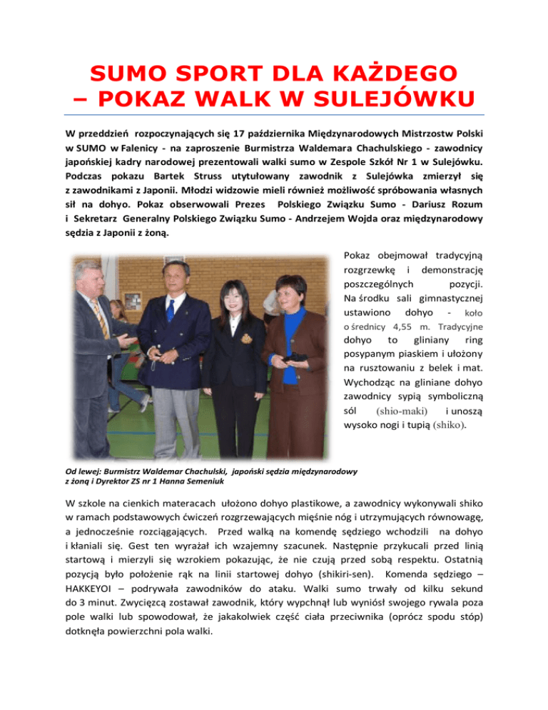 SUMO SPORT DLA KAśDEGO – POKAZ WALK W SULEJÓWKU W przeddzień rozpoczynających się 17 października Międzynarodowych Mistrzostw Polski w SUMO w Falenicy - na zaproszenie Burmistrza Waldemara Chachulskiego - zawodnicy japońskiej kadry narodowej prezentowali walki sumo w Zespole Szkół Nr 1 w Sulejówku. Podczas pokazu Bartek Struss utytułowany zawodnik z Sulejówka zmierzył się z zawodnikami z Japonii. Młodzi widzowie mieli również możliwość spróbowania własnych sił na dohyo. Pokaz obserwowali Prezes Polskiego Związku Sumo - Dariusz Rozum i Sekretarz Generalny Polskiego Związku Sumo - Andrzejem Wojda oraz międzynarodowy sędzia z Japonii z żoną. Pokaz obejmował tradycyjną rozgrzewkę i demonstrację poszczególnych pozycji. Na środku sali gimnastycznej ustawiono dohyo - koło o średnicy 4,55 m. Tradycyjne dohyo to gliniany ring posypanym piaskiem i ułożony na rusztowaniu z belek i mat. Wychodząc na gliniane dohyo zawodnicy sypią symboliczną sól (shio-maki) i unoszą wysoko nogi i tupią (shiko). Od lewej: Burmistrz Waldemar Chachulski, japoński sędzia międzynarodowy z żoną i Dyrektor ZS nr 1 Hanna Semeniuk W szkole na cienkich materacach ułożono dohyo plastikowe, a zawodnicy wykonywali shiko w ramach podstawowych ćwiczeń rozgrzewających mięśnie nóg i utrzymujących równowagę, a jednocześnie rozciągających. Przed walką na komendę sędziego wchodzili na dohyo i kłaniali się. Gest ten wyrażał ich wzajemny szacunek. Następnie przykucali przed linią startową i mierzyli się wzrokiem pokazując, że nie czują przed sobą respektu. Ostatnią pozycją było położenie rąk na linii startowej dohyo (shikiri-sen). Komenda sędziego – HAKKEYOI – podrywała zawodników do ataku. Walki sumo trwały od kilku sekund do 3 minut. Zwycięzcą zostawał zawodnik, który wypchnął lub wyniósł swojego rywala poza pole walki lub spowodował, że jakakolwiek część ciała przeciwnika (oprócz spodu stóp) dotknęła powierzchni pola walki. Największe emocje wzbudził pojedynek Bartka Strussa z zawodnikami japońskimi. Siły były wyrównane - jedną walkę wygrał Bartek, a drugą zawodnik z Japonii. Następnego dnia zawodnicy spotkali się ponownie w Falenicy podczas Międzynarodowych Mistrzostw Polski, którym patronował m.in. Burmistrz Miasta Sulejówek. Na zawody przyjechały najsilniejsze reprezentacje: Japonii, Rosji, Ukrainy, Gruzji, Estonii i Bułgarii i oczywiście Polski. Bartłomiej Struss - brązowy medalista Mistrzostw Europy juniorów 2008 i 2009 i aktualny brązowy medalista Mistrzostw Świata juniorów tym razem nie stanął na podium. Wśród Polskich zawodników największy sukces odniosła Edyta Popecka-Witkowska uzyskując złoto w kategorii open. Za rok przed naszymi zawodnikami kolejna szansa - Mistrzostwa Świata seniorów i juniorów, które odbędą się w tym samym miejscu, w hali sportowej w Falenicy. Będziemy trzymać kciuki za naszych zawodników. Agnieszka Wyrostkiewicz Zawodnicy w ramach rozgrzewki wykonują shiko Zawodnicy kadry japońskiej wykonują pozycje shikiri-sen - położenie rąk na liny startowej dohyo Zawodnicy kadry japońskiej – walka Uczeń z Sulejówka próbuje swoich sił na dohyo. Zawodników obserwują Sekretarz Generalny Związku Sumo Andrzej Wojda i Burmistrz Waldemar Chachulski Bartek Struss i zawodnik japoński mierzą się spojrzeniem przed walką Bartek Struss i zawodnik japoński w pozycji shikiri-sen Bartek Struss na Międzynarodowych Mistrzostwach Polski w Falenicy Międzynarodowe Mistrzostwa Polski w Falenicy – walka pokazowa Międzynarodowe Mistrzostwa Polski w Falenicy – walka pokazowa Międzynarodowe Mistrzostwa Polski w Falenicy – walka pokazowa Przewodniczący Międzynarodowej Federacji Sumo i Burmistrz Sulejówka podczas ceremonii dekoracji - Międzynarodowe Mistrzostwa Polski w Falenicy