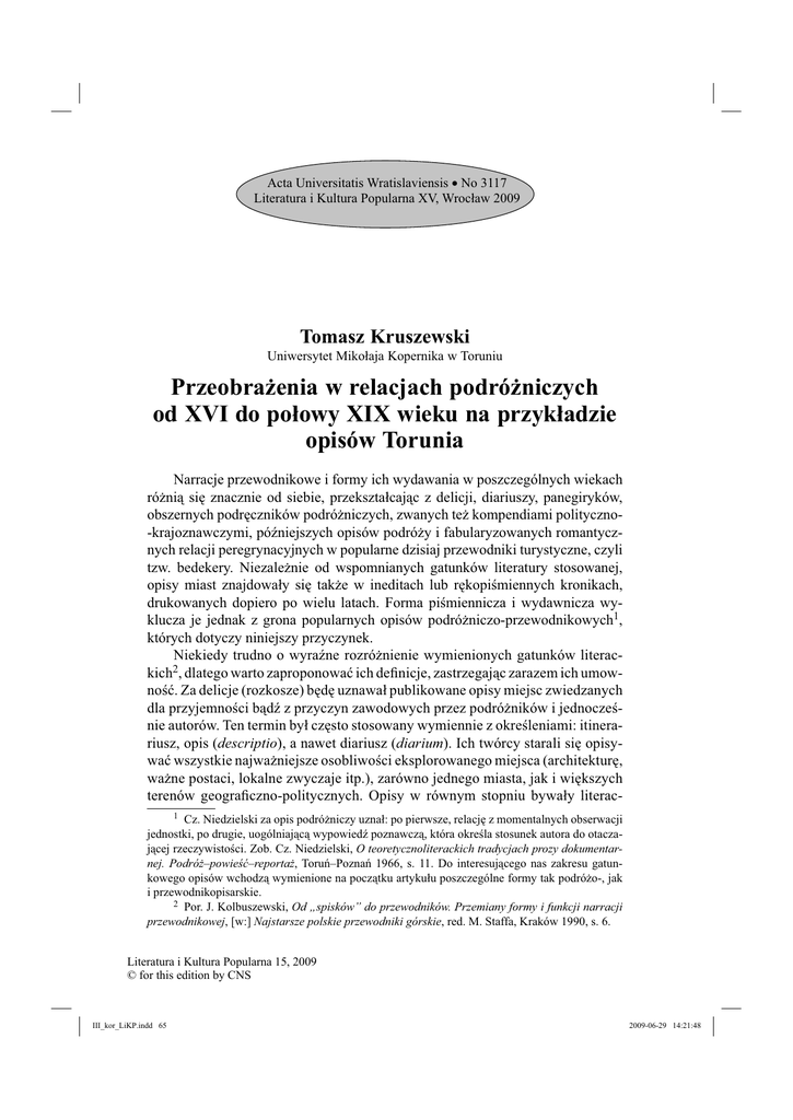 Acta Universitatis Wratislaviensis • No 3117 Literatura i Kultura Popularna XV, Wrocław 2009 Tomasz Kruszewski Uniwersytet Mikołaja Kopernika w Toruniu Przeobrażenia w relacjach podróżniczych od XVI do połowy XIX wieku na przykładzie opisów Torunia Narracje przewodnikowe i formy ich wydawania w poszczególnych wiekach różnią się znacznie od siebie, przekształcając z delicji, diariuszy, panegiryków, obszernych podręczników podróżniczych, zwanych też kompendiami polityczno-krajoznawczymi, późniejszych opisów podróży i fabularyzowanych romantycznych relacji peregrynacyjnych w popularne dzisiaj przewodniki turystyczne, czyli tzw. bedekery. Niezależnie od wspomnianych gatunków literatury stosowanej, opisy miast znajdowały się także w ineditach lub rękopiśmiennych kronikach, drukowanych dopiero po wielu latach. Forma piśmiennicza i wydawnicza wyklucza je jednak z grona popularnych opisów podróżniczo-przewodnikowych1, których dotyczy niniejszy przyczynek. Niekiedy trudno o wyraźne rozróżnienie wymienionych gatunków literackich2, dlatego warto zaproponować ich definicje, zastrzegając zarazem ich umowność. Za delicje (rozkosze) będę uznawał publikowane opisy miejsc zwiedzanych dla przyjemności bądź z przyczyn zawodowych przez podróżników i jednocześnie autorów. Ten termin był często stosowany wymiennie z określeniami: itinerariusz, opis (descriptio), a nawet diariusz (diarium). Ich twórcy starali się opisywać wszystkie najważniejsze osobliwości eksplorowanego miejsca (architekturę, ważne postaci, lokalne zwyczaje itp.), zarówno jednego miasta, jak i większych terenów geograficzno-politycznych. Opisy w równym stopniu bywały literac1 Cz. Niedzielski za opis podróżniczy uznał: po pierwsze, relację z momentalnych obserwacji jednostki, po drugie, uogólniającą wypowiedź poznawczą, która określa stosunek autora do otaczającej rzeczywistości. Zob. Cz. Niedzielski, O teoretycznoliterackich tradycjach prozy dokumentarnej. Podróż–powieść–reportaż, Toruń–Poznań 1966, s. 11. Do interesującego nas zakresu gatunkowego opisów wchodzą wymienione na początku artykułu poszczególne formy tak podróżo-, jak i przewodnikopisarskie. 2 Por. J. Kolbuszewski, Od „spisków” do przewodników. Przemiany formy i funkcji narracji przewodnikowej, [w:] Najstarsze polskie przewodniki górskie, red. M. Staffa, Kraków 1990, s. 6. Literatura i Kultura Popularna 15, 2009 © for this edition by CNS III_kor_LiKP.indd 65 2009-06-29 14:21:48 66 Tomasz Kruszewski kie, co precyzyjne treściowo, ale najczęściej w układzie topograficznym bądź rzeczowym. Z różnych nowożytnych form opisów peregrynacyjnych „rozkosze” bywały najbardziej obiektywne, choć i w nich osobisty stosunek autora do przedstawianego obiektu był wyraźny (był to jeden z głównych wyróżników tej formy pisarskiej), a miejscowe podania, anegdoty i legendy słabo oddzielane od faktów. Mimo tego to one w największym stopniu wpłynęły na konstrukcję literacką pierwszych bedekerów w XIX wieku3. Diariuszem – o ile nie kwalifikował się do typu poprzedniego – był rodzaj pamiętnika albo dziennika. Jego autor chronologicznie opisywał ważne wydarzenia, w których uczestniczył. Często formułę literacką diariuszy podporządkowywał dokładnemu relacjonowaniu rzeczywistości, ale i to nie było bezwarunkowe. Panegiryk to kolejny gatunek literatury stosowanej. Najczęstszymi formułami były pochwalne mowy, wiersze lub listy na temat osób, wydarzeń, rzadziej miejsc. Charakteryzował się licznymi pochlebstwami, przesadnym zachwytem opisywanym podmiotem. Jego przedstawienie nie było wymuszone obiektywizmem, dlatego panegiryki właściwie nie bywały planami rzeczywistych wojaży. Wydaje się, że najmniej podatną na wpływy innych wspomnianych gatunków była podróż, mieszcząca się, jak pozostałe, w obrębie literatury faktu, ale niekiedy funkcjonująca również w zakresie literatury pięknej. Z tego powodu spokrewniona jest zarówno z wczesnym reportażem, jak i literaturą wspomnieniową. Należy dodatkowo zaznaczyć mocne podporządkowanie tej formuły i celów trendom oświeceniowym, a później romantycznym4. Wreszcie przewodniki turystyczne. Tę popularną obecnie formę zapoczątkowano w latach trzydziestych XIX wieku. Składa się na nią historia danego terenu, metodycznie – najlepiej z marszrutą – ułożona charakterystyka znajdujących się tam osobliwości, zazwyczaj z załączonymi planami i mapami, oraz informacje praktyczne na temat cen biletów, noclegów itp. Cechą wyróżniającą przewodniki spośród gatunków poprzednio charakteryzowanych jest silniej uwypuklony etos autora przewodnika, poczuwającego się do odpowiedzialności za czytelnika w trakcie podróży. Opisy są schematyczne, dla lepszej orientacji wprowadzano standardowe znaki, a całość wydawano po przystępnej cenie, w małym formacie, zwykle w solidnej oprawie5. Prześledzenie, w jaki sposób autorzy postrzegali charakteryzowane miejsca i ewentualny własny udział w peregrynacji, jakie opis miał nieść funkcje oraz jak można było go weryfikować, jest tyle interesujące, ile trudne, zarówno dla literaturoznawców, historyków, jak i bibliologów. Przynajmniej z kilku przyczyn. Trudności nastręcza m.in. odpowiedni dobór kryteriów poznawczych, 3 Zob. też: A. Mączak, Życie codzienne w podróżach po Europie w XVI i XVII wieku, Warszawa 1978, s. 33; idem, Peregrynacje. Wojaże. Turystyka, Warszawa 2001, s. 245–246. 4 Zob. szerzej S. Burkot, Polskie podróżopisarstwo romantyczne, Warszawa 1988, s. 6–38. 5 Zob. też: D. Opaliński, Polskie dziewiętnastowieczne przewodniki turystyczne – próba definicji, [w:] Z przeszłości Europy Środkowowschodniej, red. J. Hoff, Rzeszów 2002, s. 119–120; J. Kolbuszewski, op. cit., s. 6. Literatura i Kultura Popularna 15, 2009 © for this edition by CNS III_kor_LiKP.indd 66 2009-06-29 