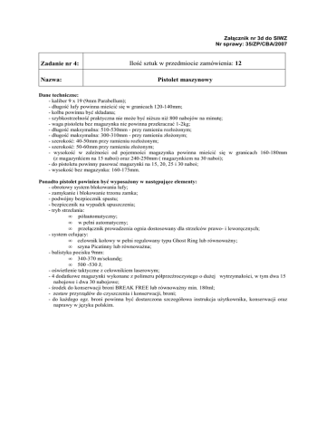 Załącznik nr 3d do SIWZ Nr sprawy: 35/ZP/CBA/2007 Zadanie nr 4: Nazwa: Ilość sztuk w przedmiocie zamówienia: 12 Pistolet maszynowy Dane techniczne: - kaliber 9 x 19 (9mm Parabellum); - długość lufy powinna mieścić się w granicach 120-140mm; - kolba powinna być składana; - szybkostrzelność praktyczna nie moŜe być niŜsza niŜ 800 nabojów na minutę; - waga pistoletu bez magazynka nie powinna przekraczać 1-2kg; - długość maksymalna: 510-530mm - przy ramieniu rozłoŜonym; - długość maksymalna: 300-310mm - przy ramieniu złoŜonym; - szerokość: 40-50mm przy ramieniu rozłoŜonym; - szerokość: 50-60mm przy ramieniu złoŜonym; - wysokość w zaleŜności od pojemności magazynka powinna mieścić się w granicach 160-180mm (z magazynkiem na 15 naboi) oraz 240-250mm ( magazynkiem na 30 naboi); - do pistoletu powinny pasować magazynki na 15, 20, 25 i 30 naboi; - wysokość bez magazynka: 160-175mm. Ponadto pistolet powinien być wyposaŜony w następujące elementy: - obrotowy system blokowania lufy; - zamykanie i blokowanie trzonu zamka; - podwójny bezpiecznik spustu; - bezpiecznik na wypadek upuszczenia; - tryb strzelania: • półautomatyczny; • w pełni automatyczny; • przełącznik prowadzenia ognia dostosowany dla strzelców prawo- i leworęcznych; - system celujący: • celownik kołowy w pełni regulowany typu Ghost Ring lub równowaŜny; • szyna Picatinny lub równowaŜna; - balistyka pocisku 9mm: • 340-370 m/sekundę; • 500 -530 J; - oświetlenie taktyczne z celownikiem laserowym; - 4 dodatkowe magazynki wykonane z polimeru półprzeźroczystego o duŜej wytrzymałości, w tym dwa 15 nabojowe i dwa 30 nabojowe; - środek do konserwacji broni BREAK FREE lub równowaŜny min. 180ml; - zestaw przyrządów do czyszczenia i konserwacji, broni; - do kaŜdego egz. broni powinna być dostarczona szczegółowa instrukcja uŜytkownika, konserwacji oraz naprawy w języku polskim.