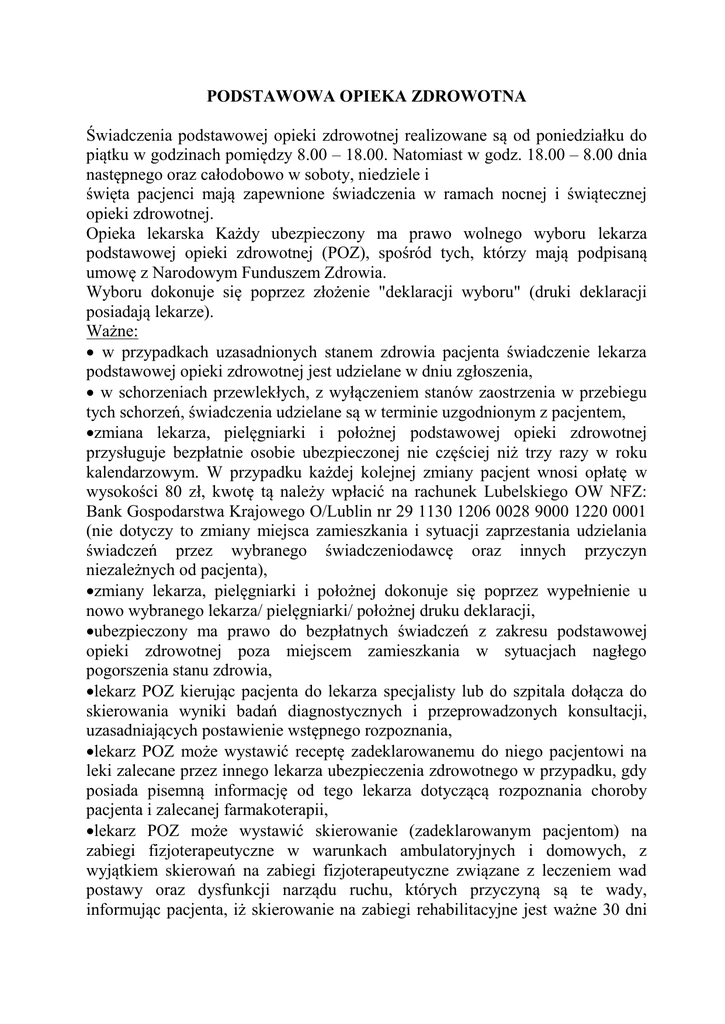 PODSTAWOWA OPIEKA ZDROWOTNA Świadczenia podstawowej opieki zdrowotnej realizowane są od poniedziałku do piątku w godzinach pomiędzy 8.00 – 18.00. Natomiast w godz. 18.00 – 8.00 dnia następnego oraz całodobowo w soboty, niedziele i święta pacjenci mają zapewnione świadczenia w ramach nocnej i świątecznej opieki zdrowotnej. Opieka lekarska Każdy ubezpieczony ma prawo wolnego wyboru lekarza podstawowej opieki zdrowotnej (POZ), spośród tych, którzy mają podpisaną umowę z Narodowym Funduszem Zdrowia. Wyboru dokonuje się poprzez złożenie "deklaracji wyboru" (druki deklaracji posiadają lekarze). Ważne: w przypadkach uzasadnionych stanem zdrowia pacjenta świadczenie lekarza podstawowej opieki zdrowotnej jest udzielane w dniu zgłoszenia, w schorzeniach przewlekłych, z wyłączeniem stanów zaostrzenia w przebiegu tych schorzeń, świadczenia udzielane są w terminie uzgodnionym z pacjentem, zmiana lekarza, pielęgniarki i położnej podstawowej opieki zdrowotnej przysługuje bezpłatnie osobie ubezpieczonej nie częściej niż trzy razy w roku kalendarzowym. W przypadku każdej kolejnej zmiany pacjent wnosi opłatę w wysokości 80 zł, kwotę tą należy wpłacić na rachunek Lubelskiego OW NFZ: Bank Gospodarstwa Krajowego O/Lublin nr 29 1130 1206 0028 9000 1220 0001 (nie dotyczy to zmiany miejsca zamieszkania i sytuacji zaprzestania udzielania świadczeń przez wybranego świadczeniodawcę oraz innych przyczyn niezależnych od pacjenta), zmiany lekarza, pielęgniarki i położnej dokonuje się poprzez wypełnienie u nowo wybranego lekarza/ pielęgniarki/ położnej druku deklaracji, ubezpieczony ma prawo do bezpłatnych świadczeń z zakresu podstawowej opieki zdrowotnej poza miejscem zamieszkania w sytuacjach nagłego pogorszenia stanu zdrowia, lekarz POZ kierując pacjenta do lekarza specjalisty lub do szpitala dołącza do skierowania wyniki badań diagnostycznych i przeprowadzonych konsultacji, uzasadniających postawienie wstępnego rozpoznania, lekarz POZ może wystawić receptę zadeklarowanemu do niego pacjentowi na leki zalecane przez innego lekarza ubezpieczenia zdrowotnego w przypadku, gdy posiada pisemną informację od tego lekarza dotyczącą rozpoznania choroby pacjenta i zalecanej farmakoterapii, lekarz POZ może wystawić skierowanie (zadeklarowanym pacjentom) na zabiegi fizjoterapeutyczne w warunkach ambulatoryjnych i domowych, z wyjątkiem skierowań na zabiegi fizjoterapeutyczne związane z leczeniem wad postawy oraz dysfunkcji narządu ruchu, których przyczyną są te wady, informując pacjenta, iż skierowanie na zabiegi rehabilitacyjne jest ważne 30 dni od daty wystawienia i w tym terminie pacjent powinien zarejestrować się w zakładzie realizującym świadczenia rehabilitacyjne. Rejestracja pacjentów na wyznaczone godziny odbywać się może w każdej formie: osobiście, telefonicznie lub za pośrednictwem osoby trzeciej. Lekarz POZ ma obowiązek zapewnić (od poniedziałku do piątku pomiędzy godz. 8.00 a 18.00) porady lekarskie w przychodni, w przypadkach medycznie uzasadnionych wizyty domowe a także funkcjonowanie gabinetu zabiegowego i punktu szczepień. W filiach świadczeniodawcy POZ dopuszcza się zapewnienie dostępności w czasie krótszym niż od 8.00-18.00, jeżeli w tych godzinach dany świadczeniodawca zapewnia dostęp do Świadczeń w innym miejscu. Wykaz niektórych świadczeń zdrowotnych wykonywanych przez lekarza podstawowej opieki zdrowotnej: 1. Świadczenia w zakresie profilaktyki: koordynuje wykonanie i dokonuje kwalifikacji do obowiązkowych szczepień ochronnych oraz zapewnia wykonywanie szczepień, zgodnie z odrębnymi przepisami, oraz informuje o szczepieniach zalecanych, uczestniczy w realizacji programów profilaktycznych, 2. Świadczenia w zakresie działań mających na celu rozpoznanie chorób: przeprowadza badanie podmiotowe i przedmiotowe pacjenta, planuje i koordynuje postępowanie diagnostyczne, stosownie do stanu zdrowia pacjenta, zleca wykonanie badań dodatkowych, a w szczególności laboratoryjnych i obrazowych, kieruje pacjenta na konsultacje specjalistyczne/ do jednostek lecznictwa zamkniętego w celu dalszej diagnostyki i leczenia, w przypadku gdy uzna to za konieczne, dokonuje interpretacji wyników badań i konsultacji wykonanych przez innych świadczeniodawców, orzeka o stanie zdrowia pacjenta w oparciu o osobiście przeprowadzone badanie i dokumentację medyczną, 3. Świadczenia w zakresie leczenia chorób: planuje i uzgadnia z pacjentem postępowanie terapeutyczne, stosownie do jego problemów zdrowotnych oraz zgodnie z aktualną wiedzą medyczną, zleca i monitoruje leczenie farmakologiczne, wykonuje zabiegi i procedury medyczne, kieruje do: lekarzy specjalistów, do oddziałów lecznictwa stacjonarnego, do zakładów opieki długoterminowej, pielęgniarskiej długoterminowej opieki domowej, leczenia uzdrowiskowego, orzeka o czasowej niezdolności do pracy lub nauki zgodnie z odrębnymi przepisami, 4. Świadczenia w zakresie działań mających na celu usprawnianie pacjenta: zleca wykonywanie zabiegów rehabilitacyjnych przez świadczeniodawców, zleca wydanie pacjentowi przedmiotów ortopedycznych i środków pomocniczych zgodnie z odrębnymi przepisami. Świadczenia pielęgniarki POZ Pielęgniarka realizuje kompleksową opiekę pielęgniarską, w szczególności: rozpoznaje warunki i potrzeby zdrowotne podopiecznych, rozpoznaje problemy pielęgnacyjne, planuje i realizuje opiekę pielęgnacyjną, ocenia skuteczność stosowanych procedur pielęgnacyjnych, realizuje zlecenia lekarskie, prowadzi edukację zdrowotną, promocję zdrowia i profilaktykę chorób. Realizacja opieki pielęgniarskiej następuje od poniedziałku do piątku, pomiędzy godz. 8.00 a 18.00 z wyłączeniem dni ustawowo wolnych od pracy. W uzasadnionych medycznie przypadkach świadczenia udzielane są w dniu zgłoszenia. W schorzeniach przewlekłych oraz w pozostałych przypadkach wynikających z zakresu zadań pie