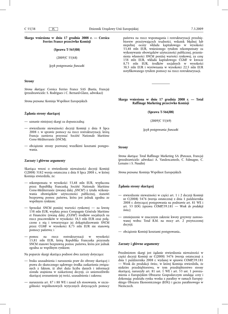 C 55/38 Dziennik Urzędowy Unii Europejskiej PL Skarga wniesiona w dniu 17 grudnia 2008 r. — Corsica Ferries France przeciwko Komisji (Sprawa T-565/08) (2009/C 55/68) Język postępowania: francuski 7.3.2009 państwa na rzecz wspomagania i restrukturyzacji przedsiębiorstw przeżywających trudności, wskutek błędnej lub niepełnej oceny wkładu kapitałowego w wysokości 53,48 mln EUR, wniesionego tytułem rekompensaty za wykonywanie obowiązków użyteczności publicznej, przeniesienia własności SNCM poniżej wartości rynkowej, za cenę 158 mln EUR, wkładu kapitałowego CGMF w kwocie 8,75 mln EUR, środków socjalnych w wysokości 38,5 mln EUR i wyrównania w wysokości 22,5 mln EUR notyfikowanego tytułem pomocy na rzecz restrukturyzacji. Strony Strona skarżąca: Corsica Ferries France SAS (Bastia, Francja) (przedstawiciele: S. Rodrigues i C. Bernard-Glanz, adwokaci) Strona pozwana: Komisja Wspólnot Europejskich Skarga wniesiona w dniu 17 grudnia 2008 r. — Total Raffinage Marketing przeciwko Komisji (Sprawa T-566/08) Żądania strony skarżącej (2009/C 55/69) — uznanie niniejszej skargi za dopuszczalną; — stwierdzenie nieważności decyzji Komisji z dnia 8 lipca 2008 r. w sprawie pomocy na rzecz restrukturyzacji, którą Francja zamierza przyznać Société Nationale Maritime Corse-Méditerranée (SNCM); Język postępowania: francuski — obciążenie strony pozwanej wszelkimi kosztami postępowania. Strony Zarzuty i główne argumenty Strona skarżąca: Total Raffinage Marketing SA (Puteaux, Francja) (przedstawiciele: adwokaci A. Vandencasteele, C. Falmagne, C. Lemaire i S. Naudin) Skarżąca wnosi o stwierdzenie nieważności decyzji Komisji C(2008) 3182 wersja ostateczna z dnia 8 lipca 2008 r., w której Komisja stwierdziła, że: Strona pozwana: Komisja Wspólnot Europejskich — rekompensata w wysokości 53,48 mln EUR, wypłacona przez Republikę Francuską Société Nationale Maritime Corse-Méditerranée (zwanej dalej „SNCM”) z tytułu wykonywania obowiązków użyteczności publicznej, stanowi bezprawną pomoc państwa, która jest jednak zgodna ze wspólnym rynkiem; — Sprzedaż SNCM poniżej wartości rynkowej — za kwotę 158 mln EUR, wypłata przez Compagnie Générale Maritime et Financière (zwaną dalej „CGFM”) środków socjalnych na rzecz pracowników w wysokości 38,5 mln EUR oraz połączone z nią i towarzyszące jej dokapitalizowanie SNCM przez CGMF w wysokości 8,75 mln EUR nie stanowią pomocy państwa; i — pomoc na rzecz restrukturyzacji w wysokości 15,81 mln EUR, którą Republika Francuska przyznała SNCM stanowi bezprawną pomoc państwa, która jest jednak zgodna ze wspólnym rynkiem; Na poparcie skargi skarżąca podnosi dwa zarzuty dotyczące: — braku uzasadnienia i naruszenia praw do obrony skarżącej i prawa do skutecznego sądowego środka zaskarżenia związanych z faktem, iż zbyt duża liczba danych i informacji została utajniona w zaskarżonej decyzji, co uniemożliwiło skarżącej zrozumienie jej treści, uzasadnienia i zakresu; — naruszenia art. 87 i 88 WE i zasad ich stosowania, w szczególności wspólnotowych wytycznych dotyczących pomocy Żądania strony skarżącej — stwierdzenie nieważności w części art. 1 i 2 decyzji Komisji nr C(2008) 5476 (wersja ostateczna) z dnia 1 października 2008 r. dotyczącej postępowania na podstawie art. 81 WE i art. 53 EOG (sprawa COMP/39.181 — Wosk do produkcji świec); — zmniejszenie w znacznym zakresie kwoty grzywny zastosowanej wobec Total R.M. na mocy art. 2 przytoczonej decyzji; — obciążenie Komisji kosztami postępowania.. Zarzuty i główne argumenty Przedmiotem skargi jest żądanie stwierdzenia nieważności w części decyzji Komisji nr C(2008) 5476 (wersja ostateczna) z dnia 1 października 2008 r. wydanej w sprawie COMP/39.181 — Wosk do produkcji świec, w której Komisja stwierdziła, że niektóre przedsiębiorstwa, w tym przedsiębiorstwo strony skarżącej, naruszyły art. 81 ust. 1 WE i art. 53 ust. 1 porozumienia o Europejskim Obszarze Gospodarczym ustalając ceny i dokonując podziału rynku wosku z parafiny w ramach Europejskiego Obszaru Ekonomicznego (EOG) i gaczu parafinowego w Niemczech.