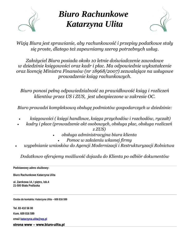 Biuro Rachunkowe Katarzyna Ulita Wizją Biura jest sprawianie, aby rachunkowość i przepisy podatkowe stały się proste, dlatego też zapewniamy szereg potrzebnych usług. Założyciel Biura posiada około 10 letnie doświadczenie zawodowe w dziedzinie księgowości oraz kadr i płac. Ma odpowiednie wykształcenie oraz licencję Ministra Finansów (nr 18968/2007) zezwalające na usługowe prowadzenie ksiąg rachunkowych. Biuro ponosi pełną odpowiedzialność za prawidłowość ksiąg i rozliczeń klientów przez US i ZUS, jest ubezpieczone w zakresie OC. Biuro prowadzi kompleksową obsługę podmiotów gospodarczych w dziedzinie: księgowości ( księgi handlowe, księga przychodów i rozchodów, ryczałt) kadry i płace (prowadzenie akt osobowych, obsługa płac, obsługa rozliczeń z ZUS) obsługa administracyjna biura klienta Pomoc w założeniu własnej firmy wypełnianie wniosków do Agencji Modernizacji i Restrukturyzacji Rolnictwa Dodatkowo oferujemy możliwość dojazdu do Klienta po odbiór dokumentów Podstawowy adres służbowy: Biuro Rachunkowe Katarzyna Ulita ul. Zamkowa 14, I piętro, lok.4 21-500 Biała Podlaska Osoba do kontaktu: Katarzyna Ulita – 609 816 599 Tel. 83 410 56 00 Kom. 609 816 599 email [email protected] strona www – www.biuro-ulita.pl Cennik ( w cenach netto) - do cen doliczany jest podatek VAT 23% Księgi handlowe do 20 dokumentów — 300,00 zł Od 21 do 50 dokumentów — 500,00 zł Od 51 do 80 dokumentów — 800,00 zł Od 81 do 110 dokumentów — 1100,00 zł Od 111 do 150 dokumentów—1500,00 zł od 151 do 200 dokumentów – 2000,00 zł Za każdy następny wpis—2,00 zł Księga przychodów i rozchodów oraz ryczałt od przychodów ewidencjonowanych do 10 dokumentów—70,00 zł Od 11 do 20 dokumentów—100,00 zł Od 21 do 50 dokumentów—150,00 zł Od 51 do 80 dokumentów—250,00zł Od 81 do 100 dokumentów—350,00 zł Od 101 do 150 dokumentów—550,00 zł Za każdy następny wpis — 1,50 zł Usługi kadrowo-płacowe obsługa kadrowo-płacowa 1 umowy o pracę—25,00 zl Obsługa kadrowo-płacowa 1 umowy cywilno prawnej—15,00 zł obsługa ZUS prowadzącego działalność—25,00 zł Koszt innych usług biura będzie ustalany indywidualnie w zależności potrzeb klienta