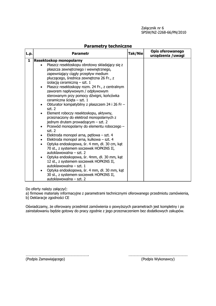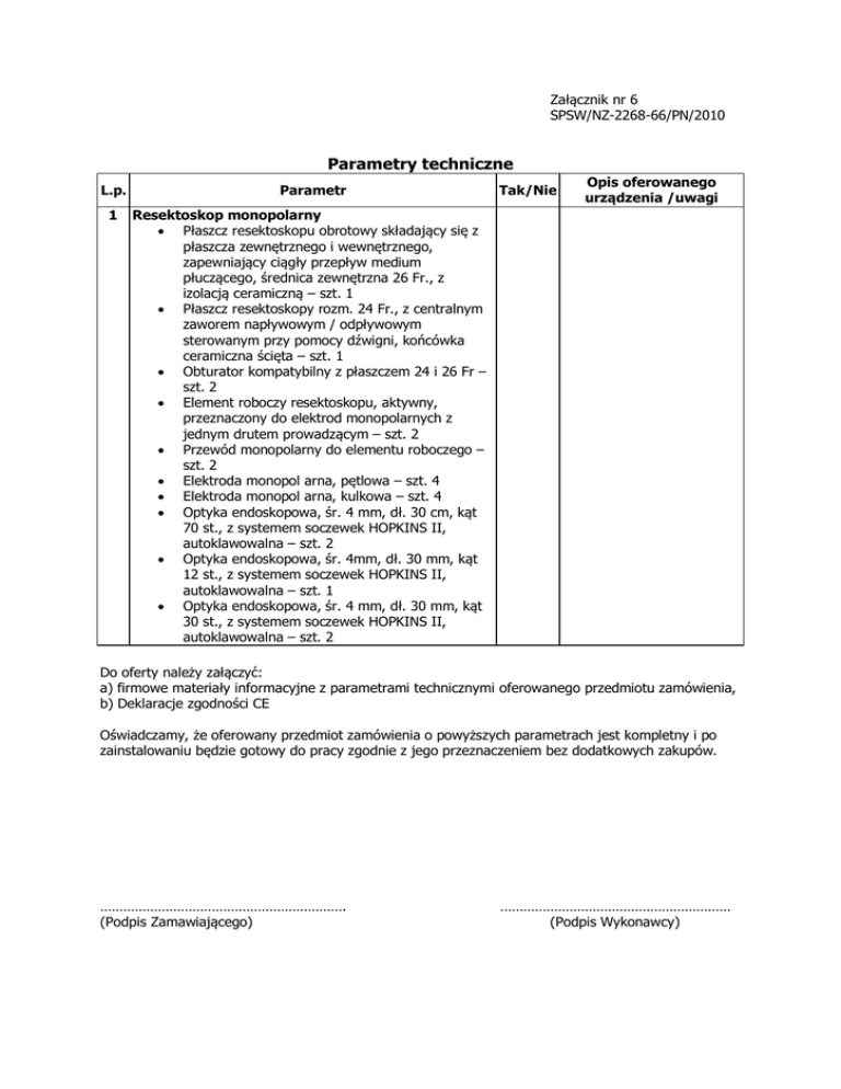 Załącznik nr 6 SPSW/NZ-2268-66/PN/2010 Parametry techniczne L.p. Parametr 1 Resektoskop monopolarny Płaszcz resektoskopu obrotowy składający się z płaszcza zewnętrznego i wewnętrznego, zapewniający ciągły przepływ medium płuczącego, średnica zewnętrzna 26 Fr., z izolacją ceramiczną – szt. 1 Płaszcz resektoskopy rozm. 24 Fr., z centralnym zaworem napływowym / odpływowym sterowanym przy pomocy dźwigni, końcówka ceramiczna ścięta – szt. 1 Obturator kompatybilny z płaszczem 24 i 26 Fr – szt. 2 Element roboczy resektoskopu, aktywny, przeznaczony do elektrod monopolarnych z jednym drutem prowadzącym – szt. 2 Przewód monopolarny do elementu roboczego – szt. 2 Elektroda monopol arna, pętlowa – szt. 4 Elektroda monopol arna, kulkowa – szt. 4 Optyka endoskopowa, śr. 4 mm, dł. 30 cm, kąt 70 st., z systemem soczewek HOPKINS II, autoklawowalna – szt. 2 Optyka endoskopowa, śr. 4mm, dł. 30 mm, kąt 12 st., z systemem soczewek HOPKINS II, autoklawowalna – szt. 1 Optyka endoskopowa, śr. 4 mm, dł. 30 mm, kąt 30 st., z systemem soczewek HOPKINS II, autoklawowalna – szt. 2 Tak/Nie Opis oferowanego urządzenia /uwagi Do oferty należy załączyć: a) firmowe materiały informacyjne z parametrami technicznymi oferowanego przedmiotu zamówienia, b) Deklaracje zgodności CE Oświadczamy, że oferowany przedmiot zamówienia o powyższych parametrach jest kompletny i po zainstalowaniu będzie gotowy do pracy zgodnie z jego przeznaczeniem bez dodatkowych zakupów. ………………………………………………………. (Podpis Zamawiającego) …………………………………………………… (Podpis Wykonawcy) L.p. Parametr 3 Aparat do hemodializy Budowa modułowo – kompaktowa Możliwość zmiany wszystkich modułów i opcji pomiędzy aparatami Automatyczne profilowania sodu i ultrafiltracji Graficzny podkład istotnych stanów pracy urządzenia Możliwość zasilania z baterii w przypadku braku zasilania z sieci energetycznej przez co najmniej 15 minut Kontrolowana w sposób ciągły ultrafiltracja – pomiar objętościowy Możliwość realizacji dializy na dializatorze HIGH – FLUX Możliwość wykonania hemodializy octanowej i wodorowęglanowej na ogólnie dostępnych koncentratach Regulowany przepływ dializatu od min. 300 – 700 ml/min. Łatwo odstępny punkt pobierania próbki dializatu do analizy Automatyczne testowanie aparatu przed dializą i możliwość kontroli parametrów w trakcie zabiegu dializy Płynna regulacja przepływu pompy krwi w zakresie od min 10 do 400 ml/min (skok co 5 ml) Możliwość pomiaru klirensu mocznika metodą „On - Line” Płynna regulacja przepływu pompy krwi Pompa heparyny z możliwością podawania żądanego „bolusa” Ultrafiltracja sekwencyjna – sucha bez dializatu Programy dezynfekcji chemicznej z procedurą podgrzewania środka dezynfekcyjnego Programy dezynfekcji termicznej Opcja do wytwarzania koncentratu dwuwęglanowego z suchego składnika na jeden zabieg HD Filtracja płynu dializacyjnego (ultra czysty dializat) Możliwość współpracy z centralnym systemem komputerowym System centralnego blokowania kół aparatu Oprogramowanie i komunikacja z użytkownikiem w języku polskim Graficzny ekran, nie emitujący promieniowania 9norma emisji jak dla ekranów ciekłokrystalicznych) Archiwizacja wykonywanej dezynfekcji Producent sprzętu, kraj, pochodzenie - Podać Rok produkcji: 2009 – 2010 Autoryzowany serwis na terenie Polski Podać nazwę i siedzibę serwisu Typ sprzętu – podać Tak/Nie Opis oferowanego urządzenia /uwagi Gwarancja minimum 24 miesiące Gwarancja zapewnienia zakupu części zamiennych przez okres 10 lat Czas reakcji serwisu 24 godzin Instrukcja w języku polskim Szkolenie obsługi, szkolenie personelu technicznego przy odbiorze technicznym produktu Do oferty należy załączyć: a) firmowe materiały informacyjne z parametrami technicznymi oferowanego przedmiotu zamówienia, b) Deklaracje zgodności CE Oświadczamy, że oferowany przedmiot zamówienia o powyższych parametrach jest kompletny i po zainstalowaniu będzie gotowy do pracy zgodnie z jego przeznaczeniem bez dodatkowych zakupów. ………………………………………………………. (Podpis Zamawiającego) …………………………………………………… (Podpis Wykonawcy) L.p. Parametr 2 Mikroskop diagnostyczny - laryngologiczny Oświetlenie (zimne światło): oświetlacz dwutorowy – halogen 150W Natężenie światła w polu operacyjnym: 50 tys Lux Możliwość wymiany toru oświetlenia w trakcie zabiegu bez konieczności ingerencji mechanicznej w oświetlacz. Chłodzony bezszumowy. Kompatybilny z endoskopami STORZ Nasadka: stereoskopowa prosta Regulacja rozstawu okularów: 55 – 75 mm Głowica mikroskopu: stereoskopowa; położenie głowicy regulowane w sposób płynny, uchwytem przy głowicy z jednoczesną możliwością szybciej blokady położenia Zmieniacz powiększeń skokowy: pięciopozycyjny Okulary stereoskopwe szerokokątne: 10x pole widzenia 25 mm oraz 25x pole widzenia 10mm Regulacja dioptryjna: +/-5 dioptrii Powiększenie minimalne i maksymalne: minimum1,5x do 47x Ramiona: prostowodowi, samohamowane zapewniające stabilność głowicy mikroskopu Powiększenia osiągane przy obiektywie f=200 i okularze 10x, 5x, 8x, 12x, 20x Powiększenia osiągane przy obiektywie f=400 i okularze 10x opcja do krtani: 1,5x, 2,5x, 4x, 6x, 10x Zakres przesuwu mikroskopu w pionie – zasięg ramion: 700mm Ogniskowanie precyzyjne mikroskopu - mini zoom w obiektywie: +-7,5mm Pochylenie przód/tył głowicy mikroskopu:60 st Obrót mikroskopu wokół osi pionowej w zakresie: 330 st. Odległość czołowa (od soczewki do obiektu): odległość czołowa obiektywu 195 mm obiektyw o ogniskowej f=200mm do zabiegów na uchu, odległość czołowa 386 mm obiektyw o ogniskowej f=400mm do zabiegów na krtani. Obiektywy wymienne w tak zwanym systemie szybkiej zmiany bez konieczności używania