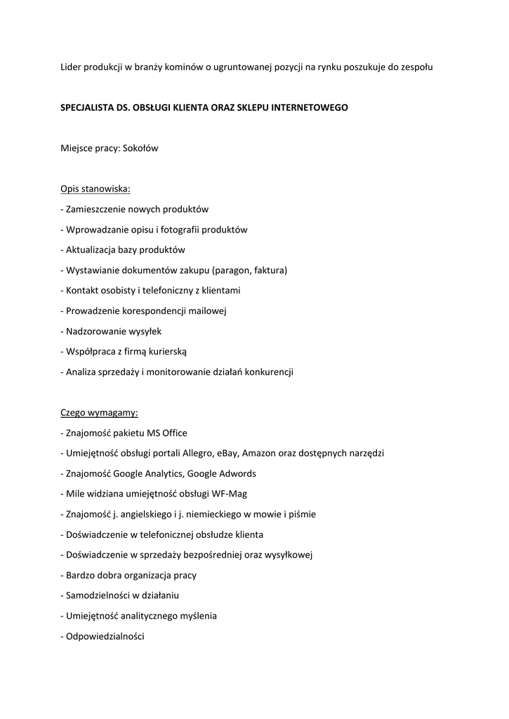 Lider produkcji w branży kominów o ugruntowanej pozycji na rynku poszukuje do zespołu SPECJALISTA DS. OBSŁUGI KLIENTA ORAZ SKLEPU INTERNETOWEGO Miejsce pracy: Sokołów Opis stanowiska: - Zamieszczenie nowych produktów - Wprowadzanie opisu i fotografii produktów - Aktualizacja bazy produktów - Wystawianie dokumentów zakupu (paragon, faktura) - Kontakt osobisty i telefoniczny z klientami - Prowadzenie korespondencji mailowej - Nadzorowanie wysyłek - Współpraca z firmą kurierską - Analiza sprzedaży i monitorowanie działań konkurencji Czego wymagamy: - Znajomość pakietu MS Office - Umiejętność obsługi portali Allegro, eBay, Amazon oraz dostępnych narzędzi - Znajomość Google Analytics, Google Adwords - Mile widziana umiejętność obsługi WF-Mag - Znajomość j. angielskiego i j. niemieckiego w mowie i piśmie - Doświadczenie w telefonicznej obsłudze klienta - Doświadczenie w sprzedaży bezpośredniej oraz wysyłkowej - Bardzo dobra organizacja pracy - Samodzielności w działaniu - Umiejętność analitycznego myślenia - Odpowiedzialności - Chęci do pracy - Entuzjazm w działaniu - Łatwość nawiązywania kontaktów - Komunikatywność - Dobra dykcja oraz miły głos Co oferujemy: - Umowę o pracę - Stałe godziny pracy (8-16) - Stacjonarną pracę w siedzibie firmy - Samodzielne stanowisko pracy - Bardzo dobra lokalizacja - Stałe wynagrodzenie + prowizja - Przyjazne i bezpieczne środowisko pracy - Możliwość rozwoju zawodowego i pracę dającą satysfakcję