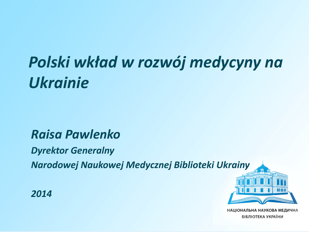 Polski wkład w rozwój medycyny na Ukrainie Raisa Pawlenko Dyrektor Generalny Narodowej Naukowej Medycznej Biblioteki Ukrainy 2014 Narodowa Naukowa Medyczna Biblioteka Ukrainy Zapraszamy do Biblioteki ! Biblioteka współpracuje z instytucjami informacyjnymi i badawczymi z 20 krajów Długoletnia współpraca Biblioteki z polskimi partnerami Academia Medyczna, Bialystok Slaska Academia Medyczna, Katowice Biblioteką Collegium Medicum Uniwersytetu Jagiellońskiego, Krakow Biblioteką Warszawskiego Uniwersytetu Medycznego, Warszawa Glowna Biblioteka Lekarska, Warszawa Okręgowa Izba Lekarska, Warszawa Towarzystwo neurologiczne, Warszawa Academia Medyczna, Wroclaw 2011 Centrum Polskiej Książki Medycznej w Narodowej Naukowej Medycznej Biblioteki (Kijow) Centrum Polskiej Książki Medycznej na witrynie internetowej Biblioteki Polska literatura medyczna w otwartym dostępie dla czytelników Polska literatura medyczna w otwartym dostępie dla czytelników Wirtualna wystawa "Polskie książki medyczne" Wystawa książek z kolekcji kardiochirurga światowej sławy Zbigniewa Religi Prezentacja i wystawa polskiej literatury Prezentacja i wystawa polskiej literatury Prezentacja i wystawa polskiej literatury Prezentacja i wystawa polskiej literatury Odwiedziny polskich przyjaciół Biblioteki Odwiedziny polskich przyjaciół Biblioteki Odwiedziny polskich przyjaciół Biblioteki Odwiedziny polskich przyjaciół Biblioteki Odwiedziny polskich przyjaciół Biblioteki Przyjazń Polsko-Ukraińska ma dawną historie i dla tego tak obficie owocuje w nasze dni Partnerzy piszą swoje wrażenia w Księdze gości Biblioteki Partnerzy piszą swoje wrażenia w Księdze gości Biblioteki Opinie polskich przyjaciół w Księdze gości Biblioteki Konsul Generalny RP w Ukrainie Rafał Wolski Lekarz Krzysztof Krolikowski Opinie polskich przyjaciół w Księdze gości Biblioteki Wiceprezes Okręgowej Izby Lekarskiej w Warszawie Krzysztof Makuch Prezes zarządu spółki Szpital w Knurowie Michał Ekkert Wizyta dyrektora i wicedyrektora Biblioteki do Polski Polskie wyróżnienie Narodowej Naukowej Medycznej Biblioteki Ukrainy, reprezentowanej przez dyrektora Raisą Pavlenko Polskie wyróżnienie Narodowej Naukowej Medycznej Biblioteki Ukrainy, reprezentowanej przez dyrektora Raisą Pavlenko Polskie wyróżnienie Narodowej Naukowej Medycznej Biblioteki Ukrainy, reprezentowanej przez dyrektora Raisą Pavlenko Seria słowników biobliohrafichnyh “Medycyna na Ukrainie” rozpoczęta w 1997 roku Polscy lekarze które pracowały na Ukrainie Henryk Karol Kadyi (1851-1911) Wlodzimierz Wysokowicz (1854-1912) Polscy lekarze które pracowały na Ukrainie Andrzej Obrzut (1854-1910) Julian Peński (1859-1920) Polscy lekarze które pracowały na Ukrainie Wlodzimierz Podwysocki (1857-1913) Leon Popielski (1866-1920) Polscy lekarze które pracowały na Ukrainie Leonard Bronisław Radziszewski (1838–1914) Jan Rudof Raczyński (1865-1918) Polscy lekarze które pracowały na Ukrainie Wlodzimierz Antonowicz Anton Slawikowski Anton Smidowicz Ludwig Górecki Marian Raciborski Biobliohrafichny indeks do 160-lecia Wlodzimierza Wysokowicza Dziękuje za uwagę Dyrektor Generalny Raisa Pawlenko E-mail: [email protected] Tel.: + 38 (044) 234 51 97