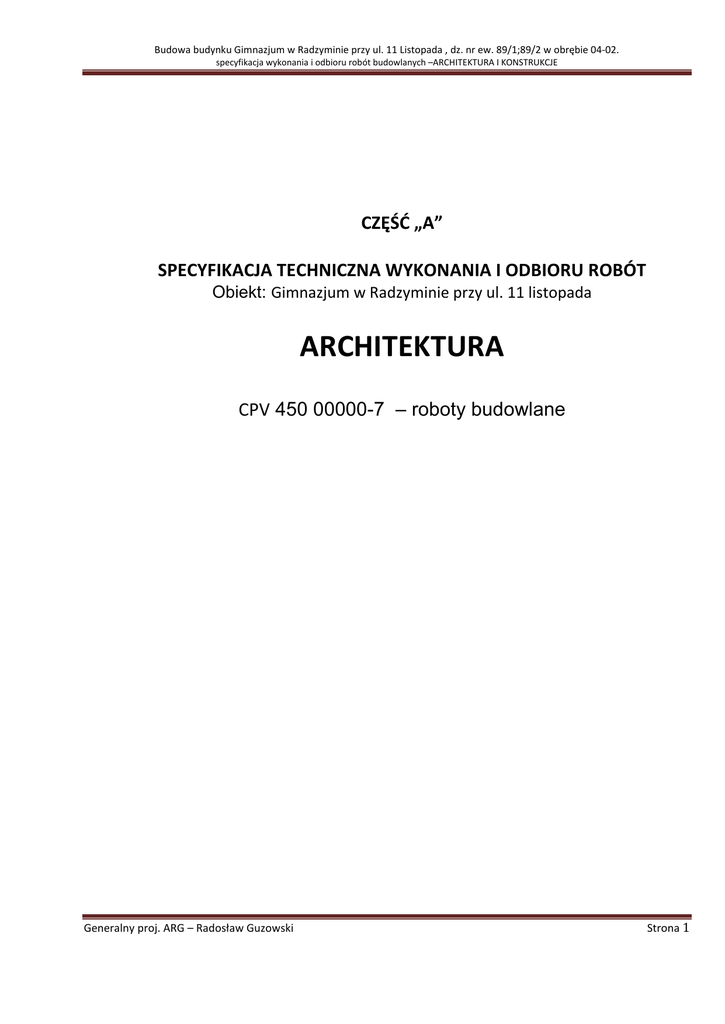 Budowa budynku Gimnazjum w Radzyminie przy ul. 11 Listopada , dz. nr ew. 89/1;89/2 w obrębie 04-02. specyfikacja wykonania i odbioru robót budowlanych –ARCHITEKTURA I KONSTRUKCJE CZĘŚĆ „A” SPECYFIKACJA TECHNICZNA WYKONANIA I ODBIORU ROBÓT Obiekt: Gimnazjum w Radzyminie przy ul. 11 listopada ARCHITEKTURA CPV 450 00000-7 – roboty budowlane Generalny proj. ARG – Radosław Guzowski Strona 1 Budowa budynku Gimnazjum w Radzyminie przy ul. 11 Listopada , dz. nr ew. 89/1;89/2 w obrębie 04-02. specyfikacja wykonania i odbioru robót budowlanych –ARCHITEKTURA I KONSTRUKCJE Spis treści A. Ogólna specyfikacja techniczna 3 1. Częśćogólna 2 1.1. Nazwa zamówienia 2 1.2. Przedmiot i zakres robót budowlanych 2 1.3. Opis prac towarzyszących i robót tymczasowych 3 1.4. Informacje o terenie budowy 4 1.5. Przekazanie placu budowy 4 1.6. Zabezpieczenie interesów osób trzecich 6 1.7. Wymagania dotyczące ochrony środowiska 6 1.8. Bezpieczeństwo i higiena pracy 7 1.9. Ochrona przeciwpoŜarowa 10 1.10. Wymagania dotyczące organizacji ruchu 11 1.11. Nazwy i kody robót 11 1.12. Określenia podstawowe 11 2. Wymagania dotyczące właściwości wyrobów 13 3. Wymagania dotyczące sprzętu i maszyn 13 4. Wymagania dotyczące środków transportu 13 5. Wymagania dotyczące wykonania robót 14 6. Kontrola jakości, badania 16 7. Wymagania dla obmiarów robót 16 8. Zasady odbioru robót budowlanych 17 9. Podstawa płatności 18 10. Dokumenty odbioru robót 19 UWAGA: Wszelkie nazwy własne produktów, materiałów i urządzeń przywołane w niniejszym projekcie należy traktować jako przykładowe, służące określeniu pożądanego standardu wykonania i określeniu niezbędnych właściwości i wymogów założonych w dokumentacji technicznej dla danych rozwiązań. Dopuszcza się zastąpienie proponowanych rozwiązań (w oparciu o wyroby innych producentów), pod warunkiem spełnienia określonych wymagań pod względem parametrów technicznych, funkcjonalnych i użytkowych wskazanych szczegółowo w dokumentacji projektowej. Generalny proj. ARG – Radosław Guzowski Strona 2 Budowa budynku Gimnazjum w Radzyminie przy ul. 11 Listopada , dz. nr ew. 89/1;89/2 w obrębie 04-02. specyfikacja wykonania i odbioru robót budowlanych –ARCHITEKTURA I KONSTRUKCJE A. OGÓLNA SPECYFIKACJA TECHNICZNA 1. CZĘŚĆOGÓLNA 1.1. Nazwa zamówienia Przedmiotem niniejszej ogólnej specyfikacji technicznej (OST) są wymagania ogólne dotyczące wykonania i odbioru robót budowlanych budowy budynku Gimnazjum w Radzyminie przy ul. 11 listopada wraz z zagospodarowaniem terenu i infrastrukturą dz. nr ew. 89/1;89/2 w obrębie 04-02. 1.2. Przedmiot i zakres robót budowlanych Przedmiotem niniejszej specyfikacji technicznej sąprzepisy i wymagania dotyczące wykonania i odbioru robót obejmujących w szczególności wymagania w zakresie właściwości materiałów, prawidłowości wykonania wszystkich rodzajów robót określonych zakresem robót ujętych w przedmiarze, wymagania dla stosowanych materiałów oraz użytego sprzętu i narzędzi. Specyfikacja Techniczna Wykonania i Odbioru Robót Budowlanych dotyczy projektu wykonawczego w części architektury, architektury wnętrz i drobnych form architektonicznych. 1.2.1. Założenia funcjonalno-przestrzenne Funkcje projektowanego obiektu związane z podstawową działalnością placówki szkolnictwa publicznego : Szkoła- Gimnazjum – zespół pomieszczeń związanych z prowadzeniem zajęś szkolnych. Sala sportowa – miejsce prowadzenia zajęć wychowania fizycznego w ramach zajęć szkolnych i dodatkowych. Stołówka szkolna z zapleczem kuchennym – funkcja gastronomiczna dla potrzeb szkoły. funkcje pomocnicze – zaplecza Sali sportowej , szatnie i inne pomieszczenia wspomagające funkcję podstawową – szkolną. funkcje obsługi technicznej –pomieszczenia techniczne , kotłownia, rozdzielnie itp. potrzebne dla prawidłowego funkcjonowania obiektu 1.2.2. Architektura. W zakres przewidzianych do wykonania robót wchodzą: Roboty budowlane –budowa budynku. Roboty budowlane wewnętrzne –ogólnobudowlane roboty budowlane wewnętrzne -wystroju wnętrz. Roboty budowlane zewnętrzne -elewacjeRoboty montażowe urządzeń i wyposażenia technologicznego. Roboty budowlane zewnętrzne -małej architektury a. Roboty budowlane – budowa budynku . - wykonanie fundamentów (ławy i stopy) żelbetowych, - wymurowanie scian fundamentowych z izolacjami - wykonanie murów ścian żelbetowych i murowanych . - wykonanie konstrukcji stropów żelbetowych i schodów, oraz wykonanie konstrukcji stropodachu i dachu płaskiego . b. Roboty budowlane wewnętrzne ogólnobudowlane -wykonanie ścianek działowych -wykonanie obudów pionów instalacyjnych. -wykonanie izolacji przeciwwilgociowych poziomych i pionowych -wykonanie izolacji termicznej - poziomych -wykonanie izolacji termicznej pionowej -montaż stolarki wewnętrznej i zewnętrznej -montaż ślusarki wewnętrznej i zewnętrznej -montaz balustrad klatki schodowej b. Roboty budowlane wewnętrzne wystroju wnętrz -wykonanie tynków i okładzin wewnętrznych -montaz parapetów -malowanie ścian i sufitów Generalny proj. ARG – Radosław Guzowski Strona 3 Budowa budynku Gimnazjum w Radzyminie przy ul. 11 Listopada , dz. nr ew. 89/1;89/2 w obrębie 04-02. specyfikacja wykonania i odbioru robót budowlanych –ARCHITEKTURA I KONSTRUKCJE c. Roboty budowlane zewnętrzne – elewacje - wykonanie tynków i okładzin zewnętrznych - wykonanie obróbek blacharskich - wykonanie pokrycia dachu i wykończeń attyk. d. Roboty montażowe urządzeń i wyposażenia technologicznego - montaż elementów wyposażenia i zabudowy zaplecza kuchennego - montaż zabudowy szatni - montaż zabudowy szaf wbudowanych - dostawa ruchomego wyposażenia sal szkolnych. e. Roboty zewnętrzne małej architektury -wykonanie elementów małej architektury -wykonanie nawierzchni chodników, parkingów i dróg wewnetrznych -wykonanie trawników i nas