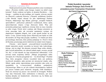 Komentarz do Ewangelii Niedziela, 4 grudnia 2016 Dzięki proroctwom postać Mesjasza przybiera coraz wyraźniejsze zarysy: „Wyrośnie różdżka z pnia Jessego, wypuści się odrośl z jego korzenia”. Kiedy wydawać się będzie, że dynastia Dawidowa — tron Jessego — podobna do pnia uschłego, już wygasła, wówczas narodzi się Zbawiciel z pokornej Dziewicy z Nazaretu, poślubionej Józefowi z rodu Dawida. Izajasz ukazuje Go jako napełnionego Duchem Świętym, obdarzonego Jego darami, gotowego „rozsądzić biednych sprawiedliwie”, podwyższyć pokornych i uciśnionych, którzy zajmą uprzywilejowane miejsce w Jego zbawczym dziele. Więc pod przenośnią pokojowego współżycia zwierząt, które na mocy instynktu są sobie wrogie, Prorok mówi o pokoju, jaki Mesjasz przyniesie na świat, pouczając ludzi, jak zwyciężać namiętności czyniące ich drapieżnymi względem drugich, oraz w jaki sposób kochać się jak bracia. A więc „korzeń Jessego [Jezus Zbawiciel] stać będzie na znak dla narodów; do Niego ludy przyjdą z modlitwą”, To właśnie jest obraz powszechnego zbawienia, który później podejmuje św. Paweł w liście do Rzymian, przytaczając prawie dosłownie ten ostatni wiersz Izajasza. Chrystus — mówi Apostoł — przyszedł zbawić wszystkich ludzi; działał wprawdzie przede wszystkim na korzyść ludu żydowskiego, którego „stal się sługą” dla okazania wierności Boga wobec obietnic, jakie uczynił patriarchom, nie odrzucił jednak pogan, owszem, przyjął ich, aby i w nich okazało się Jego niezmierzone miłosierdzie. A oto powraca temat wzajemnej miłości: „Dlatego przygarniajcie siebie nawzajem, bo i Chrystus przygarnął was — ku chwale Boga”. Przykład Pana, który przygarnia i zbawia wszystkich ludzi, jest podstawą życzliwych stosunków, jakie powinni oni utrzymywać między sobą. Miłość, zgoda, pokój, zapowiedziane przez proroków jako cechy ery mesjańskiej, są w rzeczywistości ośrodkiem posłannictwa Chrystusowego. Mimo to, po tylu wiekach chrześcijaństwa, ludzkość jest jeszcze rozdarta przez nienawiść, niezgodę, walki bratobójcze. Świat nie otworzył się jeszcze i nie nawrócił do Ewangelii. Wołanie więc Jana Chrzciciela, które rozbrzmiewa w Adwencie, jest teraz bardziej aktualne niż kiedykolwiek: „Nawróćcie się, bo bliskie jest królestwo niebieskie”. Polski Katolicki Apostolat imienia Świętego Jana Pawła II prowadzony przez Towarzystwo Chrystusowe dla Polonii Zagranicznej Ksiądz Wiesław Berdowicz SChr. Biuro Apostolatu: 113 Gloster Rd. Lawrenceville, GA 30044-4470 tel.: 770-935-1958 e-mail: [email protected] Rada Polskiego Apostolatu: Wiktor Błach Wanda Komor Elżbieta Rutkowska Maria Nowina-Konopka Paweł Chęć Grzegorz Kwiatkowski Msze święte: Każdej niedzieli o 14:00 St. Marguerite d'Youville, 85 Gloster Rd. Lawrenceville, GA 30044 Pierwsza i druga niedziela miesiąca o godz. 19:00 "Mary Our Queen" 6260 The Corners Parkway, Norcross, GA 30092 Spowiedź święta: 30 minut przed każdą Mszą świętą. Biuletyn: 4 grudnia 2016 2 niedziela adwentu Pokój zakwitnie, kiedy Pan przybędzie. MOQ I czytanie II czytanie Genowefa Klas Anna Górczyńska Składki 27 listopada St Marguerite $517 II składka $171 Potrzebna tygodniowa składka $1500. Serdeczne Bóg zapłać za wsparcie. KALENDARZ NA BOŻE NARODZENIE 2016/2017 4, 11 i 18 grudnia – niedziela – Sakrament Spowiedzi od godz. 13:00 *************************************************************************************************************** Intencje Mszalne Niedziela, 4 grudnia 2016 Md'Y - 2:00pm + Stanisław Mądrzyk ++ Zdzisław Zamaryka (6. rocz.), Andrzej Strumiłło MOQ – 7:00pm Dziękczynna i o Boże błogosławieństwo dla rodziny Adamczyk Czwartek, 8 grudnia 2016 Md’Y – 8:30pm Niedziela, 11 grudnia 2016 Md'Y – 2:00pm OGŁOSZENIA Służba liturgiczna 4 grudnia 2016 2:00pm St. Marguerite I czytanie Paweł Chęć II czytanie Adam Mider Szafarze Paweł Chęć Adam Śniady 3 grudnia, sobota – Wieczerza Wigilijna o godzinie 18:00 w Sali Parafialnej. 8 grudnia, czwartek – Uroczystość Niepokalanego Poczęcia NMP, Msza święta o 20:30 24 grudnia, sobota – Pasterka o godz. 22:00 25 grudnia, niedziela – Dzień Bożego Narodzenia, Msza święta o godz. 14.00. 26 grudnia, poniedziałek – Świętego Szczepana, Msza święta o godz. 20:00. 31 grudnia, sobota – Msza święta na zakończenie Roku o godz. 20:15 21:00 - Bal Sylwestrowy w Sali Parafialnej kościoła St. Marguerite d’Youville. 1 stycznia, niedziela – Nowy Rok – Uroczystość Bożej Rodzicielki. Msza święta o godz. 14:00 w Lawrenceville oraz o 19:00 w Norcross. 8 stycznia, niedziela – Uroczystość Objawienia Pańskiego – Trzech Króli. Poświęcenie kredy, kadzidła i wody podczas Mszy świętej o godz. 14:00 w Lawrenceville oraz o 19:00 w Norcross.