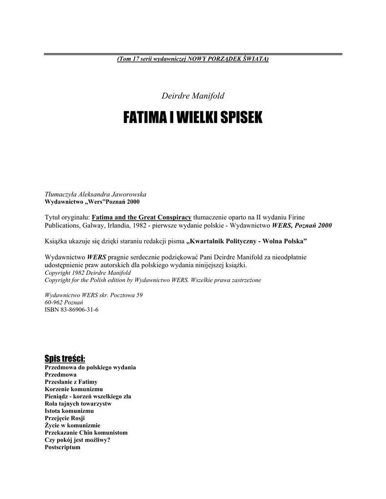 (Tom 17 serii wydawniczej NOWY PORZĄDEK ŚWIATA) U Deirdre Manifold FATIMA I WIELKI SPISEK Tłumaczyła Aleksandra Jaworowska Wydawnictwo „Wers”Poznań 2000 Tytuł oryginału: Fatima and the Great Conspiracy tłumaczenie oparto na II wydaniu Firine Publications, Galway, Irlandia, 1982 - pierwsze wydanie polskie - Wydawnictwo WERS, Poznań 2000 U U Książka ukazuje się dzięki staraniu redakcji pisma „Kwartalnik Polityczny - Wolna Polska” Wydawnictwo WERS pragnie serdecznie podziękować Pani Deirdre Manifold za nieodpłatnie udostępnienie praw autorskich dla polskiego wydania ninijejszej książki. Copyright 1982 Deirdre Manifold Copyright for the Polish edition by Wydawnictwo WERS. Wszelkie prawa zastrzeżone Wydawnictwo WERS skr. Pocztowa 59 60-962 Poznań ISBN 83-86906-31-6 Spis treści: U Przedmowa do polskiego wydania Przedmowa Przesłanie z Fatimy Korzenie komunizmu Pieniądz - korzeń wszelkiego zła Rola tajnych towarzystw Istota komunizmu Przejęcie Rosji Życie w komunizmie Przekazanie Chin komunistom Czy pokój jest możliwy? Postscriptum PRZEDMOWA DO POLSKIEGO WYDANIA U Początkiem nieszczęść, jakie dotykają ludzkość, było kłamstwo. W ogrodzie rajskim Ewa została okłamana przez węża. Następnie przekonała swego męża Adama, aby zjadł zakazany owoc. Gdy Bóg ukarał Adama, przemówił do węża: „Ponieważ to uczyniłeś, …wprowadzam nieprzyjaźń między ciebie i niewiastę, między potomstwo twoje a potomstwo jej. Ono zmiażdży ci głowę, a ty zmiażdżysz mu piętę” (Rdz. 3,15). To był początek wojny między Niewiastą a wężem, między Jej potomstwem a potomstwem węża; wojny duchowej, jaka miała toczyć się na ziemi. W wojnie muszą brać udział walczący. Ogromnie ważne jest to, by znać taktykę wroga. Różni papieże rozpoznawali owych walczących po stronie wroga i przestrzegali katolików przed zagrożeniem, jakie stanowili nie tylko dla katolików, ale dla całej ludzkości, wszystkich dzieci Adama. Papież Leon XII nazwał masonerię głównym wrogiem Kościoła katolickiego, a Leon XIII nakazał wszystkim katolikom aby zerwali maskę wolnomularstwu. To, że nie zostało to dokonane, stanowi miarę wpływu masonów wewnątrz Kościoła, gdyż masoni dobrze wiedzą, że nigdy nie osiągnęliby swoich celów w otwartej walce. Musieli szukać innych sposobów. Oto cytat z Protokołów Mędrców Syjonu: „Przenikniemy do samego serca Watykanu i bądźcie pewni, że nie opuścimy go dopóki nie rozbijemy jego potęgi. Król Żydowski będzie prawdziwie Papieżem Wszechświata, Patriarchą Kościoła Międzynarodowego…” (Protokół XVII) U U U U Gdy Jej żołnierze znaleźli się w prawdziwym niebezpieczeństwie, Niewiasta zstąpiła z nieba aby prowadzić swoje dzieci. Kiedy nieprzyjaciel uderzył w okresie Reformacji, przyszła do Gwadelupy, gdzie łaskawie zostawiła swój wizerunek, obraz, którego ludzka ręka nie zdołałaby namalować. Nastąpiło wiele cudownych nawróceń - 8 milionów w ciągu niespełna trzech lat. W 1830 r. Matka Boża przybyła na Rue du Bac w Paryżu, stąd mamy Jej medalik, znany jako Cudowny Medalik. Francja, kraj najbardziej wyróżniony, została pobłogosławiona objawieniami Matki Bożej w La Salette w 1846 roku, a następnie w Lourdes w 1858 roku, gdzie też Matka Boża potwierdziła, że jest Niepokalaną. W roku 1879 Niewiasta w sposób niezwykły przybyła do Knock w Irlandii, gdzie poprzez niemy obraz ostrzegła przed nadchodzącymi wydarzeniami. W obrazie tym Baranek ukazał się na ołtarzu, z którego wyrastał krzyż otoczony przez wielbiących aniołów. Św. Jan z mszałem w ręku sprawował Najświętszą Ofiarę; podniósł on rękę jakby nauczając, choć piętnaście osób w ciszy śledzących obraz przez trzy godziny, nie słyszało ani słowa. Czy powtarzał on słowa z Apokalipsy: Oto Baranek, który wygląda jak baranek, a przemawia jak smok? Niewiasta stała u boku Jana spoglądając ku niebu ze wzniesionymi rękami, z koroną na głowie. Obok Niej - pochylony w modlitwie św. Józef. Mały chłopiec, który także był świadkiem cudu, zauważył, że stronice mszału poruszają się i że Baranek spogląda na Matkę Bożą. Wizja ta była milcząca i trwała trzy godziny. Stało się to 21 sierpnia 1879 roku. Na początku tejże dekady Cadorna pomaszerował na Rzym, a 20 września o godzinie szóstej rano papież Pius IX wywiesił białą flagę. W tym samym czasie Pike i Mazzini ustanowili 20 września najwyższy obrządek - ryt masoński, od którego bierze nazwę obiediencja wolnomularska. Ogłoszono też wówczas dogmat o nieomylności papieża, a świętego Józefa obwołano patronem Kościoła powszechnego. W 1917 roku Bóg posłał Matkę Bożą do Fatimy aby przestrzec ludzkość przed konsekwencjami grzechu. Troje dzieci, Łucja, Franciszek i Hiacynta, było przygotowanych przez Anioła Stróża Portugalii, który nauczył ich jak się modlić i zatopić w Bogu, na przyjście Maryi. Matka Boża objawiała się 13 dnia każdego miesiąca od maja do października, a były to miesiące, w ciągu których Lenin i Trocki zdążali do Moskwy. 13 lipca Maryja ukazała dzieciom wizję piekła, po czym oświadczyła: „Zobaczyliście piekło, dokąd idą dusze biednych grzeszników. Aby ich uratować, Bóg życzy sobie ustanowienia na świecie nabożeństwa do mego Niepokalanego Serca”. Powiedziała też, że po toczącej się wówczas wojnie nastąpi kolejna, w czasie pontyfikatu Piusa XI, który został papieżem 5 lat później, w 1922 r. Zapowiedziała też, że Rosja rozszerzy swe błędy na cały świat, wywołując wojny i prześladowanie U U Kościoła, ludzie bogobojni będą dręczeni, papież wiele wycierpi, a wiele narodów przestanie istnieć. Według Matki Bożej II Wojna Światowa miała być poprzedzona wielkim znakiem, który ukaże się na niebie. I rzeczywiście wielki znak ukazał się 25 stycznia 1938 roku w postaci łuny, która sięgała