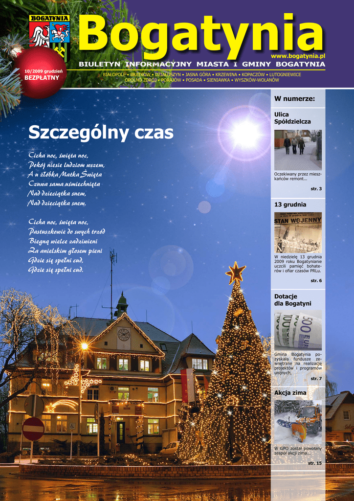 Bogatynia www.bogatynia.pl BIULETYN INFORMACYJNY MIASTA I GMINY BOGATYNIA 10/2009 grudzień 10/2009 grudzień BEZPŁATNY BEZPŁATNY BIAŁOPOLE • BRATKÓW • DZIAŁOSZYN • JASNA GÓRA • KRZEWINA • KOPACZÓW • LUTOGNIEWICE OPOLNO ZDRÓJ • PORAJÓW • POSADA • SIENIAWKA • WYSZKÓW-WOLANÓW W numerze: Szczególny czas Cicha noc, święta noc, Pokój niesie ludziom wszem, A u żłóbka Matka Święta Czuwa sama uśmiechnięta Nad dzieciątka snem, Nad dzieciątka snem. Cicha noc, święta noc, Pastuszkowie do swych trzód Biegną wielce zadziwieni Za anielskim głosem pieni Gdzie się spełni cud, Gdzie się spełni cud. Ulica Spółdzielcza Oczekiwany przez mieszkańców remont... str. 3 13 grudnia W niedzielę 13 grudnia 2009 roku Bogatynianie uczcili pamięć bohaterów i ofiar czasów PRLu. str. 6 Dotacje dla Bogatyni Gmina Bogatynia pozyskała fundusze zewnętrzne na realizację projektów i programów unijnych, str. 7 Akcja zima W GPO został powołany zespół akcji zima... str. 15 Biuletyn Informacyjny Miasta i Gminy Bogatynia 1 Rada Gminy i Miasta Bogatynia W czwartek 26 listopada odbyła się 55 sesja Rady Gminy i Miasta Bogatynia. Tematem przewodnim posiedzenia było uchwalenie stawek podatków. Podczas sesji przedstawiono również założenia do przyszłorocznego budżetu. Przed rozpoczęciem obrad Burmistrz Miasta i Gminy Bogatynia Andrzej Grzmielewicz wraz Przewodniczącym Rady Pawłem Szczotką wręczyli podziękowania panu Janowi Glanowskiemu za jego ponadtrzydziestoletnią działalność na rzecz bogatyńskiej społeczności sportowców oraz Bractwu Ziemi Bogatyńskiej za działania na rzecz rekonstrukcji procesu historycznego Gminy Bogatynia. Sesja rozpoczęła się od przedstawienia informacji na temat stanu realizacji zadań oświatowych za rok szkolny 2008/2009. W sprawozdaniu znalazły się informacje na temat spraw związanych z organizacją pracy szkół oraz nauczycieli, a także na temat dowożenia uczniów oraz wyników sprawdzianów jakie osiągają uczniowie z poszczególnych szkół w naszej gminie. W kolejnej części obrad debatowano na temat obniżenia ceny skupu żyta do celów wymiaru podatku rolnego. Jako pierwszy głos w sprawie zabrał burmistrz Andrzej Grzmielewicz, który zawnioskował do rady, aby obniżyć stawkę zaproponowaną przez prezesa GUS z 34,10 zł do 23 zł. W toku dyskusji oraz po wysłuchaniu opinii Ryszarda Fot. UMiG Bogatynia 55 sesja Podziękowania panu Janowi Glanowskiemu za jego ponadtrzydziestoletnią działalność na rzecz bogatyńskiej społeczności sportowców. Włosa Sołtysa Działoszyna, radny Piotr Nosal złożył wniosek o obniżenie ceny skupu żyta do celów wymiaru podatku rolnego o kolejne 3 złote. Ostatecznie rada podjęła uchwałę ze stawką w wysokości 20 zł. Podczas sesji podjęto również uchwały określające wysokości stawek podatku od nieruchomości oraz od Komisja Statutowa Głównym celem prac radnych w tej komisji jest zaktualizowanie zapisów w statutach jednostek pomocniczych oraz w Statucie Gminy, które nie były nowelizowane od kilku lat. Komisji przewodniczy radny Andrzej Lipko. Komisja Statutowa została utworzona w lutym 2007 roku. Od tej pory jej członkowie obradowali 22 razy. W komisji pracują radni: Andrzej Litwin, Anna Palikowska, Paweł Szczotka oraz Jerzy Wojciechowski. Pierwsze posiedzenie komisji odbyło się 27 lutego 2007 roku. Ustalono wówczas, że pierwszym zadaniem komisji będzie opracowanie Kodeksu Etyki Radnego. Po ustaleniu ostatecznej propozycji tekstu kodeksu, został on przekazany przewodniczącemu rady w celu naniesie- nia przez radnych ewentualnych poprawek. 25 października 2007 roku Rada Gminy i Miasta podjęła uchwałę w sprawie uchwalenia Kodeksu Etyki Radnego Gminy Bogatynia. Celem kodeksu było określenie standardów zachowania radnych, zebranie ich w postaci katalogu oraz poinformowanie obywateli o zasadach postępowania, które radni zobowiązali się dobrowolnie przestrzegać, pełniąc funkcje publiczne. Następnie członkowie komisji rozpoczęli prace mające na celu aktualizację zapisów do statutów osiedli. Przewodniczący komisji przedstawił propozycje zmian przedstawicielom rad osiedlowych, którzy wnieśli swoje uwagi do projektów. Kolejnym krokiem było przeprowadzenie konsultacji społecznych. Spotka- Fot. UMiG Bogatynia Doskonalenie prawa Radny Andrzej Lipko, przewodniczący Komisji Statutowej. nia z mieszkańcami siedmiu osiedli rozpoczęły się 13 maja 2008 r. Po ich zakończeniu (28 października 2008 r.) radni zatwierdzili graficzne załączniki do projektów statutów jednostek pomocniczych gminy. Ustalono, że statut każdego osiedla będzie posiadał załącznik graficzny obrazujący, które ulice wchodzą w skład danego osiedla oraz dokładny alfabetyczny wykaz ulic. Po ostatecznym dopracowaniu projektów statutów Rada Gminy i Miasta na sesji w dniu 28 listopada 2008 roku podjęła uchwałę w spra- środków transportowych. Dokonano również zmian w uchwale, na podstawie której utworzono Straż Miejską – dzięki temu w możliwe będzie zatrudnienie pracowników cywilnych, odpowiedzialnych za obsługę systemu monitoringu wizyjnego. ły w sprawie wprowadzenia zmian w budżecie gminy, w związku z tym burmistrz Andrzej Grzmielewicz złożył na ręce przewodniczącego Pawła Szczotki wniosek o zwołanie sesji nadzwyczajnej, poświęconej zmianom w budżecie. W wyniku głosowania rada nie wprowadziła do porządku obrad projektu uchwa- Sesję zakończyły interpelacje radnych. wie nadania statutów osiedlom w Bogatyni. Kolejnym zadaniem komisji było rozpoczęcie prac nad nowelizacją statutów sołectw. W październiku br. członkowie komisji spotkali się z sołtysami, gdzie omawiali propozycje zmian do statutów. staną poddane pod obrady rady – informuje przewodniczący Andrzej Lipko. Poza pracą nad zmianami w statutach komisja w bieżącym roku analizowała i opiniowała również projekty uchwał, kt
