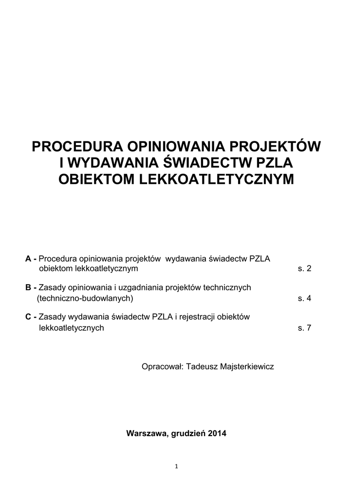 PROCEDURA OPINIOWANIA PROJEKTÓW I WYDAWANIA ŚWIADECTW PZLA OBIEKTOM LEKKOATLETYCZNYM A - Procedura opiniowania projektów wydawania świadectw PZLA obiektom lekkoatletycznym s. 2 B - Zasady opiniowania i uzgadniania projektów technicznych (techniczno-budowlanych) s. 4 C - Zasady wydawania świadectw PZLA i rejestracji obiektów lekkoatletycznych s. 7 Opracował: Tadeusz Majsterkiewicz Warszawa, grudzień 2014 1 A- PROCEDURA OPINIOWANIA PROJEKTÓW I WYDAWANIA ŚWIADECTW PZLA OBIEKTOM LEKKOATLETYCZNYM Zgodnie z postanowieniami Ministerstwa Sportu i Turystyki oraz obowiązującą Ustawą o Kulturze Fizycznej wszystkie projektowane obiekty sportowe muszą być zaopiniowane przez właściwe merytorycznie polskie związki sportowe pod kątem wymagań obowiązujących przepisów w danej dyscyplinie sportu, ustalonych przez międzynarodowe federacje (w przypadku PZLA - IAAF). Opinia związku musi jednoznacznie stwierdzić, czy zaprojektowane rozwiązania są zgodne z wymaganiami przepisów pod kątem dopuszczenia obiektu i jego urządzeń do rozgrywania oficjalnych zawodów, ich funkcjonalności i zapewnienia warunków bezpieczeństwa dla zawodników, sędziów i widzów. W związku z powyższym PZLA od kilku lat stosuje następujące zasady opiniowania projektów i wydawania świadectw dla obiektów lekkoatletycznych. 1. Złożenie przez inwestora planującego wybudowanie obiektu lekkoatletycznego (stadionu lub hali) wniosku o uzgodnienie projektu i wydanie świadectwa na formularzu znajdującym się na stronie internetowej PZLA www.pzla.pl menu: Związek/Komisje/Komisja Obiektów i Urządzeń/plik Wniosek o wydanie Świadectwa, wraz z ogólnymi założeniami (koncepcją) budowy, precyzującymi kategorię obiektu, jaką inwestor chciałby uzyskać i danymi, o których mowa w „Zasadach opiniowania projektów”, schematem usytuowania urządzeń na obiekcie i podstawowymi parametrami tych urządzeń. Inwestor, lub występujący w jego imieniu projektant, może razem z wnioskiem o uzgodnienie projektu i wydanie świadectwa, złożyć projekt budowlany lub techniczno-budowlany obiektu. 2. Po otrzymaniu wniosku Komisja Obiektów i Urządzeń akceptuje proponowane rozwiązania dot. usytuowania urządzeń lub przygotowuje opinię albo na wniosek inwestora przygotowuje wskazówki w sprawie usytuowania urządzeń na stadionie, w terminie nie dłuższym niż 30 dni od wpłynięcia do Związku założeń lub projektu w wersji papierowej lub w innym, najkrótszym i technicznie możliwym. 3. Po otrzymaniu wniosku Komisja Obiektów i Urządzeń przygotowuje opinię i wskazówki w sprawie przygotowania usytuowania urządzeń na stadionie lub akceptuje proponowane rozwiązania dot. usytuowania urządzeń, w terminie nie dłuższym niż 30 dni od wpłynięcia do Związku założeń lub projektu w wersji papierowej lub w innym, najkrótszym i technicznie możliwym. 4. Po zaakceptowaniu przez Komisję proponowanych rozwiązań dot. usytuowania urządzeń, inwestor lub działający w jego imieniu projektant, przedstawia projekt budowlany lub techniczno-budowlany w celu jego weryfikacji pod kątem zgodności z zaakceptowanymi przez Komisję założeniami i spełnieniem wymogów IAAF dot. deklarowanej kategorii stadionu (geometria stadionu, rozmieszczenie urządzeń z zachowaniem stref bezpieczeństwa, prawidłowość zaprojektowania parametrów poszczególnych urządzeń, obiekt rozgrzewkowy, trybuny, zaplecze sanitarnohigieniczne i pomieszczenia techniczne, infrastruktura towarzysząca – parkingi, drogi dojazdowe). 5. Po otrzymaniu projektu budowlanego lub techniczno-budowlanego Komisja Obiektów i Urządzeń przygotowuje opinię i wskazówki w sprawie jego uzupełnienia lub wprowadzenia poprawek albo akceptuje proponowane rozwiązania, w terminie nie dłuższym niż 30 dni od wpłynięcia do Związku projektu w wersji papierowej lub w innym, najkrótszym i technicznie możliwym. Po akceptacji projektu Związek przesyła inwestorowi fakturę za uzgodnienie projektu wraz z należnością za zaopiniowanie założeń (koncepcji architektoniczno-budowlanej) lub projektu budowlanego lub technicznobudowlanego. Po wpłynięciu należności Związek przesyła inwestorowi zaakceptowany projekt. Akceptacja projektu jest potwierdzana stosownymi podpisami przez przedstawiciela Komisji i Związku. 6. Przed przystąpieniem do realizacji obiektu, Komisja lub jej przedstawiciele mogą, na życzenie inwestora, udzielać konsultacji w sprawie przygotowania dokumentacji przetargowej i Specyfikacji Istotnych Warunków Zamówienia oraz przygotowywać projekty odpowiedzi udzielanych przez Zamawiającego na pytania potencjalnych Wykonawców dot. sformułowań odnoszących się do prac związanych z wykonaniem urządzeń lekkoatletycznych, rodzaju i specyfikacji wymagań w stosunku do nawierzchni i warunków odbioru inwestycji, w tym uzyskiwania Świadectwa PZLA, 2 dopuszczającego stadion do zawodów. W przypadku stadionów, których gospodarze zamierzają występować o przyznanie kategorii I i II do IAAF oraz kategorii IIIA nadawanej przez PZLA, wymagane jest konsultowanie dokumentacji przetargowej i Specyfikacji Istotnych Warunków Zamówienia z Komisją, zalecane w przypadku pozostałych kategorii. 7. W trakcie realizacji obiektu Komisja lub jej przedstawiciele mogą, na życzenie inwestora, udzielać konsultacji w sprawach związanych z korektą uzgodnionych rozwiązań czy zmian zaproponowanych przez Wykonawcę. Wszelkie konsultacje są udzielane jedynie na pytania przesyłane drogą elektroniczną lub normalną pocztą. 8. Po wykonaniu obiektu, w przypadku występowania o przyznanie kategorii I i II do IAAF oraz kategorii IIIA oraz kategorii IV i V w przypadku gdy na stadionie zainstalowano inny rodzaj nawierzchni aniżeli nawierzchnia przedstawiona w uzgodnionym z Komisją projekcie i w ofercie, która wygrała przetarg oraz dla stadionów wybudowanych na podstawie nieuzgodnionego z Komisją projektu, wymagane jest sprawd