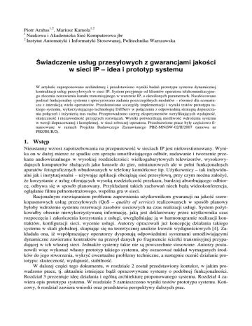 Piotr Arabas1,2, Mariusz Kamola1,2 1 Naukowa i Akademicka Sieć Komputerowa jbr 2 Instytut Automatyki i Informatyki Stosowanej, Politechnika Warszawska Świadczenie usług przesyłowych z gwarancjami jakości w sieci IP – idea i prototyp systemu W artykule zaproponowano architekturę i przedstawiono wyniki badań prototypu systemu dynamicznej kontraktacji usług przesyłowych w sieci IP. System przyjmuje od klientów operatora telekomunikacyjnego zlecenia zestawienia kanału transmisyjnego w warstwie IP, o określonych parametrach. Naszkicowano podział funkcjonalny systemu i sprecyzowano zadania poszczególnych modułów – równieŜ dla scenariusza z interakcją wielu operatorów. Przedstawiono szczegóły implementacji i wyniki testów prototypu takiego systemu, wykorzystującego technologię DiffServ w połączeniu z odpowiednią strategią dopuszczania połączeń i inŜynierią tras ruchu. Przeprowadzono szereg eksperymentów weryfikujących wydajność, skuteczność i niezawodność przyjętych rozwiązań. Wyniki potwierdzają moŜliwość wdroŜenia systemu w wersji dopracowanej i kompletnej, w sieci roboczej operatora. Przedstawione prace były częściowo finansowane w ramach Projektu Badawczego Zamawianego PBZ-MNiSW-02/II/2007 (umowa nr PBZ/BUR/2). 1. Wstęp Nieustanny wzrost zapotrzebowania na przepustowość w sieciach IP jest niekwestionowany. Wynika on w duŜej mierze ze spadku cen sprzętu umoŜliwiającego odbiór, nadawanie i tworzenie przekazu audiowizualnego w wysokiej rozdzielczości: wielkogabarytowych telewizorów, wysokowydajnych komputerów słuŜących jako konsole do gier, miniaturowych ale w pełni funkcjonalnych aparatów fotograficznych wbudowanych w telefony komórkowe itp. UŜytkownicy – tak indywidualni jak i instytucjonalni – uŜywając aplikacji obciąŜają sieć przesyłową, przy czym moŜna załoŜyć, Ŝe korzystanie z usług oferujących wysoką rozdzielczość przekazu, bardziej absorbującego odbiorcę, odbywa się w sposób planowany. Przykładami takich zachowań niech będą wideokonferencja, oglądanie filmu pełnometraŜowego, wspólna gra w sieci. Racjonalnym rozwiązaniem problemu zapewnienia uŜytkownikom gwarancji na jakość szerokopasmowych usług przesyłowych (QoS – quality of service) realizowanych w sposób planowy byłoby wdroŜenie systemu rezerwacji zasobów sieciowych na czas realizacji usługi. System poŜytkowałby obecnie niewykorzystywaną informację, jaką jest deklarowany przez uŜytkownika czas rozpoczęcia i zakończenia korzystania z usługi, uwzględniając ją w harmonogramie realizacji kontraktów, konfiguracji sieci, wycenie usługi. Autorzy opracowali juŜ koncepcję działania takiego systemu w skali globalnej, skupiając się na teoretycznej analizie kwestii wydajnościowych [4]. Zakładała ona, iŜ współpracujący operatorzy dysponują odpowiednimi systemami umoŜliwiającymi dynamiczne zawieranie kontraktów na przesył danych po fragmencie ścieŜki transmisyjnej przypadającej w ich własnej sieci. JednakŜe systemy takie nie są powszechnie stosowane. Autorzy postanowili więc wykonać własny prototyp takiego systemu, aby oszacować nakład wymaganych środków do jego stworzenia, wykryć ewentualne problemy techniczne, a następnie ocenić działanie prototypu: skuteczność, wydajność, stabilność. W dalszej części tego dokumentu, w rozdziale 2 został przedstawiony kontekst, w jakim prowadzono prace, tj. aktualnie istniejące bądź opracowywane systemy o podobnej funkcjonalności. Rozdział 3 prezentuje ideę działania i ogólną architekturę proponowanego systemu. Rozdział 4 zawiera opis prototypu systemu. W rozdziale 5 zamieszczono wyniki testów prototypu systemu. Końcowy, 6 rozdział zawiera wnioski oraz przedstawia perspektywy dalszych prac. 2. Systemy gwarantujące jakość usług przesyłowych W ostatnich latach prowadzono na świecie prace mające na celu skonstruowanie systemów pozwalających na dostarczanie usług sieciowych z gwarancjami jakości, oraz na ich kontraktowanie w sposób dynamiczny. Prace te moŜna podzielić na dwa nurty: pierwszy związany z aspektami technologicznymi dostarczania takich usług, oraz drugi zajmujący się głównie kwestiami ekonomicznymi, takimi jak organizacja handlu usługami sieciowymi, wycena usług czy konstrukcja SLA (service level agreement). Prace prowadzono zarówno w środowiskach akademickich, przedsiębiorstwach jak i w konsorcjach; charakteryzują się więc one zróŜnicowanymi nastawieniem do wątków stricte badawczych, praktycznej stosowalności wyników i rzeczywistej moŜliwości komercjalizacji uzyskanych produktów. 2.1 Projekty badawcze PrzewaŜająca część rezultatów naukowych jest zawdzięczana badaniom prowadzonym w projektach dofinansowywanych z programów ramowych Unii Europejskiej. Pomimo udziału w nich, w zróŜnicowanym zakresie, partnerów przemysłowych, utrzymały one charakter badawczy, niejednokrotnie rozwijając idee powstałe w jednym, inicjującym projekt, środowisku naukowym. Na szczególną uwagę zasługują, zajmujące się problematyką technicznej realizacji transmisji z gwarancjami usług, projekty TEQUILA i MESCAL oraz AQUILA i EuQOS. Główną zasługą projektu TEQUILA stało się zaproponowanie dość zaawansowanej metodyki specyfikacji jakości usług (SLS – service level specification), będącej istotną częścią SLA, i wykorzystanej przy definicji protokołu rezerwacji zasobów. Środkiem technicznym dla zapewnienia jakości transmisji było róŜnicowanie obsługi pakietów za pomocą mechanizmów oferowanych przez DiffServ (differentiated services), w połączeniu z dopuszczaniem połączeń (CAC – connection admission control) do sieci, moŜliwym dzięki zastosowaniu wspomnianego protokołu rezerwacji. Wadą opracowanego rozwiązania była słaba skalowalność wynikająca ze zbytniej centralizacji sterowania dostępem do sieci. Podobne rozwiązanie, tzn. łączące 