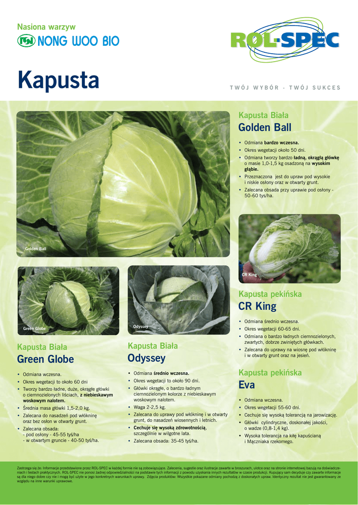 Nasiona warzyw Kapusta TWÓJ WYBÓR - TWÓJ SUKCES Kapusta Biała Golden Ball • Odmiana bardzo wczesna. • Okres wegetacji około 50 dni. • Odmiana tworzy bardzo ładną, okrągłą główkę o masie 1,0-1,5 kg osadzoną na wysokim głąbie. • Przeznaczona jest do upraw pod wysokie i niskie osłony oraz w otwarty grunt. • Zalecana obsada przy uprawie pod osłony - 50-60 tys/ha. Golden Ball CR King Kapusta pekińska CR King Green Globe Odyssey Kapusta Biała Kapusta Biała Green Globe Odyssey • Odmiana wczesna. • Odmiana średnio wczesna. • Okres wegetacji to około 60 dni • Tworzy bardzo ładne, duże, okrągłe główki o ciemnozielonych liściach, z niebieskawym woskowym nalotem. • Okres wegetacji to około 90 dni. • Główki okrągłe, o bardzo ładnym ciemnozielonym kolorze z niebieskawym woskowym nalotem. • Odmiana średnio wczesna. • Okres wegetacji 60-65 dni. • Odmiana o bardzo ładnych ciemnozielonych, zwartych, dobrze zwiniętych główkach. • Zalecana do uprawy na wiosnę pod włókninę i w otwarty grunt oraz na jesień. Kapusta pekińska Eva • Odmiana wczesna. • Waga 2-2,5 kg. • Okres wegetacji 55-60 dni. • Zalecana do nasadzeń pod włókninę oraz bez osłon w otwarty grunt. • Zalecana do uprawy pod włókninę i w otwarty grunt, do nasadzeń wiosennych i letnich. • Cechuje się wysoką tolerancją na jarowizację. • Zalecana obsada: - pod osłony - 45-55 tyś/ha - w otwartym gruncie - 40-50 tyś/ha. • Zalecana obsada: 35-45 tyś/ha. • Średnia masa główki 1,5-2,0 kg. • Cechuje się wysoką zdrowotnością, szczególnie w wilgotne lata. • Główki cylindryczne, doskonałej jakości, o wadze (0,8-1,4 kg). • Wysoka tolerancja na kiłę kapuścianą i Mączniaka rzekomego. Zastrzega się że: Informacje przedstawione przez ROL-SPEC w każdej formie nie są zobowiązujące. Zalecenia, sugestie oraz ilustracje zawarte w broszurach, ulotce oraz na stronie internetowej bazują na doświadczeniach i testach praktycznych. ROL-SPEC nie ponosi żadnej odpowiedzialności na podstawie tych informacji z powodu uzyskania innych rezultatów w czasie produkcji. Kupujący sam decyduje czy zawarte informacje są dla niego dobre czy nie i mogą być użyte w jego konkretnych warunkach uprawy. Zdjęcia produktów: Wszystkie pokazane odmiany pochodzą z doskonałych upraw. Identyczny rezultat nie jest gwarantowany ze względu na inne warunki uprawowe. Nasiona warzyw Kalafior i brokuł TWÓJ WYBÓR - TWÓJ SUKCES White Diamond Silver Star 08CF653 Kalafior Nowość! 08CF653 • Odmiana późna. • Charakteryzuje się bardzo dużymi wzniesionymi liśćmi, które ładnie okrywają różę chroniąc ją przed przebarwieniami. • Przeznaczona na świeży rynek i do przemysłu, w uprawach na zbiór jesienny. • Zalecana obsada: 25-30 tyś/ha. Kalafior Kalafior • Odmiana średnio wczesna. • Odmiana średnio wczesna. White Diamond • Okres wegetacji to 75-80 dni. • Charakteryzuje się bardzo ładną, białą i zwięzłą różą. • Polecana do uprawy pod włókninę i bez osłon w otwarty grunt. • Zalecana obsada: - pod osłony 30-35tyś/ha - bez osłon 25-30 tyś/ha. White Pearl • Piękna, zwarta, biała róża. • Odmiana charakteryzuje się bardzo dużymi wzniesionymi liśćmi, które ładnie okrywają różę chroniąc ją przed przebarwieniami. • Przeznaczona do uprawy pod włókninę Nowość 06B596 i w otwarty grunt. • Zalecana obsada: - pod osłony 30-35 tyś/ha - bez osłon 25-30 tyś/ha. 06B596 Brokuł Nowość! 06B596 • Odmiana o ładnych ciemnozielonych, zwartych, kulistych różach i średnio drobnych wyrównanych kwiatach, które osadzone są na średniej wielkości głąbie. • Okres wegetacji to 70-80 dni. • Zalecana do uprawy na świeży rynek i dla przemysłu. Informacje uprawowe: Piotr Zawada, tel.: 601 888 922, e-mail: piotr.zawada1@gmail. com Biuro: Natalia Zawada, tel.: 12 422 4968, 501 005 245, e-mail: [email protected] Renata Zawada, tel.: 501 005 235, e-mail: [email protected] 31-048 Kraków, ul. Bogusławskiego 3/5A