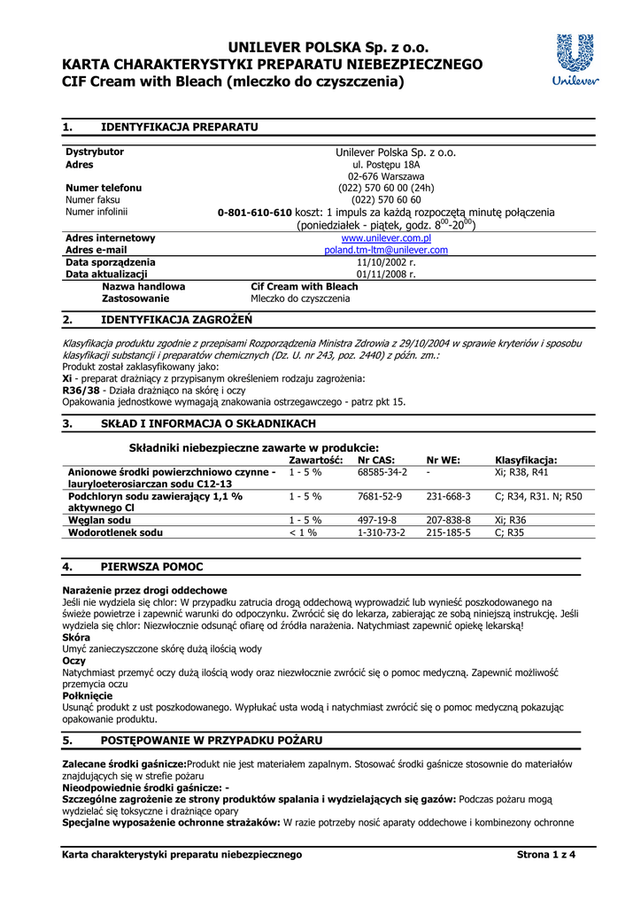 UNILEVER POLSKA Sp. z o.o. KARTA CHARAKTERYSTYKI PREPARATU NIEBEZPIECZNEGO CIF Cream with Bleach (mleczko do czyszczenia) 1. IDENTYFIKACJA PREPARATU Unilever Polska Sp. z o.o. Dystrybutor Adres Numer telefonu Numer faksu Numer infolinii ul. Postępu 18A 02-676 Warszawa (022) 570 60 00 (24h) (022) 570 60 60 0-801-610-610 koszt: 1 impuls za każdą rozpoczętą minutę połączenia (poniedziałek - piątek, godz. 800-2000) Adres internetowy Adres e-mail Data sporządzenia Data aktualizacji Nazwa handlowa Zastosowanie 2. www.unilever.com.pl [email protected] 11/10/2002 r. 01/11/2008 r. Cif Cream with Bleach Mleczko do czyszczenia IDENTYFIKACJA ZAGROŻEŃ Klasyfikacja produktu zgodnie z przepisami Rozporządzenia Ministra Zdrowia z 29/10/2004 w sprawie kryteriów i sposobu klasyfikacji substancji i preparatów chemicznych (Dz. U. nr 243, poz. 2440) z późn. zm.: Produkt został zaklasyfikowany jako: Xi - preparat drażniący z przypisanym określeniem rodzaju zagrożenia: R36/38 - Działa drażniąco na skórę i oczy Opakowania jednostkowe wymagają znakowania ostrzegawczego - patrz pkt 15. 3. SKŁAD I INFORMACJA O SKŁADNIKACH Składniki niebezpieczne zawarte w produkcie: Anionowe środki powierzchniowo czynne lauryloeterosiarczan sodu C12-13 Podchloryn sodu zawierający 1,1 % aktywnego Cl Węglan sodu Wodorotlenek sodu 4. Zawartość: 1-5% Nr CAS: 68585-34-2 Nr WE: - Klasyfikacja: Xi; R38, R41 1-5% 7681-52-9 231-668-3 C; R34, R31. N; R50 1-5% <1% 497-19-8 1-310-73-2 207-838-8 215-185-5 Xi; R36 C; R35 PIERWSZA POMOC Narażenie przez drogi oddechowe Jeśli nie wydziela się chlor: W przypadku zatrucia drogą oddechową wyprowadzić lub wynieść poszkodowanego na świeże powietrze i zapewnić warunki do odpoczynku. Zwrócić się do lekarza, zabierając ze sobą niniejszą instrukcję. Jeśli wydziela się chlor: Niezwłocznie odsunąć ofiarę od źródła narażenia. Natychmiast zapewnić opiekę lekarską! Skóra Umyć zanieczyszczone skórę dużą ilością wody Oczy Natychmiast przemyć oczy dużą ilością wody oraz niezwłocznie zwrócić się o pomoc medyczną. Zapewnić możliwość przemycia oczu Połknięcie Usunąć produkt z ust poszkodowanego. Wypłukać usta wodą i natychmiast zwrócić się o pomoc medyczną pokazując opakowanie produktu. 5. POSTĘPOWANIE W PRZYPADKU POŻARU Zalecane środki gaśnicze:Produkt nie jest materiałem zapalnym. Stosować środki gaśnicze stosownie do materiałów znajdujących się w strefie pożaru Nieodpowiednie środki gaśnicze: Szczególne zagrożenie ze strony produktów spalania i wydzielających się gazów: Podczas pożaru mogą wydzielać się toksyczne i drażniące opary Specjalne wyposażenie ochronne strażaków: W razie potrzeby nosić aparaty oddechowe i kombinezony ochronne Karta charakterystyki preparatu niebezpiecznego Strona 1 z 4 UNILEVER POLSKA Sp. z o.o. KARTA CHARAKTERYSTYKI PREPARATU NIEBEZPIECZNEGO CIF Cream with Bleach (mleczko do czyszczenia) 6. POSTĘPOWANIE W PRZYPADKU NIEZAMIERZONEGO UWOLNIENIA DO ŚRODOWISKA Indywidualne środki ostrożności: Unikać kontaktu ze skórą i oczami. Nosić odpowiednie rękawice ochronne. W przypadku rozlania uważać na śliskie powierzchnie. Środki ostrożności w zakresie ochrony środowiska: Nie dopuszczać do przedostawania się dużych ilości uwolnionego produktu do środowiska. W przypadku ryzyka zanieczyszczenia cieków wodnych i wód gruntowych powiadomić odpowiednie władze. Metody oczyszczania/usuwania: Uwolniony produkt przesypać materiałem pochłaniającym (piasek) oraz zebrać mechanicznie do oznakowanych pojemników na odpady. Pozostałości lub niewielkie ilości uwolnionego materiału spłukać wodą do kanalizacji. Usuwać zgodnie z zaleceniami przedstawionymi w rozdziale 13. 7. POSTĘPOWANIE Z PREPARATEM I JEGO MAGAZYNOWANIE Postępowanie z preparatem Nie dopuszczać do zanieczyszczenia oczu i skóry. Nosić okulary ochronne lub ochronę twarzy i odpowiednie rękawice ochronne. W kontakcie z kwasami uwalnia toksyczne gazy. Magazynowanie Preparat przechowywać w oryginalnych pojemnikach, szczelnie zamkniętych w suchych, dobrze wentylowanych miejscach (temperatury graniczne od 0 0C do 40 0C). Nie przechowywać razem z kwasami. Unikać narażenia na działanie wysokich temperatur. Nie przechowywać w warunkach powodujących zbyt duży nacisk na opakowania produktu. 8. KONTROLA NARAŻENIA I ŚRODKI OCHRONY INDYWIDUALNEJ Dodatkowe zalecenia w zakresie środków inżynieryjnych: Zapewnić odpowiednią wentylację ogólną. Parametry kontroli narażenia: Rozporządzenie MPiPS z dnia 30/08/2007 w sprawie najwyższych dopuszczalnych stężeń i natężeń czynników szkodliwych dla zdrowia w środowisku pracy (Dz.U. nr 161, poz. 1142): Wartości dopuszczalnych stężeń w środowisku pracy składników dla produktu: o numerze CAS 1310-73-2 (wodorotlenek sodu): NDS = 0,5mg/m3; NDSCh = 1 mg/m3; NDSP – nie określono o numerze CAS 7782-50-5 (chlor): NDS = 0,7 mg/m3; NDSCh = 1,5 mg/m3; NDSP – nie określono Środki ochrony indywidualnej: Ochrona dróg oddechowych: W normalnych warunkach – żadnych. Aparaty ochrony dróg oddechowych mogą być wymagane w przypadkach dużej koncentracji produktu i słabo wentylowanych pomieszczeniach. Stosować sprzęt ochrony układu oddechowego z filtrem kombinowanym (przeciwpyłowym i przeciwgazowym). Stosować maskę oddechową z filtrem przeciwgazowym typu B. Przy niedostatecznej wentylacji lub ryzyku narażenia na wdychanie pylu stosować odpowiednią maskę oddechową z filtrem przeciwpyłowym typu P2. Ochrona rąk: Nosić odpowiednie rękawice ochronne. Stosować rękawice ochronne z: kauczuku, neoprenu albo PVC Ochrona oczu i twarzy: Nosić okulary lub ochronę twarzy. Stosować atestowane okulary ochronne albo tarczę twarzową. Ochrona skóry: W normalnych warunkach – żadnych. Zalecenia higieniczne: Każdorazowo po zakończeniu pracy dokładnie umyć ręce Kontrola narażenia środowiska: Lokalne władze powinny by