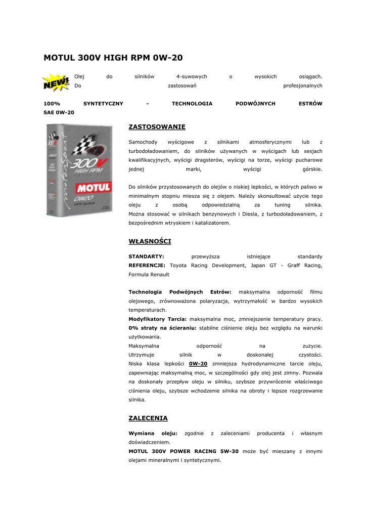 MOTUL 300V HIGH RPM 0W-20 Olej do silników 4-suwowych Do 100% o wysokich zastosowań SYNTETYCZNY - osiągach. profesjonalnych TECHNOLOGIA PODWÓJNYCH ESTRÓW SAE 0W-20 ZASTOSOWANIE Samochody wyścigowe turbodoładowaniem, do z silnikami silników atmosferycznymi używanych w wyścigach lub lub z sesjach kwalifikacyjnych, wyścigi dragsterów, wyścigi na torze, wyścigi pucharowe jednej marki, wyścigi górskie. Do silników przystosowanych do olejów o niskiej lepkości, w których paliwo w minimalnym stopniu miesza się z olejem. Należy skonsultować użycie tego oleju z osobą odpowiedzialną za tuning silnika. Można stosować w silnikach benzynowych i Diesla, z turbodoładowaniem, z bezpośrednim wtryskiem i katalizatorem. WŁASNOŚCI STANDARTY: przewyższa istniejące standardy REFERENCJE: Toyota Racing Development, Japan GT - Graff Racing, Formula Renault Technologia Podwójnych Estrów: maksymalna odporność filmu olejowego, zrównoważona polaryzacja, wytrzymałość w bardzo wysokich temperaturach. Modyfikatory Tarcia: maksymalna moc, zmniejszenie temperatury pracy. 0% straty na ścieraniu: stabilne ciśnienie oleju bez względu na warunki użytkowania. Maksymalna odporność Utrzymuje silnik w na zużycie. doskonałej czystości. Niska klasa lepkości 0W-20 zmniejsza hydrodynamiczne tarcie oleju, zapewniając maksymalną moc, w szczególności gdy olej jest zimny. Pozwala na doskonały przepływ oleju w silniku, szybsze przywrócenie właściwego ciśnienia oleju, szybsze wchodzenie silnika na obroty i lepsze rozgrzewanie silnika. ZALECENIA Wymiana oleju: zgodnie z zaleceniami producenta i własnym doświadczeniem. MOTUL 300V POWER RACING 5W-30 może być mieszany z innymi olejami mineralnymi i syntetycznymi. MOTUL 300V POWER RACING 5W-30 Olej do silników 4-suwowych Do 100% o wysokich osiągach. zastosowań SYNTETYCZNY - profesjonalnych TECHNOLOGIA PODWÓJNYCH ESTRÓW SAE 5W-30 ZASTOSOWANIE Samochody wyścigowe turbodoładowaniem, kwalifikacyjnych do z silnikami silników wymagającymi atmosferycznymi używanych osiągania w wyścigach maksymalnych lub lub z sesjach mocy i jak najszybszego osiągania wysokich obrotów: sesje kwalifikacyjne, wyścigi dragsterów, wyścigi na torze, NASCAR, wyścigi górskie, wyścigi pucharowe jednej marki, rajdy. Do silników przystosowanych do olejów o niskiej lepkości, w których paliwo w minimalnym stopniu miesza się z olejem. Można stosować w silnikach benzynowych i Diesla, z turbodoładowaniem, z bezpośrednim wtryskiem i katalizatorem. WŁASNOŚCI STANDARTY: przewyższa istniejące standardy REFERENCJE: NISMO NISSAN, Japan GT - Coloni Motorsport, Formuła 3 Technologia Podwójnych Estrów: maksymalna odporność filmu olejowego, zrównoważona polaryzacja, wytrzymałość w bardzo wysokich temperaturach. Modyfikatory Tarcia: maksymalna moc, zmniejszenie temperatury pracy. 0% straty na ścieraniu: stabilne ciśnienie oleju bez względu na warunki użytkowania. Maksymalna odporność Utrzymuje silnik w na zużycie. doskonałej czystości. Niska klasa lepkości 5W-30 pozwala na doskonały przepływ oleju w silniku, szybsze osiąganie właściwego ciśnienia oleju, szybsze wchodzenie na obroty. ZALECENIA Wymiana oleju: zgodnie z zaleceniami producenta i własnym doświadczeniem. MOTUL 300V HIGH RPM 0W-20 może być mieszany z innymi olejami mineralnymi i syntetycznymi. MOTUL 300V POWER 5W-40 Olej do silników 4-suwowych Do 100% o wysokich osiągach. zastosowań SYNTETYCZNY - profesjonalnych TECHNOLOGIA PODWÓJNYCH ESTRÓW SAE 5W-40 ZASTOSOWANIE Samochody wyścigowe z silnikami atmosferycznymi lub z turbodoładowaniem, do silników używanych w wyścigach działających w szerokim zakresie obrotów i temperatur: wyścigi torowe, wyścigi pucharowe jednej marki, rajdy, wyścigi górskie. Do silników powodujących umiarkowane przedostawanie się oleju do paliwa. Można stosować w silnikach benzynowych i Diesla, z turbodoładowaniem, z bezpośrednim wtryskiem i katalizatorem. WŁASNOŚCI STANDARTY: przewyższa REFERENCJE: SUBARU istniejące WORLD RALLY TEAM standardy - World Rally odporność filmu Championship, Graff Racing, Formuła Renault Technologia Podwójnych Estrów: maksymalna olejowego, zrównoważona polaryzacja, wytrzymałość w bardzo wysokich temperaturach. Modyfikatory Tarcia: maksymalna moc, zmniejszenie temperatury pracy. 0% straty na ścieraniu: stabilne ciśnienie oleju bez względu na warunki użytkowania. Maksymalna odporność Utrzymuje silnik w na zużycie. doskonałej czystości. Klasa lepkości 5W-40 zapewnia doskonały przepływ oleju w silniku, szybsze osiąganie właściwego ciśnienia oleju, szybsze wchodzenie na obroty i przez cały czas to samo wysokie ciśnienie oleju przy wysokich obrotach silnika w wysokich temperaturach. ZALECENIA Wymiana oleju: zgodnie z zaleceniami producenta i własnym doświadczeniem. MOTUL 300V POWER 5W-40 może być mieszany z innymi olejami mineralnymi i syntetycznymi. MOTUL 300V CHRONO 10W-40 Olej do silników 4-suwowych Do 100% o wysokich zastosowań SYNTETYCZNY - osiągach. profesjonalnych TECHNOLOGIA PODWÓJNYCH ESTRÓW SAE 10W-40 ZASTOSOWANIE Samochody wyścigowe z silnikami atmosferycznymi lub z turbodoładowaniem, do silników używanych w wyścigach działających w szerokim zakresie obrotów i temperatur: wyścigi torowe, wyścigi pucharowe jednej marki, rajdy, wyścigi górskie. Do silników powodujących umiarkowane przedostawanie się oleju do paliwa. Można stosować w silnikach benzynowych i Diesla, z turbodoładowaniem, z bezpośrednim wtryskiem i katalizatorem. WŁASNOŚCI STANDARTY: przewyższa istniejące standardy REFERENCJE: SUBARU STI Technologia Podwójnych Estrów: maksymalna odporność filmu olejowego, zrównoważona polaryzacja, wytrzymałość w bardzo wysokich temperaturach. Modyfikatory Tarcia: maksymalna moc, zmniejszenie temperatury pracy. 0% straty na ścieraniu: stabilne ciśnienie oleju bez względu na warunki użytkowania. Maksymalna odporno