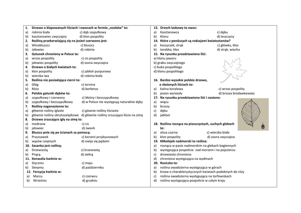 1. Drzewo o klapowanych liściach i owocach w formie „nosków” to: a) robinia biała c) dąb szypułkowy b) kasztanowiec zwyczajny d) klon pospolity 2. Rośliną przebarwiającą się na jesień czerwono jest: a) Winobluszcz c) bluszcz b) Jałowiec d) robinia 3. Gatunek chroniony w Polsce to: a) wrzos pospolity c) cis pospolity b) jałowiec pospolity d) sosna zwyczajna 4. Drzewo o białych kwiatach to: a) klon pospolity c) jabłoń purpurowa b) wierzba iwa d) robinia biała 5. Roślina nie posiadająca cierni to: a) Głóg c) tarnina b) Róża d) berberys 6. Polskie gatunki dębów to: a) szypułkowy i czerwony c) błotny i bezszypułkowy b) szypułkowy i bezszypułkowy d) w Polsce nie występują naturalnie dęby 7. Rośliny nagonasienne to: a) głównie rośliny iglaste c) gównie rośliny liściaste b) głównie rośliny okrytozalążkowe d) głównie rośliny zrzucające liście na zimę 8. Drzewo zrzucające igły na zimę to: a) modrzew c) cis b) jałowiec d) świerk 9. Bluszcz pnie się po ścianach za pomocą: a) Przyssawek c) korzeni przybyszowych b) wąsów czepnych d) owija się pędami 10. Sasanka jest rośliną: a) Drzewiastą c) krzewiastą b) Pnącą d) zielną 11. Konwalia kwitnie w: a) Styczniu c) maju b) Sierpniu d) październiku 12. Forsycja kwitnie w: a) Marcu c) czerwcu b) Wrześniu d) grudniu 13. Orzech laskowy to owoc: a) Kasztanowca c) dębu b) Klonu d) leszczyny 14. Które z poniższych są rodzajami kwiatostanów? a) koszyczek, strąk c) główka, kłos b) torebka, kłos d) strąk, wiecha 15. Na rysunku przedstawiono liść: a) klonu jaworu b) grabu zwyczajnego c) buka pospolitego d) klonu pospolitego 16. Bardzo wysokie polskie drzewo, o złożonych liściach to: a) kalina koralowa c) wrzos pospolity b) jesion wyniosły d) brzoza brodawkowata 17. Na rysunku przedstawiono liść i nasiono: a) wiązu b) brzozy c) dębu d) jabłoni 18. Roślina rosnąca na piaszczystych, suchych glebach to: a) olsza czarna c) wierzba biała b) klon pospolity d) sosna zwyczajna 19. Mikołajek nadmorski to roślina: a) rosnąca w pasie nadmorskim na glebach bagiennych b) występująca pospolicie nad morzem i na pojezierzu c) drzewiasta chroniona d) chroniona występująca na wydmach 20. Rosiczka to: a) roślina owadożerna występująca w górach b) krzew o charakterystycznych kwiatach podobnych do róży c) roślina owadożerna występująca na torfowiskach d) roślina występująca pospolicie w całym kraju 21. Roślina kwitnąca wczesną wiosną o białych kwiatach to: a) konwalia majowa c) śnieżyczka przebiśnieg b) jaskier ostry d) przylaszczka pospolita 22. Drzewo występujące w Polsce o liściach złożonych i czerwonych owocach to: a) jarząb pospolity c) kalina koralowa b) klon jawor d) klon jesionolistny 23. Wysoka sosna występująca w Tatrach to: a) sosna limba c) sosna kosodrzewina b) sosna pospolita d) sosna czarna 24. Drzewo o szarej gładkiej korze to: a) Buk c) Dąb b) Topola d) cis 25. Roślina rosnąca na innych roślinach, np. storczyk to: a) Geofit c) roślina zielna b) roślina drzewiasta d) epifit Po klucze odpowiedzi prosimy zgłosić się pod adres: [email protected] 26. Przykładem rośliny okrytonasiennej jest: a) klon b) świerk b) sosna d) modrzew 27. Jakiego koloru są kwiaty czarnego bzu? a) Białe c) czarne b) Żółte d) czerwone 28. Jakiego koloru są owoce głogu? a) Białe c) czerwone b) Czarne d) żółte 29. Która z roślin jest trująca? a) Pokrzywa c) brzoza b) Klon d) konwalia 30. Której z roślin nie spotkasz w ściółce leśnej? a) Mak c) wrzos b) Borówka d) grążel