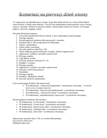 Scenariusz na pierwszy dzień wiosny 21 rozpoczyna się kalendarzowa wiosna. Tego dnia dzień równa się z nocą, które będzie coraz krótsza, a dzień coraz dłuższy. Ten kto jest znakomitym obserwatorem, ujrzy wiosnę, usłyszy i poczuje. Wiosna to przecież słońce, zielone pąki i pierwsze kwiaty, to świergot ptaków i powiew ciepłego wiatru. Oto plan dzisiejszej imprezy. 1. Uroczyste przekazanie klucza szkoły w ręce samorządu uczniowskiego. 2. Występ zespołu... 3. Rozstrzygnięcie konkursu dla nauczycieli i uczniów. 4. Konkurs klas I- III na najciekawsza Marzannę. 5. Taniec z gwiazdami. 6. Pokaz mody wiosennej. 7. Zawody sportowe dla klas I- III. 8. Niech zabłysną pierwszoklasiści. Scenka ,,Dzień wagarowicza”. 9. Ogłoszenie wyników zawodów sportowych. 10. Występ zespołu... 11. Ciąg dalszy scenki. 12. Zawody sportowe dla klas IV- VI. 13. Randka w ciemno. 14. Występ zespołu... 15. Ogłoszenie wyników zawodów sportowych. 16. Zawody z pierwszej pomocy. 17. Familiada. 18. Występ zespołu... 19. Konkurs ,,Budujemy domki” 20. Zawody sportowe gimnazjum. Czas rozstrzygnąć konkurs dla nauczycieli. • W konkurencji ,, Nauczyciel dyplomata” wyróżnienie otrzymuje... (wchodzi dziewczyna i podaje kopertę) • W konkurencji ,,Nauczyciel perfekcjonista” wyróżnienie otrzymuje... • W konkurencji ,, Nauczyciel żyleta” wyróżnienie otrzymuje... • W konkurencji ,,najzabawniejszy nauczyciel” wyróżnienie otrzymuje... Rozstrzygnięcie konkursu dla uczniów: • W konkurencji ,,Uczeń luzak” wyróżnienie otrzymuje... • W konkurencji ,,Uczeń lizus” wyróżnienie otrzymuje... • W konkurencji ,,Dziewczyna roku” wyróżnienie otrzymuje... • W konkurencji ,,Chłopak roku” wyróżnienie otrzymuje... • W konkurencji ,,Para roku” wyróżnienie otrzymuje... Zapraszamy uczniów klas I- III, ze swoimi Marzannami. (prezentacja Marzann) Oddajemy głos jury. (rozstrzygniecie konkursu, rozdanie dyplomów) Dziękujemy wszystkim za udział w konkursie. (brawa) -Kaśka, może sobie potańczymy? -No jasne ;) (tańczą tak sobie na żarty) -Laska, może z nas wystarczy? -Dałyśmy czadu. (śmiech ) A może przyjrzyjmy się jak to robią zawodowcy ;) • Z dalekiego wschodu przyjęła nasze zaproszenie para z Chin- Jamoto Mokijamo ze swoja partnerką. (wchodzą przebrani za chińczyków, brawa) • Z Francji, krainy żabich nóżek przybyli- Franczesko Depah^do i Monik Ph^ento. (wchodzi elegancka para, brawa) • Z Ukrainy przyjechali do nas królowa Artemida i król Blagof. (wchodzą przebrani za parę królewska, brawa) • Z gorącej Afryki odwiedzili nas murzynek Bambo i jego koleżanka Mamba. (wchodzą dwa murzynki, brawa) (tańczą, po kolei podchodzą do jury, czekają na opinie i głosy) Dziękujemy serdecznie!! A teraz pokaz mody wiosennej. (pokaz strojów) Oddajemy głos jury. Zapraszamy przedstawicieli klas I- II do udziału w zawodach sportowych ;) Dziękujemy za udział, spisaliście się świetnie! Wyniki zostaną ogłoszone za chwile. A teraz niech zabłysną pierwszoklasiści! Zapraszamy do obejrzenia scenki o wagarowiczach. (scenka, kilka pierwszych scen...) Już czas ogłosić wyniki zawodów sportowych. Oddajemy głos jury. (ogłoszenie wyników, rozdanie dyplomów) Zapraszamy do obejrzenia dalszej części historii o wagarowiczach ;) (ciąg dalszy...) Nadszedł czas na uczniów klas IV- VI, zapraszamy przedstawicieli klas do zawodów sportowych. Niech zakwitną wiosenne miłości! Zapraszamy do randki w ciemno. (siada 4 chłopaków po jednej stronie parawanu, po drugiej stronie jedna dziewczyna zadaje pytania. Chłopaki odpowiadają. dziewczyna wybiera najciekawszego chłopaka. Nagroda jest zaproszenie na romantyczny obiad przy świecach na stołówce) Serdecznie gratulujemy ;) Koniec tej miłości (hehe) ;) Rozerwijmy się trochę! Zapraszamy zespół..........................................!! Powitajmy ich gorącymi brawami! Czas ogłosić wyniki zawodów sportowych, oddajemy głos jury. (ogłoszenie wyników, rozdanie dyplomów) Kto z was potrafi najlepiej udzielić pierwszej pomocy? Zapraszamy do konkursu ......... chętnych osób. (wtajemniczenie ;) Zapraszamy dwie drużyny 5-cio osobowe z klas szóstych do udziału w familiadzie! (Familiada, wiecznie nagród) Już po raz ostatni dzisiaj wystąpi zespół.............................................!! Przywitajmy go gorąco!! (brawa) A teraz zapraszamy trzy wyznaczone osoby z każdej klasy do konkursu ,,Budujemy domki” Drodzy gimnazjaliści, przed wami wyzwanie!! Pojedynek klas gimnazjum, wybierzmy ta najbardziej wysportowaną! ;) (przerwa muzyczna) Ogłoszenie wyników, oddajemy głos jury. (rozdanie) Dziękujemy wszystkim za uwagę!! Koniec!!!!!!!!!!!!!!!!!!!!!!!!!