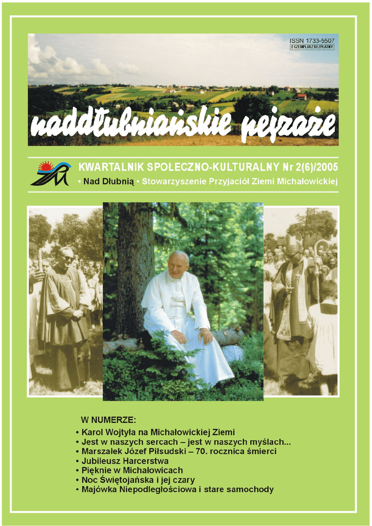 kwiecień • maj • czerwiec „Nad Dłubnią” Stowarzyszenie Przyjaciół Ziemi Michałowickiej 32-091 Michałowice I nr 101 tel./fax (012) 388 50 16 Sponsorem poprzedniego wydania – Nr 4 (2004) i 5 (2005) „Naddłubiańskie pejzaże” był Wójt Gminy Michałowice. Fotografie autorstwa Jerzego Massalskiego pochodzą z uroczystości 10-lecia Parafii i poświęcenia kościoła w Michałowicach. kwiecień • maj • czerwiec Jest w naszych sercach, jest w naszych myślach... Karol Wojtyła, jako alumn, młody ksiądz, biskup, arcybiskup, a wreszcie kardynał, wielokrotnie odwiedzał Michałowicką Ziemię. Pamięć o tych spotkaniach przetrwała w naszych sercach... RACIBOROWICE *** 1949 r. – Karol Wojtyła uczestniczy w Pogrzebie Kazimierza Rumiana – byłego kierownika szkoły w Raciborowicach, z którym spotykał się podczas wakacji 1945–1946. O jego śmierci – jak powiedział dzieciom zmarłego – dowiedział się z nekrologu w gazecie... Lato 1944 r. – Wakacje w parafii Raciborowice. Kleryk Karol Wojtyła mieszka na plebanii, zaproszony przez wikariusza tamtejszej parafii – ks. Adama Bielę, pochodzącego z Wadowic. *** „Kalendarium życia Karola Wojtyły” ks. Adam Boniecki WAKACJE KLERYCKIE „Dar i Tajemnica” – w pięćdziesiątą rocznicę moich święceń kapłańskich. Jan Paweł II, Kraków 1996 „Od czasu, kiedy nawiązałem kontakt z Seminarium (Jesienią roku 1942 powziąłem ostateczną decyzję wstąpienia do Krakowskiego Seminarium Duchownego, które działało w konspiracji), otwarła się nowa możliwość spędzania wakacji. Zostałem skierowany przez Księdza Arcybiskupa do podkrakowskiej parafii w Raciborowicach. Nie mogę nie wyrazić głębokiej wdzięczności dla proboszcza raciborowickiego, ks. Józefa Jamroza i dla księży wikarych, którzy byłi towarzyszami życia młodego tajnego seminarzysty. Wspominam zwłaszcza ks. Franciszka Szymonka, któAlumn – Karol Wojtyła ry potem w czasach terroru stalinowskiego był oskarżony w procesie pokazowym Kurii Krakowskiej i skazany na śmierć. Na szczęście po pewnym czasie został ułaskawiony. Wspominam także ks. Adama Bielę, mojego starszego kolegę z gimnazjum wadowickiego. Dzięki tym młodym kapłanom mogłem się zapoznać z życiem religijnym całej parafii. Niedługo potem na terenie wsi Bieńczyce, która należała do parafii w Raciborowicach, wyrosło olbrzymie osiedle związane z Nową Hutą. Przebywałem tam wiele dni w czasie wakacji, zarówno w roku 1944, jak też w roku 1945, po zakończeniu wojny. Wiele czasu spędzałem w starym raciborowickim kościele, pochodzącym jeszcze z czasów Jana Długosza. Wiele godzin przemedytowałem spacerując po cmentarzu. Przywoziłem do Raciborowic także swój warsztat studiów – tomy św. Tomasza z komentarzami. Uczyłem się teologii niejako w samym „centrum” wielkiej teologicznej tradycji. Pisałem już wówczas pracę o św. Janie od Krzyża. Kierownictwo tej pracy w Krakowie, już po otwarciu Uniwersytetu, przyjął ks. prof. Ignacy Różycki. Skończyłem ją natomiast na Angelicum, pod kierownictwem o. Prof. Garrigou Lagrange’a.” „Kleryka Karola Wojtyłę znam, jako młodzieńca wybitnie zdolnego, zamiłowanego w nauce i wiedzy świętej. Sprawy Boże są mu bardzo drogie, a do kapłaństwa zdąża szczerze. Pod względem moralnym nie tylko pewny, ale głęboko urobiony. Zaświadczenie niniejsze wydaje się na podstawie spostrzeżeń własnych i referencji”. 4 XI 1945 – ks. Matlak Józef – administrator parafii Urząd Parafialny św. Stanisława Kostki – Kraków-Dębniki (Archiwum Kurii Krakowskiej) (Karol Wojtyła mieszkał w tym czasie na Dębnikach, przy ul. Tynieckiej 10, w domu ś.p. Roberta Kaczorowskiego – swojego wuja). (Na podst.: „Gniazdo, z którego wyszedłem” – Ks. abp Karol Wojtyła) *** „Kiedy po wojnie przeniesiono ks. Adama Bielę do innej parafii, Karol Wojtyła, student teologii, nadal bywał podczas wakacji w Raciborowicach, zapraszany przez ówczesnego proboszcza, ks. Jamroza. Tam zaczęła się nasza znajomość. Spotkał mnie któregoś słonecznego dnia, jak w cieniu drzew męczyłem się nad łaciną. Szło mi trudno. Spotkanie zaczęło się od pozdrowienia – «Niech będzie pochwalony Jezus Chrystus»; pytał o naukę, o trudności i w końcu obiecał pomóc mi w łacinie. (...) Jako młody człowiek miałem wiele wątpliwości i trudnych pytań, ale ksiądz Wojtyła na wszystkie umiał i chciał odpowiedzieć. Nie zapomnę wspólnych wędrówek po okolicy, do Mogiły czy Krakowa. Po wakacjach Karol odwiedzał mnie w szkole przy ul. Krupniczej. Zazwyczaj przynosił coś do jedzenia. Zawsze też powiedział coś miłego i zachęcał do nauki. (...) Podczas wspólnego śniadania dowiedziałem się, że podczas wojny kościół św. Andrzeja był jego ulubionym miejscem modlitwy”. Była to praca doktorska, dotycząca kwestii wiary u św. Jana od Krzyża. Przygotowując tę dysertację, dowiedział się Karol Wojtyła, że w Krakowie, po długiej chorobie, w marcu 1947 r. umarł Jan Tyranowski – krawiec krakowski, samotnik, asceta, mistyk oczytany w pismach św. Jana od Krzyża i św. Teresy z Avila – z którym znajomość rozpoczęła się w roku 1940. Ten krawiec-apostoł pobudził Karola do pracy filozoficznej, najpewniej przyczyniając się do krystalizacji powołania kapłańskiego Wojtyły. Na wiadomość, o chorobie Jana, pisał Karol (z Rzymu) do przyjaciół w Krakowie: „Dziękuję za wszelkie wiadomości o p. Janie. W odpowiedzi załączam list do naszego drogiego Hioba. Tak, tak, jest to częsty bieg rzeczy. Pan Bóg wyniszcza w ten sposób tych, którzy Mu się dobrowolnie na takie wyniszczenie ofiarowali.” O. Romuald, cysters z klasztoru w Szczyrzycu *** „Opinia ludzka sądzi jak najlepiej o jego powołaniu do stanu duchownego (...) odznacza się szczególną cnotą pobożności. („Karol Wojtyła” – Adam Bujak, Michał Rożek, Wyd. Dolno