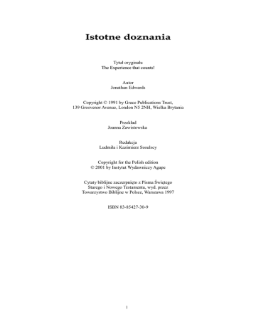 Istotne doznania Tytuł oryginału The Experience that counts! Autor Jonathan Edwards Copyright © 1991 by Grace Publications Trust, 139 Grosvenor Avenue, London N5 2NH, Wielka Brytania Przekład Joanna Zawistowska Redakcja Ludmiła i Kazimierz Sosulscy Copyright for the Polish edition © 2001 by Instytut Wydawniczy Agape Cytaty biblijne zaczerpnięto z Pisma Świętego Starego i Nowego Testamentu, wyd. przez Towarzystwo Biblijne w Polsce, Warszawa 1997 ISBN 83-85427-30-9 1 Słowo wstępne Jonathan Edwards (1703-1758), największy amerykański teolog, napisał swoją „Rozprawę o uczuciach religijnych” (Treatise concerning religious affections), skierowaną przeciwko środowisku Pierwszego Wielkiego Przebudzenia, amerykańskiego odpowiednika ruchu zwanego w Wielkiej Brytanii Przebudzeniem Ewangelicznym. Sam Edwards odegrał w tym Przebudzeniu znaczącą rolę jako pastor kościoła kongregacjonalnego w Northampton w Massachusetts. W obliczu przebudzenia, troską Edwardsa jako pastora było to, by umieć odróżniać prawdziwe i fałszywe doświadczenia duchowe. W latach 1742-1743 wygłosił na ten temat szereg kazań opartych na Pierwszym Liście Piotra (1,8). „Rozprawa” to zbiór tych kazań odpowiednio przygotowanych i wydanych w roku 1746 r. Edwards musiał toczyć wojnę na dwóch frontach. Z jednej strony spierał się z tymi, którzy uważali cały ten przebudzeniowy ruch za nierozumną histerię. Z drugiej zaś dyskutował również z tymi, którzy wydawali się uważać, że wszystko, co działo się w ramach tego ruchu było z Boga, bez względu na dziwny, czy niezrównoważony charakter tych zjawisk. Czy te dwie sprzeczne postawy nie wydają się nam znajome? Starając się wytyczyć ścieżkę pomiędzy tymi dwiema skrajnościami, Edwards musiał znaleźć odpowiedź na szereg fundamentalnych pytań. Co tak naprawdę znaczy być chrześcijaninem? Czy chrześcijaństwo to tylko kwestia intelektu? Co z pragnieniami, uczuciami, przeżyciami? Co to jest nawrócenie? Skąd wiemy, że ludzie je przeżyli? Jak daleko powinniśmy się posuwać w badaniu, czy widoczne nawrócenie było autentyczne? Jakie miejsce w chrześcijańskim doświadczeniu zajmuje pewność zbawienia? Do doświadczania których duchowych przeżyć powinniśmy zachęcać, od których zaś odwodzić? Jak możemy badać, czy nasza własna wiara jest szczera i prawdziwa? Po czym poznać duchową hipokryzję i oszustwo? Możemy nie doświadczać akurat przebudzenia, ale zarówno te pytania, jak i odpowiedzi, jakie daje na nie Edwards, mają dla nas dzisiaj duże znaczenie. Być może nigdy nie kładziono takiego nacisku na uczucia i przeżycia i nie poszukiwano ich tak chętnie, jak ma to miejsce wśród chrześcijan naszego pokolenia. Zbyt często efekty tych starań, pozbawione równowagi i przenikliwości, były wręcz duchowo szkodliwe. W odpowiedzi 2 na to, inni popadli w twardą, zimną, suchą ortodoksję, patrząc bardzo podejrzliwie na wszystko, co „emocjonalne”. Edwards oferuje nam swego rodzaju „przewodnik dla zagubionych” - łącząc biblijne zasady i trzeźwy duchowy osąd, przeprowadza nas bezpiecznie przez labirynt zamieszania panującego w tym jakże ważnym zagadnieniu. Uwaga na temat uczuć i emocji Słowo uczucia affection pojawia się zarówno w oryginalnym tytule książki Edwardsa, jak i na jej stronach. Dziś uczucie oznacza dla nas pewien rodzaj miłości, jednak w czasach Edwardsa miało dużo szersze znaczenie. Zdecydowałem się więc na użycie nowocześniejszego słowa emocje, wydającego się najlepiej ze współczesnych terminów oddawać to, co Edwards miał na myśli używając terminu uczucia. Słownik oksfordzki podaje trzynaście definicji słowa uczucie. W drugiej i piątej znajdujemy to, o co chodziło Edwardsowi: emocja lub odczucie; nastawienie odnośnie do jakiejś rzeczy; postawa wobec czegoś. Dla Edwardsa emocje emotions były to odruchy woli. Właściwie to w części pierwszej, w rozdziale II. Edwards jasno definiuje emocje jako żywe i potężne odruchy woli. Za pomocą intelektu postrzegamy rzeczy; za pomocą woli zaś decydujemy o tym, czy lubimy lub nie lubimy to, co widzimy. Tak więc emocja zawsze zakłada udział zarówno intelektu, jak i woli. Znaczy to po prostu (dla Edwardsa) zdecydowaną odpowiedź woli na to, co dostrzega intelekt - bez względu na to, czy odpowiedzią tą jest pragnienie, nadzieja, radość, miłość, gorliwość, litość, zmartwienie, strach, złość czy nienawiść. Te właśnie zdecydowane odpowiedzi woli Edwards nazwał uczuciami. Ja nazywam je „emocjami” (w polskim przekładzie używamy terminu „uczucia” - przyp. tłum.). Dopóki mamy w pamięci zjawiska, o których mówi Edwards, nie liczy się zbytnio to, jak je nazwiemy. Ponieważ jednak znaczenie słowa „uczucie” znacznie się w dzisiejszej potocznej mowie zawęziło, by nie wprowadzać w błąd, porzuciłem ten termin na rzecz „emocji”. Gdziekolwiek słowo „uczucie” pojawia się w tym zawężonym znaczeniu, zgodnie ze współczesnym słownikiem oznacza po prostu „miłość” (w polskim wydaniu używamy słowa uczucie - przyp. tłum.). 3 Przedmowa Kluczowym pytaniem, na które musi odpowiedzieć sobie zarówno cały ludzki rodzaj, jak i każdy indywidualnie jest to: „Co charakteryzuje ludzi, którzy cieszą się Bożą przychylnością - tych, którzy zmierzają do nieba?” Innymi słowy: „Na czym polega prawdziwa pobożność? Jaki rodzaj osobistej duchowości podoba się Bogu?” Na tak kontrowersyjne pytanie trudno dać obiektywną odpowiedź. Jeszcze trudniej obiektywnie pisać na ten temat. Najtrudniej zaś obiektywnie o tym czytać! Zapewne wielu czytelników poczuje się dotkniętych tym, że w książce tej skrytykowałem tak wiele religijnych uczuć i przeżyć. Z drugiej zaś strony niektórych może drażnić to, że pewnych postaw bronię, czy je pochwalam. Starałem się zachować równowagę. Nie jest wcale łatwo wspierać
