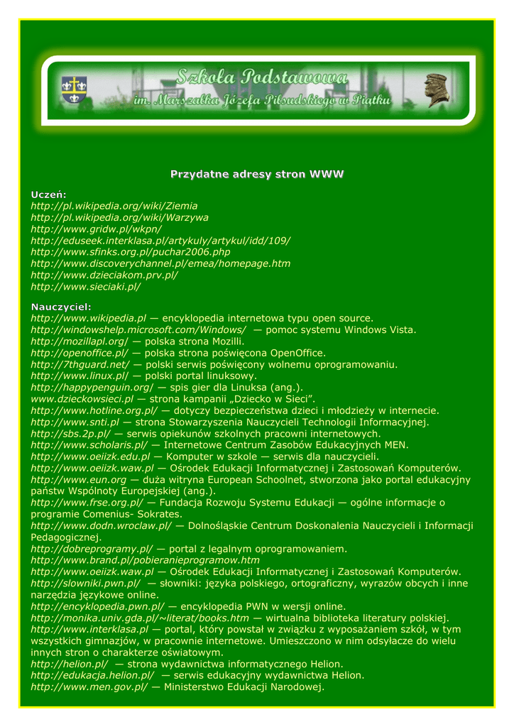 Przydatne adresy stron WWW Uczeń: http://pl.wikipedia.org/wiki/Ziemia http://pl.wikipedia.org/wiki/Warzywa http://www.gridw.pl/wkpn/ http://eduseek.interklasa.pl/artykuly/artykul/idd/109/ http://www.sfinks.org.pl/puchar2006.php http://www.discoverychannel.pl/emea/homepage.htm http://www.dzieciakom.prv.pl/ http://www.sieciaki.pl/ Nauczyciel: http://www.wikipedia.pl — encyklopedia internetowa typu open source. http://windowshelp.microsoft.com/Windows/ — pomoc systemu Windows Vista. http://mozillapl.org/ — polska strona Mozilli. http://openoffice.pl/ — polska strona poświęcona OpenOffice. http://7thguard.net/ — polski serwis poświęcony wolnemu oprogramowaniu. http://www.linux.pl/ — polski portal linuksowy. http://happypenguin.org/ — spis gier dla Linuksa (ang.). www.dzieckowsieci.pl — strona kampanii „Dziecko w Sieci”. http://www.hotline.org.pl/ — dotyczy bezpieczeństwa dzieci i młodzieży w internecie. http://www.snti.pl — strona Stowarzyszenia Nauczycieli Technologii Informacyjnej. http://sbs.2p.pl/ — serwis opiekunów szkolnych pracowni internetowych. http://www.scholaris.pl/ — Internetowe Centrum Zasobów Edukacyjnych MEN. http://www.oeiizk.edu.pl — Komputer w szkole — serwis dla nauczycieli. http://www.oeiizk.waw.pl — Ośrodek Edukacji Informatycznej i Zastosowań Komputerów. http://www.eun.org — duża witryna European Schoolnet, stworzona jako portal edukacyjny państw Wspólnoty Europejskiej (ang.). http://www.frse.org.pl/ — Fundacja Rozwoju Systemu Edukacji — ogólne informacje o programie Comenius- Sokrates. http://www.dodn.wroclaw.pl/ — Dolnośląskie Centrum Doskonalenia Nauczycieli i Informacji Pedagogicznej. http://dobreprogramy.pl/ — portal z legalnym oprogramowaniem. http://www.brand.pl/pobieranieprogramow.htm http://www.oeiizk.waw.pl — Ośrodek Edukacji Informatycznej i Zastosowań Komputerów. http://slowniki.pwn.pl/ — słowniki: języka polskiego, ortograficzny, wyrazów obcych i inne narzędzia językowe online. http://encyklopedia.pwn.pl/ — encyklopedia PWN w wersji online. http://monika.univ.gda.pl/~literat/books.htm — wirtualna biblioteka literatury polskiej. http://www.interklasa.pl — portal, który powstał w związku z wyposażaniem szkół, w tym wszystkich gimnazjów, w pracownie internetowe. Umieszczono w nim odsyłacze do wielu innych stron o charakterze oświatowym. http://helion.pl/ — strona wydawnictwa informatycznego Helion. http://edukacja.helion.pl/ — serwis edukacyjny wydawnictwa Helion. http://www.men.gov.pl/ — Ministerstwo Edukacji Narodowej. http://www.kprm.gov.pl/ — Kancelaria Prezesa Rady Ministrów. http://www.sejm.gov.pl/ — Sejm Rzeczypospolitej Polskiej. http://www.senat.gov.pl/ — Senat Rzeczypospolitej Polskiej. http://www.cke.edu.pl — Centralna Komisja Egzaminacyjna. http://www.codn.edu.pl — Centralny Ośrodek Doskonalenia Nauczycieli w Warszawie. http://www.cmppp.edu.pl — Centrum Metodyczne Pomocy Psychologiczno-Pedagogicznej. http://www.ibe.home.pl/ — Instytut Badań Edukacyjnych Ministerstwa Edukacji Narodowej w Warszawie. http://www.scholaris.pl/Portal — Internetowe Centrum Zasobów Edukacyjnych MEN. http://www.partnerstwodlaprzyszlosci.edu.pl/pdp/default.aspx — Partnerstwo dla Przyszłości to program wspierania edukacji informatycznej, który łączy szeroki dostęp do oprogramowania (programy Nowy Początek i Otwarta Platforma) z inwestycjami w edukację informatyczną w szkołach (projekty Innowacyjni Nauczyciele). http://www.saferinternetday.pl/ — portal poświęcony organizacji Dnia Bezpiecznego Internetu. http://browsehappy.pl/ — pobieralnia przegkadarek. Kampania BrowseHappy.pl jest niekomercyjna i nie jest w żaden sposób związana z producentami polecanych przeglądarek.