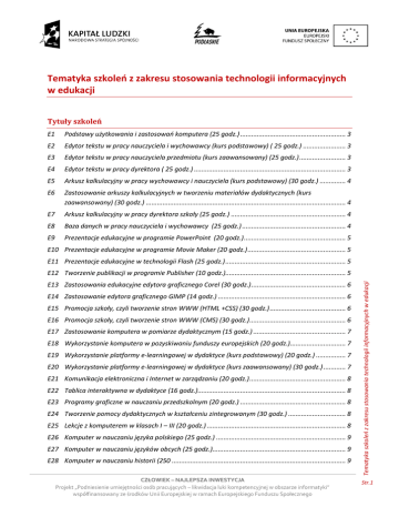 Tematyka szkoleń z zakresu stosowania technologii informacyjnych w edukacji Tytuły szkoleń E1 Podstawy użytkowania i zastosowao komputera (25 godz.) ......................................................... 3 E2 Edytor tekstu w pracy nauczyciela i wychowawcy (kurs podstawowy) ( 25 godz.) ....................... 3 E3 Edytor tekstu w pracy nauczyciela przedmiotu (kurs zaawansowany) (25 godz.) ......................... 3 E4 Edytor tekstu w pracy dyrektora ( 25 godz.) .................................................................................. 3 E5 Arkusz kalkulacyjny w pracy wychowawcy i nauczyciela (kurs podstawowy) (30 godz.) .............. 4 E6 Zastosowanie arkuszy kalkulacyjnych w tworzeniu materiałów dydaktycznych (kurs zaawansowany) (30 godz.) ............................................................................................................ 4 E7 Arkusz kalkulacyjny w pracy dyrektora szkoły (25 godz.) .............................................................. 4 E8 Baza danych w pracy nauczyciela i wychowawcy (25 godz.) ........................................................ 4 E9 Prezentacje edukacyjne w programie PowerPoint (20 godz.) ....................................................... 5 E10 Prezentacje edukacyjne w programie Movie Maker (20 godz.) ..................................................... 5 E11 Prezentacje edukacyjne w technologii Flash (25 godz.) ................................................................. 5 E13 Zastosowania edukacyjne edytora graficznego Corel (30 godz.) ................................................... 6 E14 Zastosowanie edytora graficznego GIMP (14 godz.) ..................................................................... 6 E15 Promocja szkoły, czyli tworzenie stron WWW (HTML +CSS) (30 godz.) ......................................... 6 E16 Promocja szkoły, czyli tworzenie stron WWW (CMS) (30 godz.) .................................................... 6 E17 Zastosowanie komputera w pomiarze dydaktycznym (15 godz.) .................................................. 7 E18 Wykorzystanie komputera w pozyskiwaniu funduszy europejskich (20 godz.).............................. 7 E19 Wykorzystanie platformy e-learningowej w dydaktyce (kurs podstawowy) (20 godz.) ................ 7 E20 Wykorzystanie platformy e-learningowej w dydaktyce (kurs zaawansowany) (30 godz.) ............ 7 E21 Komunikacja elektroniczna i Internet w zarządzaniu (20 godz.) .................................................... 8 E22 Tablica interaktywna w dydaktyce (16 godz.)................................................................................ 8 E23 Programy graficzne w nauczaniu przedszkolnym (20 godz.) ......................................................... 8 E24 Tworzenie pomocy dydaktycznych w kształceniu zintegrowanym (30 godz.) ............................... 8 E25 Lekcje z komputerem w klasach I – III (20 godz.) ........................................................................... 8 E26 Komputer w nauczaniu języka polskiego (25 godz.) ...................................................................... 9 E27 Komputer w nauczaniu języków obcych (25 godz.)........................................................................ 9 E28 Komputer w nauczaniu historii (250 .............................................................................................. 9 CZŁOWIEK – NAJLEPSZA INWESTYCJA Projekt „Podniesienie umiejętności osób pracujących – likwidacja luki kompetencyjnej w obszarze informatyki” współfinansowany ze środków Unii Europejskiej w ramach Europejskiego Funduszu Społecznego Tematyka szkoleo z zakresu stosowania technologii informacyjnych w edukacji E12 Tworzenie publikacji w programie Publisher (10 godz.)................................................................. 5 Str.1 E29 Komputer w nauczaniu plastyki (25 godz.) .................................................................................... 9 E30 Komputer w nauczaniu muzyki (25 godz.) ................................................................................... 10 E31 Komputer w nauczaniu chemii (25 godz.) .................................................................................... 10 E32 Komputer w nauczaniu biologii (25 godz.) ................................................................................... 10 E33 Komputer w nauczaniu fizyki (25 godz.) ...................................................................................... 10 E34 Komputer w nauczaniu geografii (25 godz.) ................................................................................ 11 E35 Komputer w nauczaniu matematyki (25 godz.) ........................................................................... 11 E36 Cabrii i inne programy w nauczaniu matematyki (30 godz.) ....................................................... 11 E37 Przygotowanie uczniów do konkursów informatycznych (Logomocja) (30 godz.) ...................... 11 E38 Przygotowanie uczniów do konkursów informatycznych (C++) (30 godz.) .................................. 12 E39 Programowanie w Java (30 godz.) ............................................................................................... 12 E40 Instalacja i zarządzanie platformą e-learningową (10 godz.) ...................................................... 12 E41 CMS Joomla instalacja i zarządzanie (20 godz.) .......................................................................... 12 E42 CMS Webuzzz instalacja i zarządzanie (20 godz.) ........................................................................ 13 E43 System operacyjny Linux na komputerach w szkole (30 godz.) ................................................... 13 E44 Opiekun pracowni komputerowej (kurs podstawowy) (30 godz.) ............................................... 13 Tematyka szkoleo z zakresu stosowania technologii informacyjnych w edukacji E45 Opiekun pracowni komputerowej (kurs zaawansowany) (30 godz.) .....