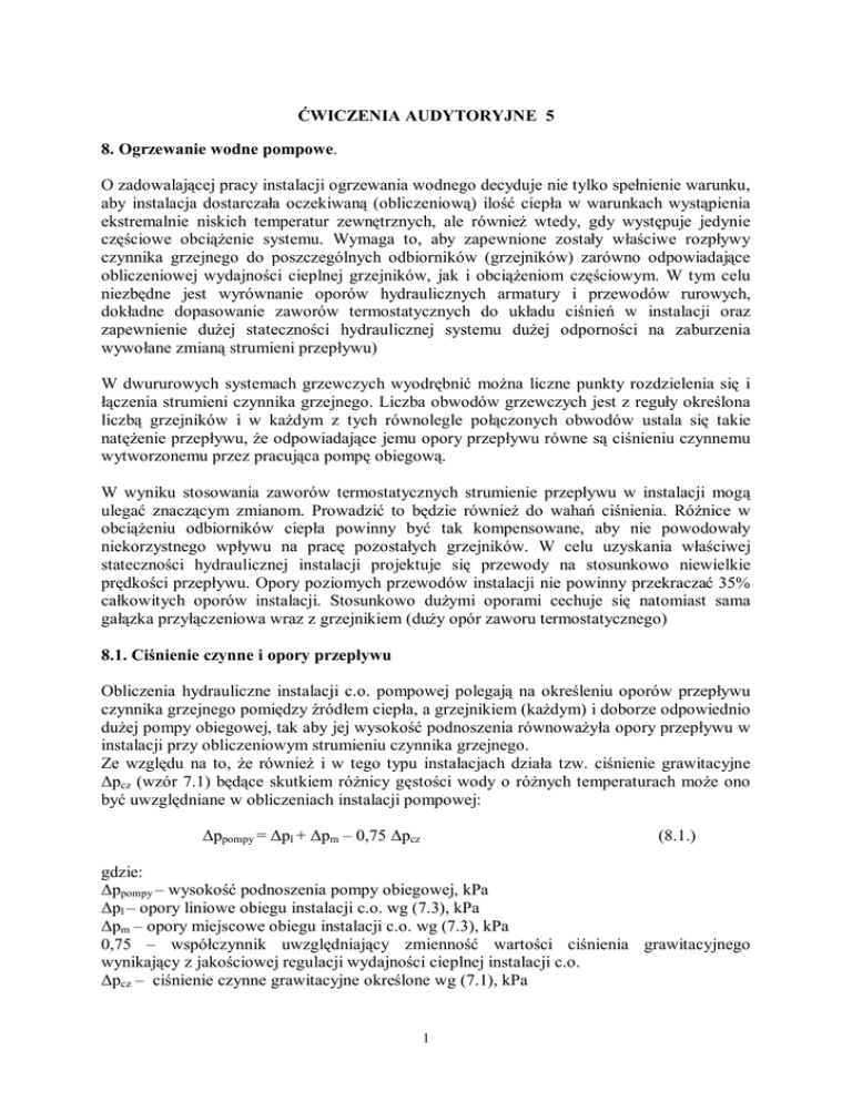 ĆWICZENIA AUDYTORYJNE 5 8. Ogrzewanie wodne pompowe. O zadowalającej pracy instalacji ogrzewania wodnego decyduje nie tylko spełnienie warunku, aby instalacja dostarczała oczekiwaną (obliczeniową) ilość ciepła w warunkach wystąpienia ekstremalnie niskich temperatur zewnętrznych, ale również wtedy, gdy występuje jedynie częściowe obciążenie systemu. Wymaga to, aby zapewnione zostały właściwe rozpływy czynnika grzejnego do poszczególnych odbiorników (grzejników) zarówno odpowiadające obliczeniowej wydajności cieplnej grzejników, jak i obciążeniom częściowym. W tym celu niezbędne jest wyrównanie oporów hydraulicznych armatury i przewodów rurowych, dokładne dopasowanie zaworów termostatycznych do układu ciśnień w instalacji oraz zapewnienie dużej stateczności hydraulicznej systemu dużej odporności na zaburzenia wywołane zmianą strumieni przepływu) W dwururowych systemach grzewczych wyodrębnić można liczne punkty rozdzielenia się i łączenia strumieni czynnika grzejnego. Liczba obwodów grzewczych jest z reguły określona liczbą grzejników i w każdym z tych równolegle połączonych obwodów ustala się takie natężenie przepływu, że odpowiadające jemu opory przepływu równe są ciśnieniu czynnemu wytworzonemu przez pracująca pompę obiegową. W wyniku stosowania zaworów termostatycznych strumienie przepływu w instalacji mogą ulegać znaczącym zmianom. Prowadzić to będzie również do wahań ciśnienia. Różnice w obciążeniu odbiorników ciepła powinny być tak kompensowane, aby nie powodowały niekorzystnego wpływu na pracę pozostałych grzejników. W celu uzyskania właściwej stateczności hydraulicznej instalacji projektuje się przewody na stosunkowo niewielkie prędkości przepływu. Opory poziomych przewodów instalacji nie powinny przekraczać 35% całkowitych oporów instalacji. Stosunkowo dużymi oporami cechuje się natomiast sama gałązka przyłączeniowa wraz z grzejnikiem (duży opór zaworu termostatycznego) 8.1. Ciśnienie czynne i opory przepływu Obliczenia hydrauliczne instalacji c.o. pompowej polegają na określeniu oporów przepływu czynnika grzejnego pomiędzy źródłem ciepła, a grzejnikiem (każdym) i doborze odpowiednio dużej pompy obiegowej, tak aby jej wysokość podnoszenia równoważyła opory przepływu w instalacji przy obliczeniowym strumieniu czynnika grzejnego. Ze względu na to, że również i w tego typu instalacjach działa tzw. ciśnienie grawitacyjne Δpcz (wzór 7.1) będące skutkiem różnicy gęstości wody o różnych temperaturach może ono być uwzględniane w obliczeniach instalacji pompowej: Δppompy = Δpl + Δpm – 0,75 Δpcz (8.1.) gdzie: Δppompy – wysokość podnoszenia pompy obiegowej, kPa Δpl – opory liniowe obiegu instalacji c.o. wg (7.3), kPa Δpm – opory miejscowe obiegu instalacji c.o. wg (7.3), kPa 0,75 – współczynnik uwzględniający zmienność wartości ciśnienia grawitacyjnego wynikający z jakościowej regulacji wydajności cieplnej instalacji c.o. Δpcz – ciśnienie czynne grawitacyjne określone wg (7.1), kPa 1 Ponieważ wielkość ciśnienia czynnego jest stosunkowo niewielka, zmienna w sezonie grzewczym, a instalacja c.o. wyposażana powinna być w przygrzejnikowe zawory regulacyjne, w instalacjach “niskich” (kilka kondygnacji) można w zasadzie zrezygnować we wzorze (8.1) z uwzględnienia wpływu ciśnienia grawitacyjnego. W takim przypadku wzór uprości się do postaci: Δppompy = Δpl + Δpm (8.2.) Opór zaworu termostatycznego jest stosunkowo duży i musi zostać precyzyjnie dobrany, w związku z tym w obliczeniach wyodrębniany jest jako oddzielnie określana wartość Δpzaworu, a wzór na wysokość podnoszenia pompy uzyskuje wówczas postać: Δppompy = Δpl + Δpm + Δpzaworu – 0,75 Δpcz Δppompy = Δpl + Δpm + Δpzaworu (8.3 a) (8.3 b) przy czym w tym przypadku Δpm są oporami miejscowymi obiegu instalacji c.o. bez uwzględnienia w nich oporów zaworu termostatycznego. Użyte powyżej określenie “stosunkowo duży” dotyczące oporu zaworu termostatycznego jest bardzo nieprecyzyjne. W automatyce stosowane jest pojęcie AUTORYTRTU zaworu regulacyjnego “a”, który określa udział oporów tego zaworu w całkowitych oporach obiegu, w którym następować będzie zmiana strumienia czynnika w wyniku działania tego zaworu. a = Δpzaworu / (Δpl + Δpm + Δpzaworu ) (8.4.) Wymagana wielkość autorytetu zależy od charakterystyki hydraulicznej armatury regulacyjnej, dla większości zaworów termostatycznych można go przyjmować w zakresie 0,3-0,7, przy czym mniejsza wartość dotyczy zaworów obiegu grzejnika najniekorzystniej usytuowanego, większa obiegów najkorzystniejszych. Należy pamiętać, że obliczeniowy spadek ciśnienia na zaworze powinien zawierać się w przedziale 4-15 kPa i należy go tak dobrać, aby jego opór wyrównywał sumaryczne straty obiegu do ustalonej wysokości podnoszenia pompy obiegowej. W warunkach innych niż obliczeniowe przyrost oporu na zaworze nie powinien przekraczać 100% wartości obliczeniowej. Zbyt duże spadki ciśnienia, zarówno w warunkach obliczeniowych, a przede wszystkim w pozostałym okresie może być przyczyną szumów lub bardzo uciążliwych pisków (dopuszcza się hałas do poziomu 30-40 dB). Najlepszym rozwiązaniem byłby taki zawór, który przy przyjętej różnicy ciśnień i odchyłce regulacji równej 2 K bez dodatkowych zewnętrznych elementów dławiących gwarantował dopływ czynnika grzejnego w ilości zapewniającej utrzymanie obliczeniowej temperatury w pomieszczeniu. Najczęściej stosuje się jednak rozwiązanie, w którym zawory posiadają wbudowane elementy zwiększające w sposób trwały ich oporność. Zawór z nastawą wstępną zapewnia duża uniwersalność takiej konstrukcji (produkcja masowa) oraz możliwość korekty oporów instalacji już w trakcie jej eksploatacji. Znając wartość (Δpl + Δpm) obiegu grzejnika i zakł