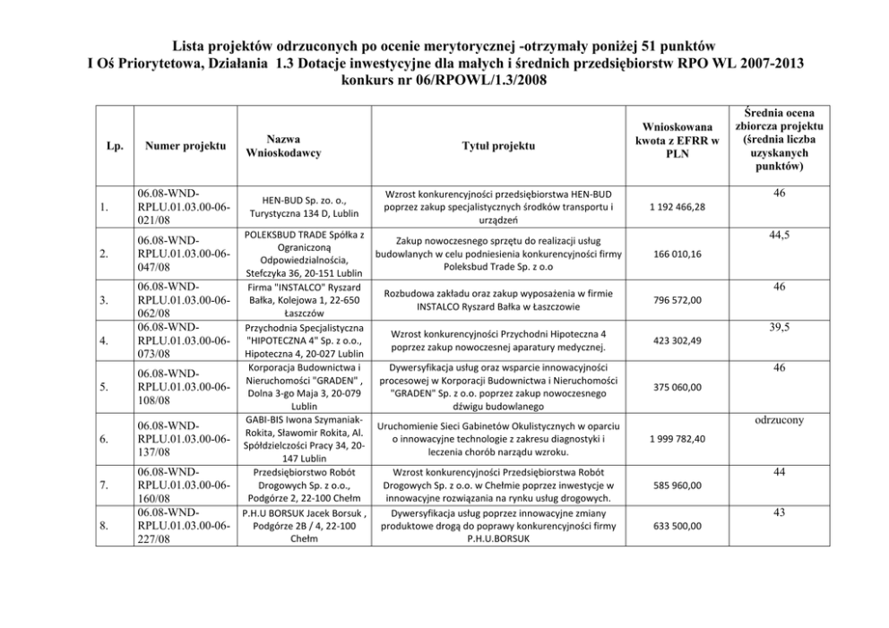 Lista projektów odrzuconych po ocenie merytorycznej -otrzymały poniŜej 51 punktów I Oś Priorytetowa, Działania 1.3 Dotacje inwestycyjne dla małych i średnich przedsiębiorstw RPO WL 2007-2013 konkurs nr 06/RPOWL/1.3/2008 Lp. Numer projektu 1. 06.08-WNDRPLU.01.03.00-06021/08 2. 06.08-WNDRPLU.01.03.00-06047/08 3. 4. 06.08-WNDRPLU.01.03.00-06062/08 06.08-WNDRPLU.01.03.00-06073/08 5. 06.08-WNDRPLU.01.03.00-06108/08 6. 06.08-WNDRPLU.01.03.00-06137/08 7. 8. 06.08-WNDRPLU.01.03.00-06160/08 06.08-WNDRPLU.01.03.00-06227/08 Nazwa Wnioskodawcy HEN-BUD Sp. zo. o., Turystyczna 134 D, Lublin Tytuł projektu Wzrost konkurencyjności przedsiębiorstwa HEN-BUD poprzez zakup specjalistycznych środków transportu i urządzeń POLEKSBUD TRADE Spółka z Zakup nowoczesnego sprzętu do realizacji usług Ograniczoną budowlanych w celu podniesienia konkurencyjności firmy Odpowiedzialnościa, Poleksbud Trade Sp. z o.o Stefczyka 36, 20-151 Lublin Firma "INSTALCO" Ryszard Rozbudowa zakładu oraz zakup wyposażenia w firmie Bałka, Kolejowa 1, 22-650 INSTALCO Ryszard Bałka w Łaszczowie Łaszczów Przychodnia Specjalistyczna Wzrost konkurencyjności Przychodni Hipoteczna 4 "HIPOTECZNA 4" Sp. z o.o., poprzez zakup nowoczesnej aparatury medycznej. Hipoteczna 4, 20-027 Lublin Korporacja Budownictwa i Dywersyfikacja usług oraz wsparcie innowacyjności Nieruchomości "GRADEN" , procesowej w Korporacji Budownictwa i Nieruchomości Dolna 3-go Maja 3, 20-079 "GRADEN" Sp. z o.o. poprzez zakup nowoczesnego dźwigu budowlanego Lublin GABI-BIS Iwona SzymaniakUruchomienie Sieci Gabinetów Okulistycznych w oparciu Rokita, Sławomir Rokita, Al. o innowacyjne technologie z zakresu diagnostyki i Spółdzielczości Pracy 34, 20leczenia chorób narządu wzroku. 147 Lublin Przedsiębiorstwo Robót Wzrost konkurencyjności Przedsiębiorstwa Robót Drogowych Sp. z o.o., Drogowych Sp. z o.o. w Chełmie poprzez inwestycje w Podgórze 2, 22-100 Chełm innowacyjne rozwiązania na rynku usług drogowych. P.H.U BORSUK Jacek Borsuk , Dywersyfikacja usług poprzez innowacyjne zmiany Podgórze 2B / 4, 22-100 produktowe drogą do poprawy konkurencyjności firmy Chełm P.H.U.BORSUK Wnioskowana kwota z EFRR w PLN Średnia ocena zbiorcza projektu (średnia liczba uzyskanych punktów) 46 1 192 466,28 44,5 166 010,16 46 796 572,00 39,5 423 302,49 46 375 060,00 odrzucony 1 999 782,40 44 585 960,00 43 633 500,00 9. 10. 06.08-WNDRPLU.01.03.00-06228/08 06.08-WNDRPLU.01.03.00-06237/08 USŁUGI PRZEŁADUNKOWE Marta Borsuk , Szpitalna 19, 22-100 Chełm Dywersyfikacja usług w firmie USŁUGI PRZEŁADUNKOWE Marta Borsuk celem poprawy konkurencyjności na rynku krajowym Energotec Sp. z o.o., Rurowa 88, 21-400 Łuków Zakup koparko-ładowarki oraz podnośnika koszowego w celu udoskonalenia usług elektroenergetycznych 48 1 060 500,00 48 369 729,15
