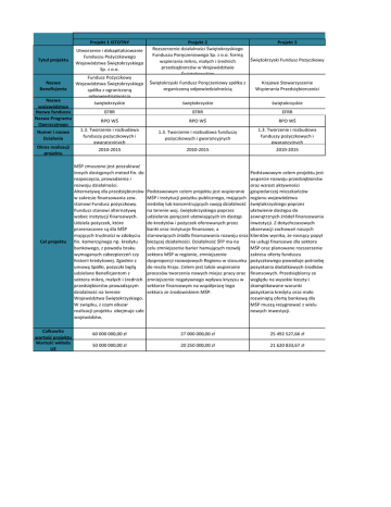 Projekt 1 ISTOTNY Tytuł projektu Nazwa Beneficjenta Nazwa województwa Nazwa funduszu Nazwa Programu Operacyjnego Numer i nazwa Działania Okres realizacji projektu Cel projektu Całkowita wartość projektu Wartość wkładu UE Projekt 2 Rozszerzenie działalności Świętokrzyskiego Funduszu Poręczeniowego Sp. z o.o. formą wspierania mikro, małych i średnich przedsiębiorców w Województwie Świętokrzyskim Świętokrzyski Fundusz Pożyczkowy Świętokrzyski Fundusz Poręczeniowy spółka z organiczoną odpowiedzialnością Krajowe Stowarzyszenie Wspierania Przedsiębiorczości świętokrzyskie świętokrzyskie EFRR EFRR EFRR RPO WŚ RPO WŚ RPO WŚ 1.3. Tworzenie i rozbudowa funduszy pożyczkowych i gwarancyjnych 1.3. Tworzenie i rozbudowa funduszy pożyczkowych i gwarancyjnych 1.3. Tworzenie i rozbudowa funduszy pożyczkowych i gwarancyjnych 2010-2015 2010-2015 2010-2015 MŚP zmuszone jest poszukiwać innych dostępnych metod fin. do rozpoczęcia, prowadzenia i rozwoju działalności. Alternatywę dla przedsiębiorców w zakresie finansowania zew. stanowi Fundusz pożyczkowy. Fundusz stanowi alternatywę wobec instytucji finansowych. Udziela pożyczek, które przeznaczone są dla MŚP mających trudności w zdobyciu fin. komercyjnego np. kredytu bankowego, z powodu braku wymaganych zabezpieczeń czy historii kredytowej. Zgodnie z umową Spółki, pożyczki będą udzielane Beneficjentom z sektora mikro, małych i średnich przedsiębiorstw prowadzącym działalność na terenie Województwa Świętokrzyskiego. W związku, z czym obszar realizacji projektu obejmuje całe województw. Podstawowym celem projektu jest wspieranie MŚP i instytucji pożytku publicznego, mających siedzibę lub koncentrujących swoją działalność na terenie woj. świętokrzyskiego poprzez udzielanie poręczeń ułatwiających im dostęp do kredytów i pożyczek oferowanych przez banki oraz instytucje finansowe, a stanowiących źródła finansowania rozwoju oraz bieżącej działalności. Działalność ŚFP ma na celu zmniejszenie barier hamujących rozwój sektora MŚP w regionie, zmniejszenie dysproporcji rozwojowych Regionu w stosunku do reszty Kraju. Celem jest także wspieranie procesów tworzenia nowych miejsc pracy oraz zmniejszenie negatywnego wpływu kryzysu w sektorze finansowym na współpracę tego sektora ze środowiskiem MŚP. Podstawowym celem projektu jest wsparcie rozwoju przedsiębiorstw oraz wzrost aktywności gospodarczej mieszkańców regionu województwa świętokrzyskiego poprzez ułatwienie dostępu do zewnętrznych źródeł finansowania inwestycji. Z dotychczasowych obserwacji zachowań naszych klientów wynika, że rosnący popyt na usługi finansowe dla sektora MŚP oraz planowane rozszerzenie zakresu oferty funduszu pożyczkowego powoduje potrzebę pozyskania dodatkowych środków finansowych. Przedsiębiorcy ze względu na wysokie koszty i skomplikowane warunki pozyskania kredytu oraz mało rozwiniętą ofertę bankową dla MŚP muszą rezygnować z wielu nowych inwestycji. 60 000 000,00 zł 27 000 000,00 zł 25 492 527,66 zł 50 000 000,00 zł 20 250 000,00 zł 21 620 833,67 zł Utworzenie i dokapitalizowanie Funduszu Pożyczkowego Województwa Świętokrzyskiego Sp. z o.o. Fundusz Pożyczkowy Województwa Świętokrzyskiego spółka z ograniczoną odpowiedzialnością świętokrzyskie Projekt 3 Projekt 4 Projekt 5 Budowa infrastruktury technicznej-dróg, Budowa nowej siedziby Koneckiego sieci kanalizacji sanitarnej, deszczowe i Stowarzyszenia Wspierania Przedsiębiorczości jako centrum obsługi wodociągowej dla terenów zabudowy produkcji w części terenu Końskich i przedsiębiorców w Końskich sołectwa Kornica Projekty komplementarne Projekt 6 WŁASNY BIZNES szansą dla NIEJ i dla NIEGO Krajowe Stowarzyszenie Wspierania Przedsiębiorczości Gmina Końskie Krajowe Stowarzyszenie Wspierania Przedsiębiorczości świętokrzyskie świętokrzyskie świętokrzyskie EFRR EFRR EFS RPO WŚ RPO WŚ PO KL 1.4. Wsparcie inwestycyjne dla instytucji 2.4. Tworzenie kompleksowych terenów otoczenia biznesu inwestycyjnych 2010-2012 Podstawowym celem projektu jest podniesienie konkurencyjności oferty Wnioskodawcy. Rosnący popyt na usługi oraz planowane rozszerzenie zakresu świadczonych usług doradczych i szkoleniowych powoduje potrzebę wzrostu zatrudnienia. Obecne braki lokalowe utrudniają tworzenie nowych miejsc pracy i ograniczają możliwość świadczenia usług. Analiza sytuacji bieżącej wykazała więc konieczność zmiany siedziby firmy. Bezpośrednim wynikiem realizowanego przedsięwzięcia będzie stworzenie i wyposażenie nowego budynku. Pozwoli to w pełni zaspokoić potrzeby Stowarzyszenia w analizowanym zakresie. Większa powierzchnia oraz nowi pracownicy umożliwią wprowadzenie nowych usług dzięki czemu wzrośnie też ogólna konkurencyjność oferty Wnioskodawcy na rynku regionalnym i lokalnym. Realizacji projektu umożliwi wzrost zatrudnienia o 6 osób bezpośrednio po jego zakończeniu. 2009-2012 6.2. Wsparcie oraz promocja przedsiębiorczości i samozatrudnienia 2012-2014 Projekt adresowany jest do osób fizycznych długotrwale bezrobotnych zamierzających rozpocząć prowadzenie działalności gospodarczej z powiatu koneckiego. W ramach realizacji projektu uczestnikom zostanie udzielone Główne cele projektu to stworzenie następujące wsparcie: warunków do wzrostu gospodarczego i - doradztwo oraz szkolenia („ABC poprawy jakości życia społecznego Przedsiębiorczości") umożliwiające poprzez realizację inwestycji służących uzyskanie wiedzy i umiejętności rozwojowi gospodarki. Przedmiotowy potrzebnych do założenia i prowadzenia projekt wpłynie na rozwój społecznodziałalności gospodarczej; gospodarczy regionu, przyczyni się do - przyznanie środków finansowych na podwyższenia standardu życia rozwój przedsiębiorczości; mieszkańców oraz standardów pracy i - wsparcie pomostowe w następującej funkcjonowania firm, popraw