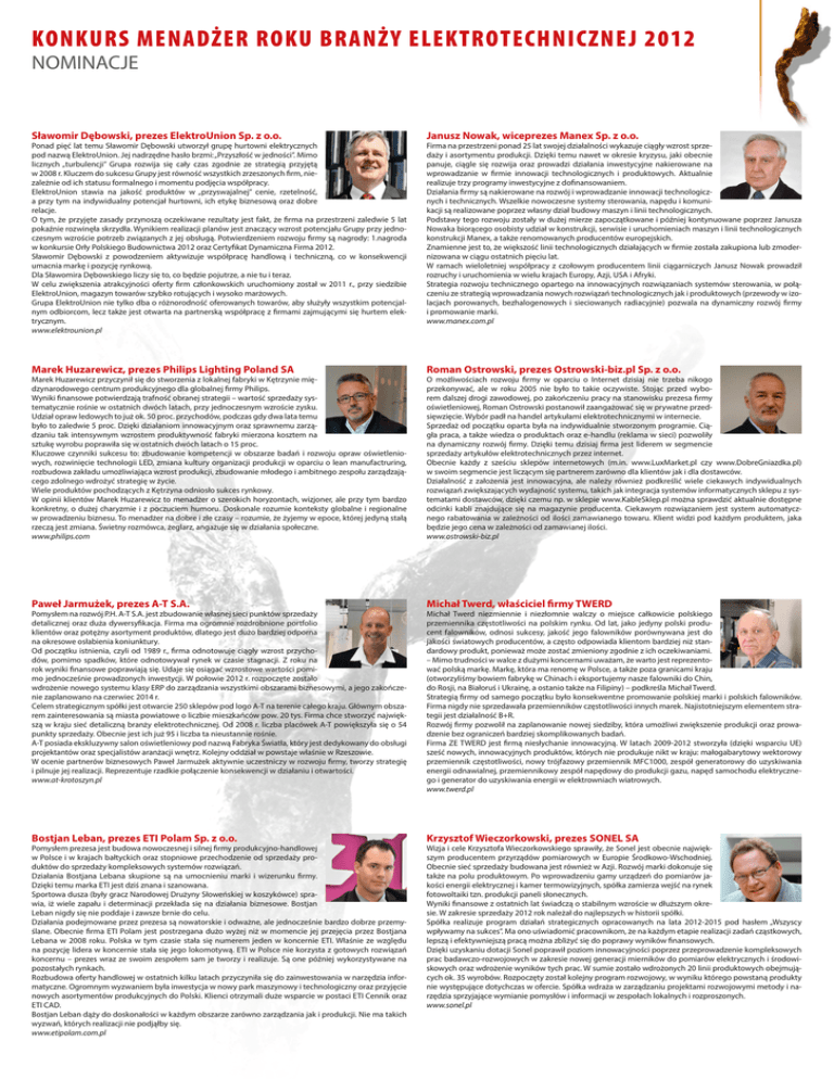 KONKURS MENADŻER ROKU BRANŻ Y ELEKTROTECHNICZNE J 2012 NOMINACJE Sławomir Dębowski, prezes ElektroUnion Sp. z o.o. Janusz Nowak, wiceprezes Manex Sp. z o.o. Marek Huzarewicz, prezes Philips Lighting Poland SA Roman Ostrowski, prezes Ostrowski-biz.pl Sp. z o.o. Paweł Jarmużek, prezes A-T S.A. Michał Twerd, właściciel firmy TWERD Bostjan Leban, prezes ETI Polam Sp. z o.o. Krzysztof Wieczorkowski, prezes SONEL SA Ponad pięć lat temu Sławomir Dębowski utworzył grupę hurtowni elektrycznych pod nazwą ElektroUnion. Jej nadrzędne hasło brzmi: „Przyszłość w jedności”. Mimo licznych „turbulencji” Grupa rozwija się cały czas zgodnie ze strategią przyjętą w 2008 r. Kluczem do sukcesu Grupy jest równość wszystkich zrzeszonych firm, niezależnie od ich statusu formalnego i momentu podjęcia współpracy. ElektroUnion stawia na jakość produktów w „przyswajalnej” cenie, rzetelność, a przy tym na indywidualny potencjał hurtowni, ich etykę biznesową oraz dobre relacje. O tym, że przyjęte zasady przynoszą oczekiwane rezultaty jest fakt, że firma na przestrzeni zaledwie 5 lat pokaźnie rozwinęła skrzydła. Wynikiem realizacji planów jest znaczący wzrost potencjału Grupy przy jednoczesnym wzroście potrzeb związanych z jej obsługą. Potwierdzeniem rozwoju firmy są nagrody: 1.nagroda w konkursie Orły Polskiego Budownictwa 2012 oraz Certyfikat Dynamiczna Firma 2012. Sławomir Dębowski z powodzeniem aktywizuje współpracę handlową i techniczną, co w konsekwencji umacnia markę i pozycję rynkową. Dla Sławomira Dębowskiego liczy się to, co będzie pojutrze, a nie tu i teraz. W celu zwiększenia atrakcyjności oferty firm członkowskich uruchomiony został w 2011 r., przy siedzibie ElektroUnion, magazyn towarów szybko rotujących i wysoko marżowych. Grupa ElektroUnion nie tylko dba o różnorodność oferowanych towarów, aby służyły wszystkim potencjalnym odbiorcom, lecz także jest otwarta na partnerską współpracę z firmami zajmującymi się hurtem elektrycznym. www.elektrounion.pl Marek Huzarewicz przyczynił się do stworzenia z lokalnej fabryki w Kętrzynie międzynarodowego centrum produkcyjnego dla globalnej firmy Philips. Wyniki finansowe potwierdzają trafność obranej strategii – wartość sprzedaży systematycznie rośnie w ostatnich dwóch latach, przy jednoczesnym wzroście zysku. Udział opraw ledowych to już ok. 50 proc. przychodów, podczas gdy dwa lata temu było to zaledwie 5 proc. Dzięki działaniom innowacyjnym oraz sprawnemu zarządzaniu tak intensywnym wzrostem produktywność fabryki mierzona kosztem na sztukę wyrobu poprawiła się w ostatnich dwóch latach o 15 proc. Kluczowe czynniki sukcesu to: zbudowanie kompetencji w obszarze badań i rozwoju opraw oświetleniowych, rozwinięcie technologii LED, zmiana kultury organizacji produkcji w oparciu o lean manufactruring, rozbudowa zakładu umożliwiająca wzrost produkcji, zbudowanie młodego i ambitnego zespołu zarządzającego zdolnego wdrożyć strategię w życie. Wiele produktów pochodzących z Kętrzyna odniosło sukces rynkowy. W opinii klientów Marek Huzarewicz to menadżer o szerokich horyzontach, wizjoner, ale przy tym bardzo konkretny, o dużej charyzmie i z poczuciem humoru. Doskonale rozumie konteksty globalne i regionalne w prowadzeniu biznesu. To menadżer na dobre i złe czasy – rozumie, że żyjemy w epoce, której jedyną stałą rzeczą jest zmiana. Świetny rozmówca, żeglarz, angażuje się w działania społeczne. www.philips.com Pomysłem na rozwój P.H. A-T S.A. jest zbudowanie własnej sieci punktów sprzedaży detalicznej oraz duża dywersyfikacja. Firma ma ogromnie rozdrobnione portfolio klientów oraz potężny asortyment produktów, dlatego jest dużo bardziej odporna na okresowe osłabienia koniunktury. Od początku istnienia, czyli od 1989 r., firma odnotowuje ciągły wzrost przychodów, pomimo spadków, które odnotowywał rynek w czasie stagnacji. Z roku na rok wyniki finansowe poprawiają się. Udaje się osiągać wzrostowe wartości pomimo jednocześnie prowadzonych inwestycji. W połowie 2012 r. rozpoczęte zostało wdrożenie nowego systemu klasy ERP do zarządzania wszystkimi obszarami biznesowymi, a jego zakończenie zaplanowano na czerwiec 2014 r. Celem strategicznym spółki jest otwarcie 250 sklepów pod logo A-T na terenie całego kraju. Głównym obszarem zainteresowania są miasta powiatowe o liczbie mieszkańców pow. 20 tys. Firma chce stworzyć największą w kraju sieć detaliczną branży elektrotechnicznej. Od 2008 r. liczba placówek A-T powiększyła się o 54 punkty sprzedaży. Obecnie jest ich już 95 i liczba ta nieustannie rośnie. A-T posiada ekskluzywny salon oświetleniowy pod nazwą Fabryka Światła, który jest dedykowany do obsługi projektantów oraz specjalistów aranżacji wnętrz. Kolejny oddział w powstaje właśnie w Rzeszowie. W ocenie partnerów biznesowych Paweł Jarmużek aktywnie uczestniczy w rozwoju firmy, tworzy strategię i pilnuje jej realizacji. Reprezentuje rzadkie połączenie konsekwencji w działaniu i otwartości. www.at-krotoszyn.pl Pomysłem prezesa jest budowa nowoczesnej i silnej firmy produkcyjno-handlowej w Polsce i w krajach bałtyckich oraz stopniowe przechodzenie od sprzedaży produktów do sprzedaży kompleksowych systemów rozwiązań. Działania Bostjana Lebana skupione są na umocnieniu marki i wizerunku firmy. Dzięki temu marka ETI jest dziś znana i szanowana. Sportowa dusza (były gracz Narodowej Drużyny Słoweńskiej w koszykówce) sprawia, iż wiele zapału i determinacji przekłada się na działania biznesowe. Bostjan Leban nigdy się nie poddaje i zawsze brnie do celu. Działania podejmowane przez prezesa są nowatorskie i odważne, ale jednocześnie bardzo dobrze przemyślane. Obecnie firma ETI Polam jest postrzegana dużo wyżej niż w momencie jej przejęcia przez Bostjana Lebana w 2008 roku. Polska w tym czasie stała się numerem jeden