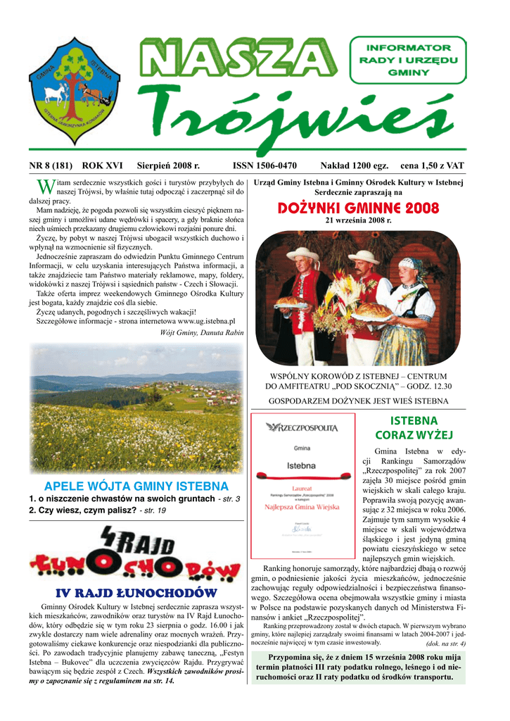 Nasza Trójwieœ 1 SIERPIEŃ 2008 NR 8 (181) ROK XVI Sierpień 2008 r. ISSN 1506-0470 W itam serdecznie wszystkich gości i turystów przybyłych do naszej Trójwsi, by właśnie tutaj odpocząć i zaczerpnąć sił do dalszej pracy. Mam nadzieję, że pogoda pozwoli się wszystkim cieszyć pięknem naszej gminy i umożliwi udane wędrówki i spacery, a gdy braknie słońca niech uśmiech przekazany drugiemu człowiekowi rozjaśni ponure dni. Życzę, by pobyt w naszej Trójwsi ubogacił wszystkich duchowo i wpłynął na wzmocnienie sił fizycznych. Jednocześnie zapraszam do odwiedzin Punktu Gminnego Centrum Informacji, w celu uzyskania interesujących Państwa informacji, a także znajdziecie tam Państwo materiały reklamowe, mapy, foldery, widokówki z naszej Trójwsi i sąsiednich państw - Czech i Słowacji. Także oferta imprez weekendowych Gminnego Ośrodka Kultury jest bogata, każdy znajdzie coś dla siebie. Życzę udanych, pogodnych i szczęśliwych wakacji! Szczegółowe informacje - strona internetowa www.ug.istebna.pl Nakład 1200 egz. cena 1,50 z VAT Urząd Gminy Istebna i Gminny Ośrodek Kultury w Istebnej Serdecznie zapraszają na Dożynki Gminne 2008 21 września 2008 r. Wójt Gminy, Danuta Rabin wspólny korowód z Istebnej – Centrum do Amfiteatru „Pod Skocznią” – godz. 12.30 Gospodarzem dożynek jest wieś Istebna Istebna coraz wyżej Gmina Istebna w edycji Rankingu Samorządów „Rzeczpospolitej” za rok 2007 zajęła 30 miejsce pośród gmin ApelE Wójta Gminy Istebna wiejskich w skali całego kraju. 1. o niszczenie chwastów na swoich gruntach - str. 3 Poprawiła swoją pozycję awansując z 32 miejsca w roku 2006. 2. Czy wiesz, czym palisz? - str. 19 Zajmuje tym samym wysokie 4 miejsce w skali województwa śląskiego i jest jedyną gminą powiatu cieszyńskiego w setce najlepszych gmin wiejskich. Ranking honoruje samorządy, które najbardziej dbają o rozwój gmin, o podniesienie jakości życia mieszkańców, jednocześnie zachowując reguły odpowiedzialności i bezpieczeństwa finansoIV Rajd ŁunochOdów wego. Szczegółowa ocena obejmowała wszystkie gminy i miasta Gminny Ośrodek Kultury w Istebnej serdecznie zaprasza wszyst- w Polsce na podstawie pozyskanych danych od Ministerstwa Fikich mieszkańców, zawodników oraz turystów na IV Rajd Łunocho- nansów i ankiet „Rzeczpospolitej”. dów, który odbędzie się w tym roku 23 sierpnia o godz. 16.00 i jak Ranking przeprowadzony został w dwóch etapach. W pierwszym wybrano zwykle dostarczy nam wiele adrenaliny oraz mocnych wrażeń. Przy- gminy, które najlepiej zarządzały swoimi finansami w latach 2004-2007 i jed(dok. na str. 4) gotowaliśmy ciekawe konkurencje oraz niespodzianki dla publiczno- nocześnie najwięcej w tym czasie inwestowały. ści. Po zawodach tradycyjnie planujemy zabawę taneczną, „Festyn Przypomina się, że z dniem 15 września 2008 roku mija Istebna – Bukovec” dla uczczenia zwycięzców Rajdu. Przygrywać termin płatności III raty podatku rolnego, leśnego i od niebawiącym się będzie zespół z Czech. Wszystkich zawodników prosiruchomości oraz II raty podatku od środków transportu. my o zapoznanie się z regulaminem na str. 14. 2 Nasza Trójwieœ Jubileusz ks. Jana Kohuta SIERPIEŃ 2008 Integracja i aktywizacja społeczno-zawodowa w Gminie Istebna Ks. Jan z brazylijskimi dziećmi Procesja Bożego Ciała po kilkusetmetrowym dywanie z kwiatów Spotkanie po latach Nasza Trójwieœ 3 SIERPIEŃ 2008 Pismo Starosty Cieszyńskiego do BOGL a KRYSL k.s. Oddział w Polsce ul. Katowicka 65 Cieszyn w sprawie drogi przez wieś Istebna Więcej na górskie drogi Dobra informacja z Katowic dla powiatu Cieszyńskiego. Zarząd Dróg Wojewódzkich przyznał półtora miliona złotych na remont górskich odcinków dróg. Jak mówi starosta cieszyński Czesław Gluza -powiat w ramach przyznanej dotacji wykona prace w okolicach przejścia granicznego w Jasnowicach na drodze 943 Jasnowice-Koniaków ZDW przymierza się także do wymiany nawierzchni na dwóch innych odcinkach. Są to Ulica Czarne w okolicach skoczni narciarskiej oraz trasa Salmopol - Malinka na długości około 3 km. jb Ten artykuł pochodzi z OX.pl W związku licznymi skargami mieszkańców Gminy Istebna, jak również nieodpowiednimi parametrami drogi powiatowej 2643 S Istebna przez wieś, wnioskujemy do Państwa o natychmiastowe zaprzestanie wykorzystywania w/w drogi do przejazdu pojazdów ciężarowych obsługujących budowę drogi ekspresowej S-69 w Lalikach. Zwiększone natężenie ruchu pojazdów ciężarowych na tej drodze stwarza zagrożenie dla mieszkańców jak również doprowadzi do szybkiej degradacji drogi. Mając na uwadze powyższe zasadnym jest, aby przedmiotowy przejazd odbywał się wyłącznie zbiórka przedmiotów drogami wojewódzkimi nr 941 i 943. wielkogabarytowych W przypadku braku zdecydowanej reakcji z Państwa strony, co Wójt Gminy informuje: w miesiącu wrześniu br. na terenie do zaniechania korzystania z drogi powiatowej, zmuszeni będziemy podjąć dalsze kroki mające na celu ochronę mieszkańców jak całej gminy organizowana będzie zbiórka przedmiotów wielkogabarytowych. Odbiór odbywać się będzie przez 2 dni w każdej wsi, również tej drogi. Z poważaniem wg poniższego harmonogramu: Wieś Jaworzynka - w dniach 09.09.2008r. (wtorek) Starosta Cieszyński Czesław Gluza i 10.09.2007r. (środa); Wieś Koniaków - w dniach 25.09.2008r. (czwartek) STAROSTA CIESZYŃSKI i 26.09.2007r. (piątek); ul. Bobrecka 29 Wieś Istebna - w dniach 29.09.2008r. (wtorek) 43-400 Cieszyn i 30.09.2008r.(środa); dot: Budowy drogi ekspresowej S-69 Bielsko-Biała - Żywiec Odpady można zwozić w godzinach od 8:00 - 17:00 - Zwardoń. Odcinek C2 Szare-Laliki Zbiórka obejmuje takie odpady jak: meble, zestawy wypoczynW odpowiedzi na pismo nr PZDP/5420//103/08 z 16.07.2008r. kowe, dywany, wykładziny, sprzęt AGD, sprzęt elektryczny i elekdotyczące przejazdu pojazdów ciężarowych drog