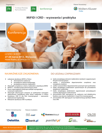 Patron honorowy: Organizator: konferencje MiFID I CRD – wyzwania i praktyka Konferencja GDZIE I KIEDY: 27-28 marca 2012 , Warszawa Hotel Rialto, ul. Wilcza 73 NAJWAŻNIEJSZE ZAGADNIENIA: wdrożenie dyrektywy MiFID w Polsce doświadczenia nadzorcze perspektywa sektora bankowego perspektywa domów maklerskich Obowiązki compliance w domu maklerskim a dyrektywa MiFID MiFID II – charakterystyka planowanych zmian Nowe rozporządzenie dotyczące polityki wynagrodzeń w domach maklerskich Obowiązki informacyjne związane ze spełnianiem wymogów adekwatności kapitałowej przez domy maklerskie w Polsce Dyrektywa CRD IV dla firm inwestycyjnych – szacowanie adekwatności kapitałowej Wdrażanie dyrektywy CRD w praktyce Patron merytoryczny: Adres do korespondencji: DO UDZIAŁU ZAPRASZAMY: kadrę zarządzającą domami maklerskimi, bankami i zagranicznymi firmami inwestycyjnymi szefów i pracowników departamentów compliance oraz zarządzania ryzykiem szefów i pracowników departamentów prawnych tych podmiotów kadrę zarządzającą podmiotami uprawnionymi do prowadzenia działalności maklerskiej kadrę zarządzającą podmiotami zagranicznymi prowadzącymi systemy depozytowo-rozliczeniowe pracowników KNF zajmujących się nadzorem nad działalnością banków oraz domów maklerskich i innych firm inwestycyjnych pracowników MF zajmujących się implementacją dyrektyw MiFID oraz CRD Patroni medialni: Centrum Szkoleniowe Sp. z o.o., ul. Świeradowska 43, 02-662 Warszawa, Wejście F, piętro VI, tel. 22 583 10 00, fax. 22 583 10 09, email: [email protected], www.frr.pl Organizator: konferencje MiFID I CRD – wyzwania i praktyka Konferencja Warszawa, 27-28.03.2012 r. Szanowni Państwo, Centrum Szkoleniowe Sp. z o. o. przy Fundacji Rozwoju Rachunkowości w Polsce organizuje konferencję „MiFID i CRD – wyzwania i praktyka”. Konferencja odbędzie się w dniach 27-28 marca 2012 r. w Warszawie w hotelu RIALTO ***** ul. Wilcza 73. Celem konferencji jest: podsumowanie statusu dotychczasowej implementacji MiFID, przedstawienie rozwiązań systemowych dla obowiązków narzuconych przez MiFID, analiza i interpretacja propozycji legislacyjnych z zakresu MiFID II oraz wskazanie sposobu transpozycji w Polskiej jurysdykcji tzw. pakietu CRD, w tym w zakresie polityki wynagrodzeń w domach maklerskich oraz szacowania adekwatności kapitałowej. Najnowsze wprowadzone zmiany legislacyjne będą omówione z punktu widzenia: praktyki nadzorczej sektora bankowego domów maklerskich W trakcie konferencji będziecie mieli Państwo możliwość: wymiany doświadczeń związanych z implementacją nowych przepisów i obowiązującego dotychczas prawa zdobycia wiedzy z zakresu MiFID, MiFID II oraz tzw. pakietu CRD IV rozwiązania problemów związanych z kluczowymi zagadnieniami dotyczącymi MiFID, MiFID II i CRD kierowania pytań do ekspertów zawodowo zajmujących się tematyką MiFID, oraz CRD Serdecznie zapraszam do uczestnictwa w konferencji wierząc, iż informacje przekazane przez ekspertów i możliwość wymiany doświadczeń przyczynią się do efektywnego wykorzystania zdobytej wiedzy w praktyce. Z poważaniem, Emilia Nurzyńska Menedżer Projektu [email protected] Adres do korespondencji: Centrum Szkoleniowe Sp. z o.o., ul. Świeradowska 43, 02-662 Warszawa, Wejście F, piętro VI, tel. 22 583 10 00, fax. 22 583 10 09, email: [email protected], www.frr.pl Organizator: konferencje MiFID I CRD – wyzwania i praktyka Program Warszawa, 27-28.03.2012 r. I Dzień, wtorek 27 marca Wyzwania firm inwestycyjnych oraz banków wobec przepisów dyrektywy MiFID 09.00-09.30 Rejestracja, powitalna kawa 09.30- 09.45 Otwarcie konferencji – przedstawienie programu I i II Dnia Konferencję poprowadzi: Beata Kaftańska, SSW Spaczyński, Szczepaniak i Wspólnicy 09.45-10.45 Wdrożenie dyrektyw MiFID w Polsce – doświadczenia nadzorcze Przyszłość systemu MiFID – charakterystyka planowanych zmian Maciej Kurzajewski, Zastępca Dyrektora w Departamencie Firm Inwestycyjnych i Infrastruktury Rynku Kapitałowego, Urząd Komisji Nadzoru Finansowego 10.45-11.45 Obowiązki compliance w domu maklerskim a dyrektywa MiFID Beata Kaftańska, radca prawny, of counsel, SSW Spaczyński, Szczepaniak i Wspólnicy Czym jest ryzyko braku zgodności? Obowiązki oraz zasady funkcjonowania jednostki ds. zgodności Implementacja rekomendacji ws. compliance a MiFID i prawo polskie Compliance okiem praktyka 11.45-12.00 Przerwa kawowa 12.00-13.00 Wdrażanie dyrektywy MiFID z perspektywy domów maklerskich – teoria a praktyka Prelegent: zaproszony przedstawiciel domu maklerskiego*Czekamy na potwierdzenie 13.00-14.00 Lunch 14.00-15.30 Dyskusja panelowa: Doświadczenia we wdrażaniu dyrektywy MiFID w działalności banków Andrzej Dzięgielewski, Kierujący Zespołem Monitorowania Zgodności w Departamencie Zapewnienia Zgodności,Bank Millenium S.A., Piotr Lewiak, Ekspert, Departament Rynków Finansowych, Biuro Rozwoju Instrumentów Finansowych, Bank Pekao S.A., Grzegorz Włodarczyk, Pracownik Wydziału Rynków Finansowych w Departamencie Compliance, Kredyt Bank S.A. Beata Kaftańska, radca prawny, of counsel, SSW Spaczyński, Szczepaniak i Wspólnicy) 15.30-16.30 Projekt dyrektywy MiFID II – najważniejsze założenia i kontrowersje Anna Grau, SSW Spaczyński, Szczepaniak i Wspólnicy Szymon Syp, SSW Spaczyński, Szczepaniak i Wspólnicy MIFID II – dlaczego, jak i kiedy? Kierunek zmian proponowanych w MIFID II Możliwe skutki MIFID II dla rynku 16.30 Zakończenie pierwszego dnia konferencji Adres do korespondencji: Centrum Szkoleniowe Sp. z o.o., ul. Świeradowska 43, 02-662 Warszawa, Wejście F, piętro VI, tel. 22 583 10 00, fax. 22 583 10 09, email: [email protected], www.frr.pl Organizator: konferencje MiFID I CRD – wyzwania i praktyka Program Warszawa, 27-28.03.2012 r. II Dzień, środa 28 marca Wyzwania firm inwestycyjnych wobec przepisów dyrektywy CRD 09.00-09.30 Rejestracja, powitalna kawa 09.30-11.00 Nowe rozporządzeni