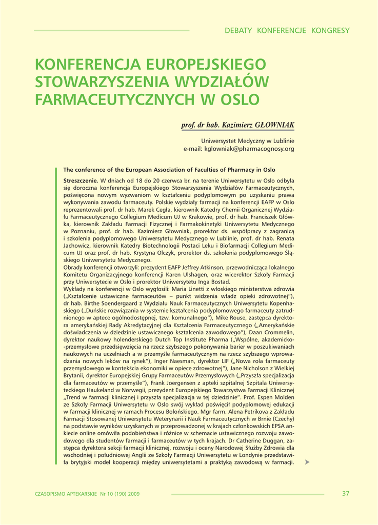 DEBATY KONFERENCJE KONGRESY KONFERENCJA EUROPEJSKIEGO STOWARZYSZENIA WYDZIA£ÓW FARMACEUTYCZNYCH W OSLO prof. dr hab. Kazimierz G£OWNIAK Uniwersystet Medyczny w Lublinie e-mail: [email protected] The conference of the European Association of Faculties of Pharmacy in Oslo Streszczenie. W dniach od 18 do 20 czerwca br. na terenie Uniwersytetu w Oslo odby³a siê doroczna konferencja Europejskiego Stowarzyszenia Wydzia³ów Farmaceutycznych, poœwiêcona nowym wyzwaniom w kszta³ceniu podyplomowym po uzyskaniu prawa wykonywania zawodu farmaceuty. Polskie wydzia³y farmacji na konferencji EAFP w Oslo reprezentowali prof. dr hab. Marek Ceg³a, kierownik Katedry Chemii Organicznej Wydzia³u Farmaceutycznego Collegium Medicum UJ w Krakowie, prof. dr hab. Franciszek G³ówka, kierownik Zak³adu Farmacji Fizycznej i Farmakokinetyki Uniwersytetu Medycznego w Poznaniu, prof. dr hab. Kazimierz G³owniak, prorektor ds. wspó³pracy z zagranic¹ i szkolenia podyplomowego Uniwersytetu Medycznego w Lublinie, prof. dr hab. Renata Jachowicz, kierownik Katedry Biotechnologii Postaci Leku i Biofarmacji Collegium Medicum UJ oraz prof. dr hab. Krystyna Olczyk, prorektor ds. szkolenia podyplomowego Œl¹skiego Uniwersytetu Medycznego. Obrady konferencji otworzyli: prezydent EAFP Jeffrey Atkinson, przewodnicz¹ca lokalnego Komitetu Organizacyjnego konferencji Karen Ulshagen, oraz wicerektor Szko³y Farmacji przy Uniwersytecie w Oslo i prorektor Uniwersytetu Inga Bostad. Wyk³ady na konferencji w Oslo wyg³osili: Maria Linetti z w³oskiego ministerstwa zdrowia („Kszta³cenie ustawiczne farmaceutów – punkt widzenia w³adz opieki zdrowotnej”), dr hab. Birthe Soendergaard z Wydzia³u Nauk Farmaceutycznych Uniwersytetu Kopenhaskiego („Duñskie rozwi¹zania w systemie kszta³cenia podyplomowego farmaceuty zatrudnionego w aptece ogólnodostêpnej, tzw. komunalnego”), Mike Rouse, zastêpca dyrektora amerykañskiej Rady Akredytacyjnej dla Kszta³cenia Farmaceutycznego („Amerykañskie doœwiadczenia w dziedzinie ustawicznego kszta³cenia zawodowego”), Daan Crommelin, dyrektor naukowy holenderskiego Dutch Top Institute Pharma („Wspólne, akademicko-przemys³owe przedsiêwziêcia na rzecz szybszego pokonywania barier w poszukiwaniach naukowych na uczelniach a w przemyœle farmaceutycznym na rzecz szybszego wprowadzania nowych leków na rynek”), Inger Naesman, dyrektor LIF („Nowa rola farmaceuty przemys³owego w kontekœcia ekonomiki w opiece zdrowotnej”), Jane Nicholson z Wielkiej Brytanii, dyrektor Europejskiej Grupy Farmaceutów Przemys³owych („Przysz³a specjalizacja dla farmaceutów w przemyœle”), Frank Joergensen z apteki szpitalnej Szpitala Uniwersyteckiego Haukeland w Norwegii, prezydent Europejskiego Towarzystwa Farmacji Klinicznej „Trend w farmacji klinicznej i przysz³a specjalizacja w tej dziedzinie”. Prof. Espen Molden ze Szko³y Farmacji Uniwersytetu w Oslo swój wyk³ad poœwiêci³ podyplomowej edukacji w farmacji klinicznej w ramach Procesu Boloñskiego. Mgr farm. Alena Petrikova z Zak³adu Farmacji Stosowanej Uniwersytetu Weterynarii i Nauk Farmaceutycznych w Brnie (Czechy) na podstawie wyników uzyskanych w przeprowadzonej w krajach cz³onkowskich EPSA ankiecie online omówi³a podobieñstwa i ró¿nice w schemacie ustawicznego rozwoju zawodowego dla studentów farmacji i farmaceutów w tych krajach. Dr Catherine Duggan, zastêpca dyrektora sekcji farmacji klinicznej, rozwoju i oceny Narodowej S³u¿by Zdrowia dla wschodniej i po³udniowej Anglii ze Szko³y Farmacji Uniwersytetu w Londynie przedstawi³a brytyjski model kooperacji miêdzy uniwersytetami a praktyk¹ zawodow¹ w farmacji. CZASOPISMO APTEKARSKIE Nr 10 (190) 2009 ➤ 37 DEBATY KONFERENCJE KONGRESY ➤ Jurate Svarcaite, student ze Szko³y Farmacji Uniwersytetu w Londynie (Londyñskie Centrum Rozwoju Miêdzynarodowego), mówi³ o wzrastaj¹cej roli kszta³cenia przez internet, a Ian Bates ze Szko³y Farmacji Uniwersytetu w Londynie skoncentrowa³ siê na globalnych zagadnieniach w edukacji praktyków. Sesjom wyk³adowym towarzyszy³y panele dyskusyjne na ró¿ne tematy zwi¹zane z kszta³ceniem ustawicznym. Ogromne zainteresowanie uczestników konferencji wzbudzi³y te¿ liczne prezentacje posterowe, wœród których nie zabrak³o prac przygotowanych przez Polaków: prof. dr. hab. Franciszka G³ówki z poznañskiego UM, prof. dr. hab. Kazimierza G³owniaka z lubelskiego UM (dwa postery) oraz Katarzyny Komosiñskiej-Vassev, Paw³a Olczyka i prof. dr hab. Krystyny Olczyk z Wydzia³u Farmaceutycznego ŒUM. Owocem konferencji EAFP w Oslo jest wspólne stanowisko w sprawie przygotowania farmaceuty do zapewniania opieki farmaceutycznej, zatytu³owane: „Przygotowuj¹c farmaceutê dla przysz³oœci w zapewnianiu opieki farmaceutycznej”. Wœród zaproszonych goœci obecny by³ Wiktor Szukiel, wydawca i redaktor naczelny „Czasopisma Aptekarskiego”, które jest zaliczane do liderów we wzajemnej wspó³pracy z wydzia³ami farmaceutycznymi uniwersytetów medycznych w Polsce. S³owa kluczowe: do¿ywotnie uczenie siê, farmacja kliniczna, farmacja przemys³owa, magister ds. leków, opieka farmaceutyczna, ustawiczny rozwój zawodowy. Summary. From the 18-20th of June this year, on the grounds of Oslo University, the annual conference of the European Association of Faculties of Pharmacy took place, and it was dedicated to new challenges in postgraduate/post-registration pharmacy education. Polish pharmacy faculties were represented there by: Professor Marek Ceg³a from the Department of Organic Chemistry of the Faculty of Pharmacy at Jagiellonian University in Cracow, Professor Franciszek G³ówka from the Department of Physical Pharmacology and Pharmacokinetics at Poznan University of Medical Sciences, Professor Kazimierz G³owniak, Vice Rector at Medical University in Lublin, Professor Renata Jachowicz from the Department of Pharmaceutical Technology and Biopharmacy at Collegium Medicum of Jagiellonian University and