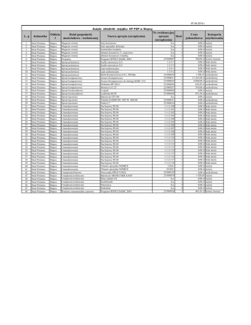 07.04.2015 r Zużyte składniki majątku KP PSP w Słupcy L. p 1 2 3 4 5 6 7 8 9 10 11 12 13 14 15 16 17 18 19 20 21 22 23 24 25 26 27 28 29 30 31 32 33 34 35 36 37 38 39 40 41 42 43 44 45 46 47 48 Jednostka Straż Pożarna Straż Pożarna Straż Pożarna Straż Pożarna Straż Pożarna Straż Pożarna Straż Pożarna Straż Pożarna Straż Pożarna Straż Pożarna Straż Pożarna Straż Pożarna Straż Pożarna Straż Pożarna Straż Pożarna Straż Pożarna Straż Pożarna Straż Pożarna Straż Pożarna Straż Pożarna Straż Pożarna Straż Pożarna Straż Pożarna Straż Pożarna Straż Pożarna Straż Pożarna Straż Pożarna Straż Pożarna Straż Pożarna Straż Pożarna Straż Pożarna Straż Pożarna Straż Pożarna Straż Pożarna Straż Pożarna Straż Pożarna Straż Pożarna Straż Pożarna Straż Pożarna Straż Pożarna Straż Pożarna Straż Pożarna Straż Pożarna Straż Pożarna Straż Pożarna Straż Pożarna Straż Pożarna Straż Pożarna Oddzia Dział gospodarki ł materiałowo - technicznej Słupca Słupca Słupca Słupca Słupca Słupca Słupca Słupca Słupca Słupca Słupca Słupca Słupca Słupca Słupca Słupca Słupca Słupca Słupca Słupca Słupca Słupca Słupca Słupca Słupca Słupca Słupca Słupca Słupca Słupca Słupca Słupca Słupca Słupca Słupca Słupca Słupca Słupca Słupca Słupca Słupca Słupca Słupca Słupca Słupca Słupca Słupca Słupca Magazyn zwroty Magazyn zwroty Magazyn zwroty Magazyn zwroty Magazyn zwroty Programy Sprząt pożarniczy Sprząt pożarniczy Sprząt pożarniczy Sprząt pożarniczy Sprząt pożarniczy Sprzęt komputerowy Sprzęt komputerowy Sprzęt komputerowy Sprzęt komputerowy Sprzęt kwaterunkowy Sprzęt kwaterunkowy Sprzęt łączności Sprzęt łączności Sprzęt łączności Umundurowanie Umundurowanie Umundurowanie Umundurowanie Umundurowanie Umundurowanie Umundurowanie Umundurowanie Umundurowanie Umundurowanie Umundurowanie Umundurowanie Umundurowanie Umundurowanie Umundurowanie Umundurowanie Umundurowanie Umundurowanie Umundurowanie Umundurowanie Umundurowanie Urządzenia biurowe Urządzenia techniczne Urządzenia techniczne Urządzenia techniczne Urządzenia techniczne Urządzenia techniczne Wartości niematerialne i prawne Nazwa sprzętu (urządzenia) buty koszarowe buty specjalne skórzane kominiarka niepalna ubranie koszarowe 2- częsciowe ubranie koszarowe z kurtką Program OFFICE BASIC 2003 Szelki ratownicze S-5 Szelki ratownicze S-5 Ląża asekuracyjna Ląża asekuracyjna Butla Kompozytowa 6,9 L 300 Bar Zestaw Komputerowy Zestaw Komputerowy do obsługi KSRC 316 Drukarka HP 920 C Monitor LG 22'' Czajnik Lodówka 60/50 Bateria do GP-360 Telefon SAMSUNG B2710 SOLID Nokia C7 Pas bojowy PS 88 Pas bojowy PS 88 Pas bojowy PS 88 Pas bojowy PS 88 Pas bojowy PS 88 Pas bojowy PS 88 Pas bojowy PS 88 Pas bojowy PS 88 Pas bojowy PS 88 Pas bojowy PS 88 Pas bojowy PS 88 Pas bojowy PS 88 Pas bojowy PS 88 Pas bojowy PS 88 Pas bojowy PS 88 Pas bojowy PS 88 Pas bojowy PS 88 Pas bojowy PS 88 Pas bojowy PS 88 Ubranie specjalne NOMEX Ubranie specjalne NOMEX Niszczarka OPUS V505C Bateria do MEDUCORE EASY Klucz płaski 6/6 Kombinerki Nitownica Śrubokręt Program OFFICE BASIC 2003 Nr ewidencyjny sprzętu Ilość (urządzenia) b.n. b.n. b.n. b.n. b.n. 23/000867 1-2-5-1 1-2-5-2 1-2-6-1 1-2-6-2 23/000670 23/000011 23/000014 23/000036 23/000557 23/000903 23/000430 b.n. 23/000611 23/000614 1-1-2-100 1-1-2-101 1-1-2-102 1-1-2-103 1-1-2-104 1-1-2-105 1-1-2-106 1-1-2-107 1-1-2-108 1-1-2-109 1-1-2-110 1-1-2-111 1-1-2-112 1-1-2-113 1-1-2-114 1-1-2-115 1-1-2-116 1-1-2-117 1-1-2-118 3/2011 19/2011 23/000129 23/000870 b.n. b.n. b.n. b.n. 23/000856 3 5 2 5 2 1 1 1 1 1 1 1 1 1 1 1 1 3 1 1 1 1 1 1 1 1 1 1 1 1 1 1 1 1 1 1 1 1 1 1 1 1 1 2 1 2 4 1 Cena jednostkowa 0,00 zł 0,00 zł 0,00 zł 0,00 zł 0,00 zł 780,00 zł 0,00 zł 0,00 zł 0,00 zł 0,00 zł 1 580,55 11 263,00 zł 8 000,00 zł 636,89 zł 559,00 zł 0,00 zł 872,30 zł 0,00 zł 0,00 zł 0,00 zł 0,00 zł 0,00 zł 0,00 zł 0,00 zł 0,00 zł 0,00 zł 0,00 zł 0,00 zł 0,00 zł 0,00 zł 0,00 zł 0,00 zł 0,00 zł 0,00 zł 0,00 zł 0,00 zł 0,00 zł 0,00 zł 0,00 zł 0,00 zł 0,00 zł 0,00 zł 1 420,65 0,00 zł 0,00 zł 0,00 zł 0,00 zł 465,45 zł Kategoria użytkowania zużyte zużyte zuzyte zuzyte zużyte koniec licencji brak atestu brak atestu brak atestu brak atestu uszkodzona uszkodzony uszkodzony uszkodzona uszkodzony zużyty uszkodzona zużyte uszkodzony uszkodzona brak atestu brak atestu brak atestu brak atestu brak atestu brak atestu brak atestu brak atestu brak atestu brak atestu brak atestu brak atestu brak atestu brak atestu brak atestu brak atestu brak atestu brak atestu brak atestu zużyty zużyty uszkodzona zużyta zużyte zużyte zużyte zużyte koniec licencji