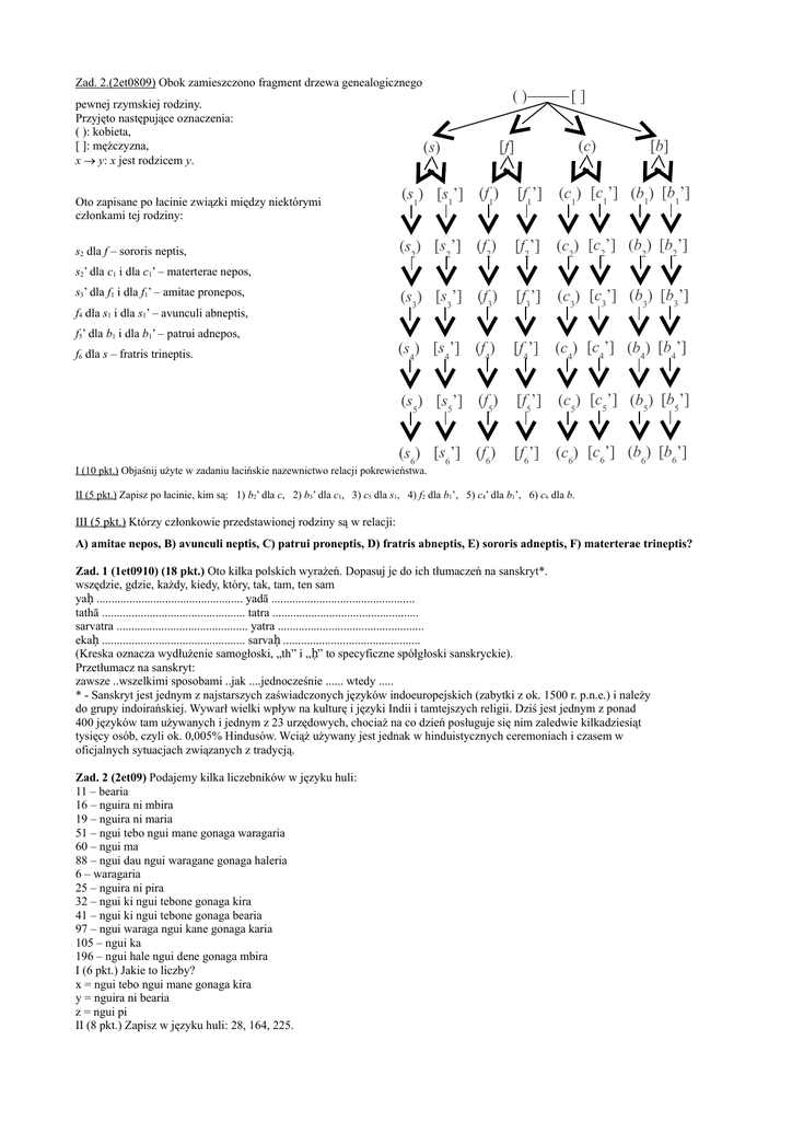Zad. 2.(2et0809) Obok zamieszczono fragment drzewa genealogicznego pewnej rzymskiej rodziny. Przyjęto następujące oznaczenia: ( ): kobieta, [ ]: mężczyzna, x → y: x jest rodzicem y. Oto zapisane po łacinie związki między niektórymi członkami tej rodziny: s2 dla f – sororis neptis, () (s) [] (c) [f] [b] (s1) [s1’] (f1) [f1’] (c1) [c1’] (b1) [b1’] (s2) [s2’] (f2) [f2’] (c2) [c2’] (b2) [b2’] (s3) [s3’] (f3) [f3’] (c3) [c3’] (b3) [b3’] (s4) [s4’] (f4) [f4’] (c4) [c4’] (b4) [b4’] (s5) [s5’] (f5) [f5’] (c5) [c5’] (b5) [b5’] (s6) [s6’] (f6) [f6’] (c6) [c6’] (b6) [b6’] s2’ dla c1 i dla c1’ – materterae nepos, s3’ dla f1 i dla f1’ – amitae pronepos, f4 dla s1 i dla s1’ – avunculi abneptis, f5’ dla b1 i dla b1’ – patrui adnepos, f6 dla s – fratris trineptis. I (10 pkt.) Objaśnij użyte w zadaniu łacińskie nazewnictwo relacji pokrewieństwa. II (5 pkt.) Zapisz po łacinie, kim są: 1) b2’ dla c, 2) b3’ dla c1, 3) c5 dla s1, 4) f2 dla b1’, 5) c4’ dla b1’, 6) c6 dla b. III (5 pkt.) Którzy członkowie przedstawionej rodziny są w relacji: A) amitae nepos, B) avunculi neptis, C) patrui proneptis, D) fratris abneptis, E) sororis adneptis, F) materterae trineptis? Zad. 1 (1et0910) (18 pkt.) Oto kilka polskich wyrażeń. Dopasuj je do ich tłumaczeń na sanskryt*. wszędzie, gdzie, każdy, kiedy, który, tak, tam, ten sam yaḥ ................................................. yadā ................................................ tathā ................................................ tatra ................................................. sarvatra ............................................ yatra ................................................. ekaḥ ................................................ sarvaḥ .............................................. (Kreska oznacza wydłużenie samogłoski, „th” i „ḥ” to specyficzne spółgłoski sanskryckie). Przetłumacz na sanskryt: zawsze ..wszelkimi sposobami ..jak ....jednocześnie ...... wtedy ..... * - Sanskryt jest jednym z najstarszych zaświadczonych języków indoeuropejskich (zabytki z ok. 1500 r. p.n.e.) i należy do grupy indoirańskiej. Wywarł wielki wpływ na kulturę i języki Indii i tamtejszych religii. Dziś jest jednym z ponad 400 języków tam używanych i jednym z 23 urzędowych, chociaż na co dzień posługuje się nim zaledwie kilkadziesiąt tysięcy osób, czyli ok. 0,005% Hindusów. Wciąż używany jest jednak w hinduistycznych ceremoniach i czasem w oficjalnych sytuacjach związanych z tradycją. Zad. 2 (2et09) Podajemy kilka liczebników w języku huli: 11 – bearia 16 – nguira ni mbira 19 – nguira ni maria 51 – ngui tebo ngui mane gonaga waragaria 60 – ngui ma 88 – ngui dau ngui waragane gonaga haleria 6 – waragaria 25 – nguira ni pira 32 – ngui ki ngui tebone gonaga kira 41 – ngui ki ngui tebone gonaga bearia 97 – ngui waraga ngui kane gonaga karia 105 – ngui ka 196 – ngui hale ngui dene gonaga mbira I (6 pkt.) Jakie to liczby? x = ngui tebo ngui mane gonaga kira y = nguira ni bearia z = ngui pi II (8 pkt.) Zapisz w języku huli: 28, 164, 225. III (6 pkt.) Opisz strukturę liczebnika ngui hale ngui dene gonaga mbira (196) – wskaż wszystkie elementy go budujące i przedstaw ich funkcję lub znaczenie. Języka huli używa ok. 70 000 osób w Papui-Nowej Gwinei. Jego dokładna przynależność językowa nie jest znana, ale nie należy do języków australijskich ani austronezyjskich. Zad. 1 (2et08) Oto kilka zdań japońskich* wraz z tłumaczeniami. 1. Atarashikute yasui kutsu ga hoshii desu. 2. Gakusei wa muzukashii uta wo utaitagatte imasu. 3. Omoshirokute atarashii hon ga yomitai desu. 4. Oishii kōhii ga nomitai desu. 5. Kuruma ga hoshii desu. 6. Atarashii jisho wo kaimasu. Chcę nowe, tanie buty. Student chce śpiewać trudną piosenkę. Chcę czytać interesującą, nową książkę. Chcę pić smaczną kawę. Chcę samochód. Kupię nowy słownik. 7. Utsukushikute wakai onna wa omoshiroi hon wo yomimasu. Piękna, młoda kobieta przeczyta interesującą książkę. 8. Yasashii gakusei wa oishikute atsui ocha wo hoshigatte imasu. Miły student chce smaczną, ciepłą herbatę. 9. Onna wa kutsu wo kaitagatte imasu. Kobieta chce kupić buty. 10. Yasashikute wakai seito wa takakute ōkii jisho wo hoshigatte imasu. Miły, młody uczeń chce drogi, duży słownik. Zad. A. Przetłumacz na polski: 1. Seito wa utaimasu. 2. Muzukashikute takai hon ga kaitai desu. 3. Yasashii onna wa yasukute omoshiroi jisho wo yomitagatte imasu. Zad. B. Przetłumacz na japoński: 1. Chcę dużą książkę. 2. Uczeń chce nową, interesującą piosenkę. 3. Piękna kobieta chce pić ciepłą, smaczną herbatę. * - Japoński jest językiem o nieznanym pochodzeniu, niespokrewnionym z chińskim, być może spokrewnionym z koreańskim. W użyciu są dwa sylabiczne alfabety japońskie, ideograficzny alfabet chiński oraz dwie wersje transkrypcji łacińskiej. W naszych zadaniach stosowana jest tzw. transkrypcja Hepburna, dość dobrze oddająca wymowę dla czytelnika anglojęzycznego, tj.: „sh” oznacza miękką głoskę podobną do polskiego ś, „ts” to polskie c, „z” − dz, „j” – dź, „i” i „y” po samogłosce wymawiane są jak polskie j; kreską powyżej litery oznacza się długość samogłoski. Zad. 2 (1et08). Oto kilka zdań po wietnamsku* i ich tłumaczeń w nieznanej kolejności. 1. Cái này là cái hoa. A. Ta waza jest ładna. 2. Mình mua ba cái hoa. B. Niosę pięć talerzy. 3. Bác bán cái đĩap kia. C. Kupuję trzy kwiatki. 4. Cái bình này đẹp. D. To jest kwiatek. 5. Cái này là cái bình đẹp.9 E. Wuj sprzedaje ten talerz. 6. Mình đem năm cái đĩap. F. To jest ładna waza. a) (6 pkt.) Przyporządkuj tłumaczenia: 1 - .........., 2 - .........., 3 - .........., 4 - .........., 5 - .........., 6 - ........... b) (3×3 pkt.) Przetłumacz: To jest ładny kwiatek. 
