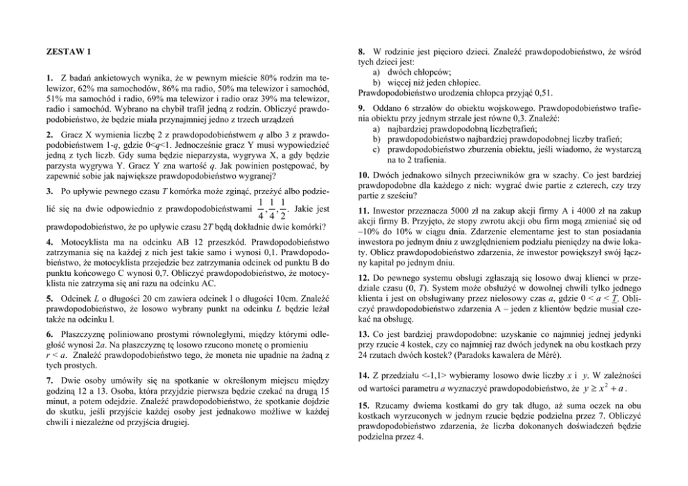 ZESTAW 1 1. Z badań ankietowych wynika, że w pewnym mieście 80% rodzin ma telewizor, 62% ma samochodów, 86% ma radio, 50% ma telewizor i samochód, 51% ma samochód i radio, 69% ma telewizor i radio oraz 39% ma telewizor, radio i samochód. Wybrano na chybił trafił jedną z rodzin. Obliczyć prawdopodobieństwo, że będzie miała przynajmniej jedno z trzech urządzeń 2. Gracz X wymienia liczbę 2 z prawdopodobieństwem q albo 3 z prawdopodobieństwem 1-q, gdzie 0<q<1. Jednocześnie gracz Y musi wypowiedzieć jedną z tych liczb. Gdy suma będzie nieparzysta, wygrywa X, a gdy będzie parzysta wygrywa Y. Gracz Y zna wartość q. Jak powinien postępować, by zapewnić sobie jak największe prawdopodobieństwo wygranej? 3. Po upływie pewnego czasu T komórka może zginąć, przeżyć albo podzielić się na dwie odpowiednio z prawdopodobieństwami 1 1 1 , , . Jakie jest 4 4 2 prawdopodobieństwo, że po upływie czasu 2T będą dokładnie dwie komórki? 4. Motocyklista ma na odcinku AB 12 przeszkód. Prawdopodobieństwo zatrzymania się na każdej z nich jest takie samo i wynosi 0,1. Prawdopodobieństwo, że motocyklista przejedzie bez zatrzymania odcinek od punktu B do punktu końcowego C wynosi 0,7. Obliczyć prawdopodobieństwo, że motocyklista nie zatrzyma się ani razu na odcinku AC. 5. Odcinek L o długości 20 cm zawiera odcinek l o długości 10cm. Znaleźć prawdopodobieństwo, że losowo wybrany punkt na odcinku L będzie leżał także na odcinku l. 6. Płaszczyznę poliniowano prostymi równoległymi, między którymi odległość wynosi 2a. Na płaszczyznę tę losowo rzucono monetę o promieniu r < a. Znaleźć prawdopodobieństwo tego, że moneta nie upadnie na żadną z tych prostych. 7. Dwie osoby umówiły się na spotkanie w określonym miejscu między godziną 12 a 13. Osoba, która przyjdzie pierwsza będzie czekać na drugą 15 minut, a potem odejdzie. Znaleźć prawdopodobieństwo, że spotkanie dojdzie do skutku, jeśli przyjście każdej osoby jest jednakowo możliwe w każdej chwili i niezależne od przyjścia drugiej. 8. W rodzinie jest pięcioro dzieci. Znaleźć prawdopodobieństwo, że wśród tych dzieci jest: a) dwóch chłopców; b) więcej niż jeden chłopiec. Prawdopodobieństwo urodzenia chłopca przyjąć 0,51. 9. Oddano 6 strzałów do obiektu wojskowego. Prawdopodobieństwo trafienia obiektu przy jednym strzale jest równe 0,3. Znaleźć: a) najbardziej prawdopodobną liczbętrafień; b) prawdopodobieństwo najbardziej prawdopodobnej liczby trafień; c) prawdopodobieństwo zburzenia obiektu, jeśli wiadomo, że wystarczą na to 2 trafienia. 10. Dwóch jednakowo silnych przeciwników gra w szachy. Co jest bardziej prawdopodobne dla każdego z nich: wygrać dwie partie z czterech, czy trzy partie z sześciu? 11. Inwestor przeznacza 5000 zł na zakup akcji firmy A i 4000 zł na zakup akcji firmy B. Przyjęto, że stopy zwrotu akcji obu firm mogą zmieniać się od –10% do 10% w ciągu dnia. Zdarzenie elementarne jest to stan posiadania inwestora po jednym dniu z uwzględnieniem podziału pieniędzy na dwie lokaty. Oblicz prawdopodobieństwo zdarzenia, że inwestor powiększył swój łączny kapitał po jednym dniu. 12. Do pewnego systemu obsługi zgłaszają się losowo dwaj klienci w przedziale czasu (0, T). System może obsłużyć w dowolnej chwili tylko jednego klienta i jest on obsługiwany przez nielosowy czas a, gdzie 0 < a < T. Obliczyć prawdopodobieństwo zdarzenia A – jeden z klientów będzie musiał czekać na obsługę. 13. Co jest bardziej prawdopodobne: uzyskanie co najmniej jednej jedynki przy rzucie 4 kostek, czy co najmniej raz dwóch jedynek na obu kostkach przy 24 rzutach dwóch kostek? (Paradoks kawalera de Méré). 14. Z przedziału <-1,1> wybieramy losowo dwie liczby x i y. W zależności od wartości parametru a wyznaczyć prawdopodobieństwo, że y ≥ x 2 + a . 15. Rzucamy dwiema kostkami do gry tak długo, aż suma oczek na obu kostkach wyrzuconych w jednym rzucie będzie podzielna przez 7. Obliczyć prawdopodobieństwo zdarzenia, że liczba dokonanych doświadczeń będzie podzielna przez 4.