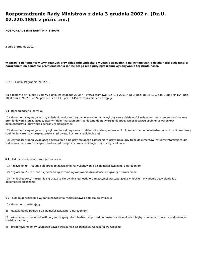 Rozporządzenie Rady Ministrów z dnia 3 grudnia 2002 r. (Dz.U. 02.220.1851 z późn. zm.) ROZPORZĄDZENIE RADY MINISTRÓW z dnia 3 grudnia 2002 r. w sprawie dokumentów wymaganych przy składaniu wniosku o wydanie zezwolenia na wykonywanie działalności związanej z narażeniem na działanie promieniowania jonizującego albo przy zgłoszeniu wykonywania tej działalności. (Dz. U. z dnia 19 grudnia 2002 r.) Na podstawie art. 6 pkt 2 ustawy z dnia 29 listopada 2000 r. - Prawo atomowe (Dz. U. z 2001 r. Nr 3, poz. 18, Nr 100, poz. 1085 i Nr 154, poz. 1800 oraz z 2002 r. Nr 74, poz. 676 i Nr 135, poz. 1145) zarządza się, co następuje: § 1. Rozporządzenie określa: 1) dokumenty wymagane przy składaniu wniosku o wydanie zezwolenia na wykonywanie działalności związanej z narażeniem na działanie promieniowania jonizującego, zwanym dalej "narażeniem", konieczne do potwierdzenia przez wnioskodawcę spełnienia warunków bezpieczeństwa jądrowego i ochrony radiologicznej; 2) dokumenty wymagane przy zgłoszeniu wykonywania działalności, o której mowa w pkt 1, konieczne do potwierdzenia przez wnioskodawcę spełnienia warunków bezpieczeństwa jądrowego i ochrony radiologicznej; 3) czynności organu wydającego zezwolenie albo przyjmującego zgłoszenie w przypadku, gdy treść dokumentów jest niewystarczająca dla wykazania, że warunki bezpieczeństwa jądrowego i ochrony radiologicznej zostały spełnione. § 2. Ilekroć w rozporządzeniu jest mowa o: 1) "zezwoleniu" - rozumie się przez to zezwolenie na wykonywanie działalności związanej z narażeniem; 2) "zgłoszeniu" - rozumie się przez to zgłoszenie wykonywania działalności związanej z narażeniem; 3) "wnioskodawcy" - rozumie się przez to kierownika jednostki organizacyjnej występującej z wnioskiem o wydanie zezwolenia lub dokonującej zgłoszenia. § 3. Składając wniosek o wydanie zezwolenia, wnioskodawca dołącza do wniosku: 1) dokument zawierający: a) uzasadnienie podjęcia działalności związanej z narażeniem, b) określenie komórki jednostki organizacyjnej, która będzie bezpośrednio prowadzić działalność objętą zezwoleniem, wraz z podaniem jej siedziby i adresu, c) proponowane limity użytkowe dawek związane z działalnością wskazaną we wniosku, d) przewidywany termin rozpoczęcia i okres prowadzenia działalności wskazanej we wniosku; 2) dokument zawierający zobowiązanie wnioskodawcy do poinformowania organu wydającego zezwolenie o przewidywanym przekształceniu lub likwidacji jednostki organizacyjnej albo jej komórki bezpośrednio prowadzącej działalność objętą zezwoleniem i uzgodnienia sposobu postępowania z posiadanymi źródłami promieniowania jonizującego, materiałami jądrowymi lub odpadami promieniotwórczymi oraz przeprowadzenia na własny koszt kontroli dozymetrycznej i ewentualnej dezaktywacji miejsca pracy i jego otoczenia po zakończeniu działalności określonej w zezwoleniu; 3) dokumenty określone w załączniku nr 1 do rozporządzenia - jeżeli wniosek dotyczy wykonywania działalności związanej z narażeniem, z wyłączeniem działalności obejmującej obiekty jądrowe, przechowalniki wypalonego paliwa jądrowego, składowiska odpadów promieniotwórczych i składowiska wypalonego paliwa jądrowego; 4) dokumenty określone w załączniku nr 2 do rozporządzenia - jeżeli wniosek dotyczy wykonywania działalności związanej z narażeniem obejmującej obiekty jądrowe, przechowalniki wypalonego paliwa jądrowego, składowiska odpadów promieniotwórczych lub składowiska wypalonego paliwa jądrowego. § 4. Dokonując zgłoszenia, wnioskodawca przedstawia: 1) dokument zawierający: a) uzasadnienie podjęcia działalności związanej z narażeniem, b) określenie rodzaju i zakresu planowanej działalności związanej z narażeniem, z podaniem maksymalnej aktywności lub stężenia izotopów promieniotwórczych będących przedmiotem działalności objętej zgłoszeniem, c) określenie komórki jednostki organizacyjnej, która będzie bezpośrednio prowadzić działalność objętą zgłoszeniem, wraz z podaniem jej siedziby i adresu, d) przewidywany termin rozpoczęcia i okres prowadzenia działalności objętej zgłoszeniem; 2) dokument zawierający zobowiązanie do poinformowania Prezesa Państwowej Agencji Atomistyki o przewidywanym przekształceniu lub likwidacji jednostki organizacyjnej albo jej komórki bezpośrednio prowadzącej działalność objętą zgłoszeniem i uzgodnienia sposobu postępowania z posiadanymi źródłami promieniowania jonizującego, materiałami jądrowymi lub odpadami promieniotwórczymi oraz przeprowadzenia na własny koszt kontroli dozymetrycznej i ewentualnej dezaktywacji miejsca pracy i jego otoczenia po zakończeniu działalności określonej w zgłoszeniu. § 5. Jeżeli treść przedstawionych przez wnioskodawcę dokumentów jest niewystarczająca dla wykazania, że warunki bezpieczeństwa jądrowego i ochrony radiologicznej zostały spełnione, organ wydający zezwolenie albo przyjmujący zgłoszenie może: 1) przeprowadzić kontrolę spełniania warunków bezpieczeństwa jądrowego i ochrony radiologicznej u wnioskodawcy lub 2) zażądać wykonania na koszt wnioskodawcy badań lub ekspertyz w celu stwierdzenia spełniania warunków bezpieczeństwa jądrowego i ochrony radiologicznej. § 6. Do wniosków o wydanie zezwolenia oraz do zgłoszeń złożonych przed dniem wejścia w życie rozporządzenia stosuje się przepisy dotychczasowe. § 7. Rozporządzenie wchodzi w życie z dniem 1 stycznia 2003 r.1) ________ 1) Niniejsze rozporządzenie było poprzedzone rozporządzeniem Rady Ministrów z dnia 21 listopada 1995 r. w sprawie warunków wydawania zezwoleń na działalność związaną z wykorzystywaniem energii atomowej (Dz. U. z 1996 r. Nr 3, poz. 16), które traci moc z dniem 1 stycznia 2003 r. na podstawie art. 137 ustawy z dnia 29 listopada 2000 r. - Prawo atomowe (Dz. U. z 2001 r. Nr 3, poz. 18, Nr 100, poz. 108