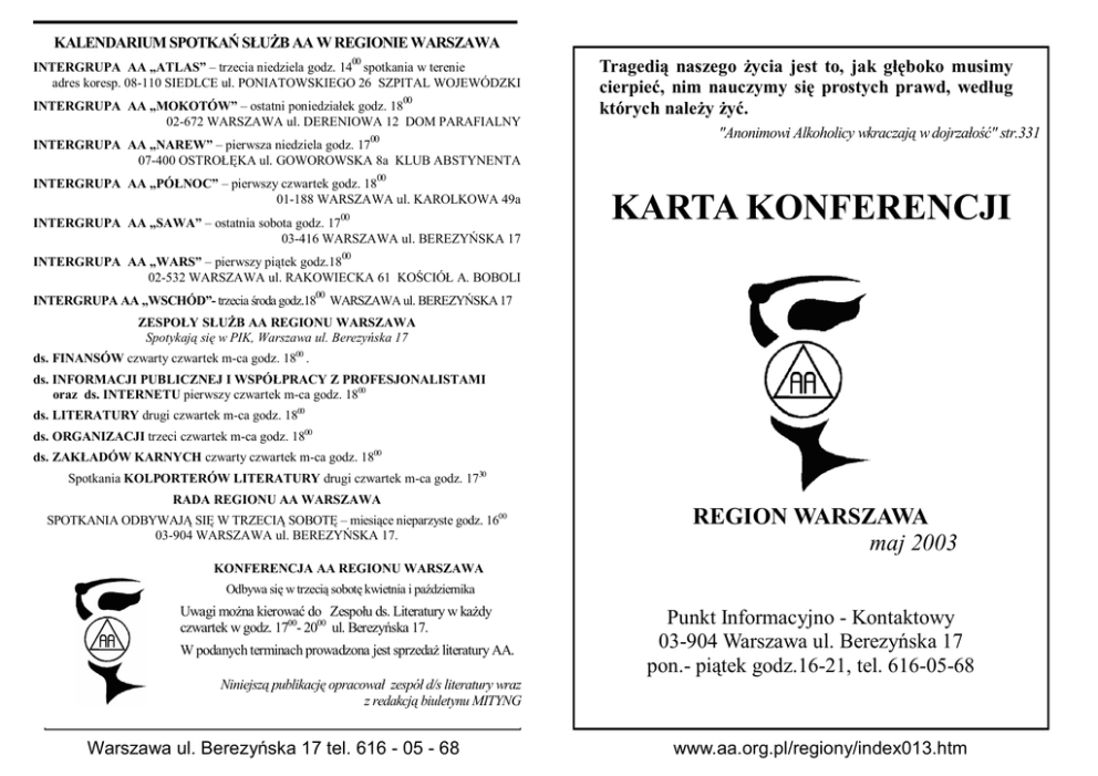 16 KALENDARIUM SPOTKAŃ SŁUŻB AA W REGIONIE WARSZAWA 00 INTERGRUPA AA „ATLAS” – trzecia niedziela godz. 14 spotkania w terenie adres koresp. 08-110 SIEDLCE ul. PONIATOWSKIEGO 26 SZPITAL WOJEWÓDZKI 00 INTERGRUPA AA „MOKOTÓW” – ostatni poniedziałek godz. 18 02-672 WARSZAWA ul. DERENIOWA 12 DOM PARAFIALNY 00 INTERGRUPA AA „NAREW” – pierwsza niedziela godz. 17 07-400 OSTROŁĘKA ul. GOWOROWSKA 8a KLUB ABSTYNENTA Tragedią naszego życia jest to, jak głęboko musimy cierpieć, nim nauczymy się prostych prawd, według których należy żyć. "Anonimowi Alkoholicy wkraczają w dojrzałość" str.331 00 INTERGRUPA AA „PÓŁNOC” – pierwszy czwartek godz. 18 01-188 WARSZAWA ul. KAROLKOWA 49a 00 INTERGRUPA AA „SAWA” – ostatnia sobota godz. 17 03-416 WARSZAWA ul. BEREZYŃSKA 17 KARTA KONFERENCJI 00 INTERGRUPA AA „WARS” – pierwszy piątek godz.18 02-532 WARSZAWA ul. RAKOWIECKA 61 KOŚCIÓŁ A. BOBOLI 00 INTERGRUPA AA „WSCHÓD”- trzecia środa godz.18 WARSZAWA ul. BEREZYŃSKA 17 ZESPOŁY SŁUŻB AA REGIONU WARSZAWA Spotykają się w PIK, Warszawa ul. Berezyńska 17 ds. FINANSÓW czwarty czwartek m-ca godz. 1800 . ds. INFORMACJI PUBLICZNEJ I WSPÓŁPRACY Z PROFESJONALISTAMI oraz ds. INTERNETU pierwszy czwartek m-ca godz. 1800 ds. LITERATURY drugi czwartek m-ca godz. 1800 ds. ORGANIZACJI trzeci czwartek m-ca godz. 1800 ds. ZAKŁADÓW KARNYCH czwarty czwartek m-ca godz. 1800 Spotkania KOLPORTERÓW LITERATURY drugi czwartek m-ca godz. 1730 RADA REGIONU AA WARSZAWA SPOTKANIA ODBYWAJĄ SIĘ W TRZECIĄ SOBOTĘ – miesiące nieparzyste godz. 1600 03-904 WARSZAWA ul. BEREZYŃSKA 17. REGION WARSZAWA maj 2003 KONFERENCJA AA REGIONU WARSZAWA Odbywa się w trzecią sobotę kwietnia i października Uwagi można kierować do Zespołu ds. Literatury w każdy czwartek w godz. 1700- 2000 ul. Berezyńska 17. W podanych terminach prowadzona jest sprzedaż literatury AA. Punkt Informacyjno - Kontaktowy 03-904 Warszawa ul. Berezyńska 17 pon.- piątek godz.16-21, tel. 616-05-68 Niniejszą publikację opracował zespół d/s literatury wraz z redakcją biuletynu MITYNG Warszawa ul. Berezyńska 17 tel. 616 - 05 - 68 www.aa.org.pl/regiony/index013.htm 2 15 WSTĘP Karta Konferencji Regionu WARSZAWA, wzorowana na Karcie Konferencji Służby Krajowej, jest zbiorem zasad i wzajemnych relacji, w oparciu o które funkcjonuje Region. Karta Konferencji to nie prawne zobowiązania, a jedynie zbiór, zalecanych do praktyki, umownych zasad i sugestii, opartych o uzyskane doświadczenia z dotychczasowej działalności. Jest to nieformalne porozumienie pomiędzy anonimowymi alkoholikami skupionymi w grupach i intergrupach, które dobrowolnie tworzą Region WARSZAWA a ich Powiernikami i Służbami, które ustanawia, jak ma wyglądać pełnienie służby w Regionie oraz sposób wyłaniania przedstawicieli na Konferencję Służby Krajowej. Tradycyjnie, choć bez konsekwencji prawnych, dwie trzecie głosów Konferencji oddane na omawiany temat, powinno być traktowane jako ustanowienie zasady, obowiązującej służby i zespoły Regionu; zwykła większość głosów może być sugestią dla nich. I. SKŁAD REGIONU Region WARSZAWA tworzą członkowie grup Wspólnoty AA dobrowolnie zrzeszeni w następujących Intergrupach: ATLAS, MOKOTÓW, NAREW, PÓŁNOC, SAWA, WARS, WSCHÓD (**). Przynależność (lub nie) intergrupy do Regionu jest jej sprawą indywidualną i dobrowolną. Następuje ona po przedstawieniu swojej woli Radzie Regionu i przyjęciu przez Konferencję. Warszawa ul. Berezyńska 17 tel. 616 - 05 - 68 Czy wiem na czym polega różnica między niesieniem posłania AA a pracą Dwunastego Kroku? Czy grupa w swojej pracy korzysta z literatury AA; czy wie, które pozycje są literaturą AA a które nie? Czy wiem jak moja grupa niesie posłanie AA? Czy może robić to lepiej, skuteczniej? Jak rozszerzyć posłanie, by objąć nim szersze grono alkoholików? 4 Kolejny ważny temat do omówienia to SPONSOROWANIE. Warto zapytać członków grupy: Czy wszyscy członkowie grupy mają sponsora? Co przeszkadza w posiadaniu sponsora? Jaka cecha charakteru? Czy wiem, że droga przebywana wspólnie z doświadczonym przewodnikiem może być bardziej skuteczna? Jak grupa może pomóc w znalezieniu sponsora? Ci, którzy mają sponsora mogą podzielić się swoim doświadczeniem, powiedzieć jakie opory w sobie przełamali i jakie to miało znaczenie dla ich trzeźwienia. Podobnie mogą wypowiedzieć się sponsorzy podkreślając, ile się nauczyli w czasie sponsorowania. 5 Czy podkreślamy znaczenie anonimowości zarówno uczestników mityngu jak i osobistą? Jak grupa dba o swój wizerunek w oczach ludzi spoza AA? 6 Niektórzy członkowie grupy biorą udział w pracach intergrupy, regionu. czy służby krajowej. Czy grupa jest zainteresowana informacjami z tych środowisk, czy tylko "skazana " na mielenie własnych spraw? Czy czuje się członkiem większej całości? Jak to się przejawia w realizacji 7 Tradycji? Czy zdaję sobie sprawę, że wyraźnym przejawem naszego przebudzenia duchowego jest wzrastająca odpowiedzialność, będąca wynikiem pogłębiającej się świadomości czym jest wspólnota AA i jej zasady? Jak przebiega współpraca a nie łączenie się? 7 Zdarza się, że gwałtownie spada obecność na naszych mityngach, mniej członków grupy angażuje się w prace przygotowania mityngu. Czy grupa potrafi sobie poradzić z trudnościami? Czy wykorzystuje doświadczenie długoletnich członków AA? Jak grupa realizuje Program AA we wszystkich Legatach: JEDNOŚCI, SŁUŻBY i ZDROWIENIA? Prawie każdy problem w grupie ma swoje rozwiązanie, do którego można dojść poprzez odnajdywanie sumienia grupy, zrezygnowanie w dyskusjach z pozycji "krwawiącego diakona". Humor, wyciszenie, cierpliwość, uprzejmość, gotowość do wysłuchania i czekania, poczucie sprawiedliwości i ufności w "Siłę Większą od nas samych" są skuteczniejsze niż argumenty prawne lub osobiste. WIECEJ INFORM